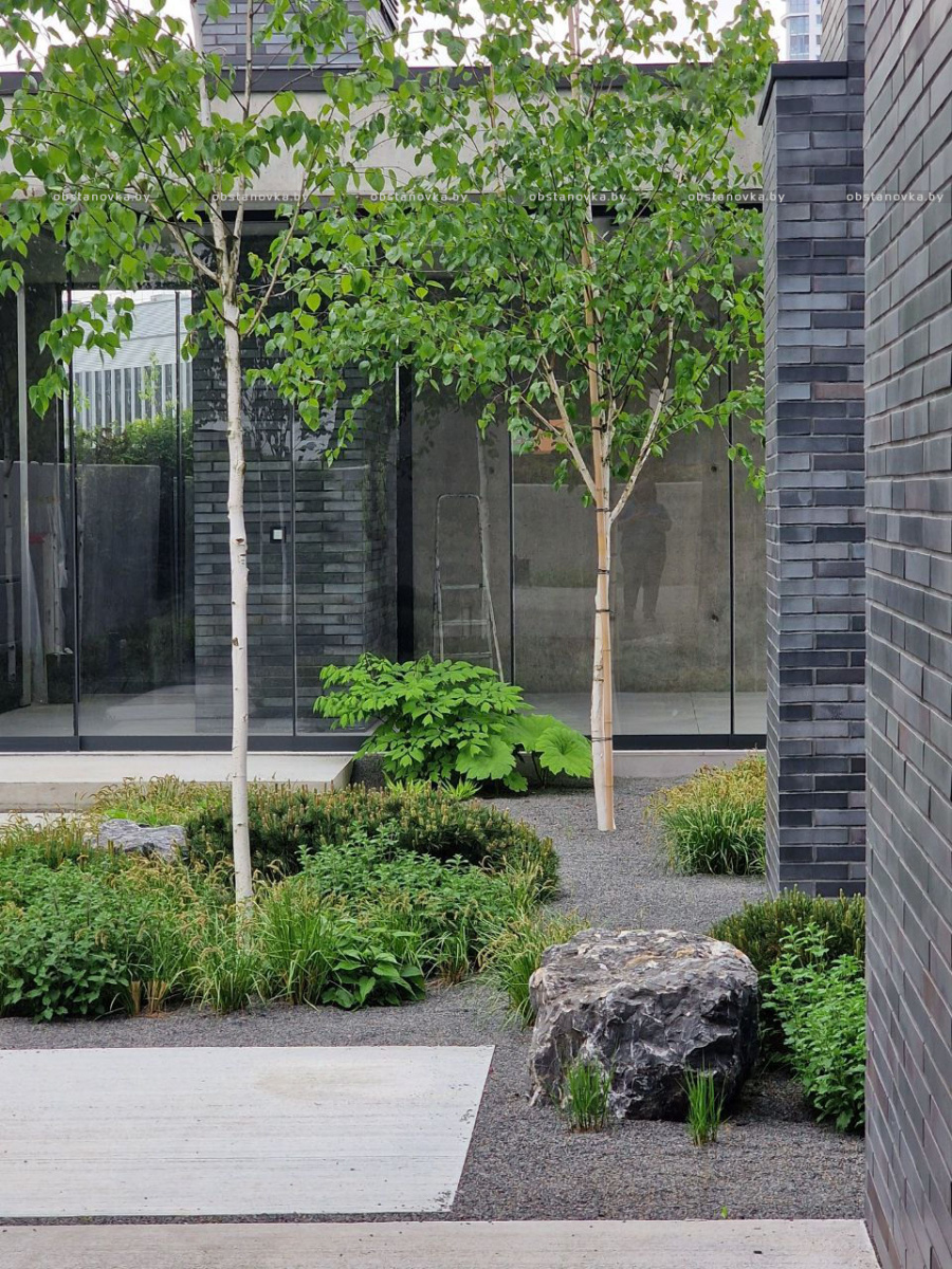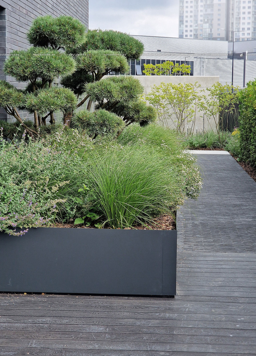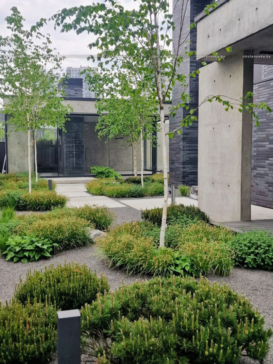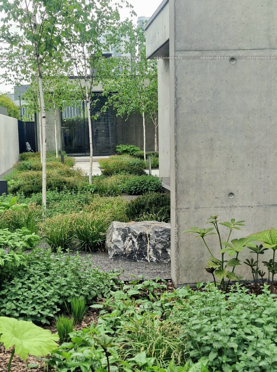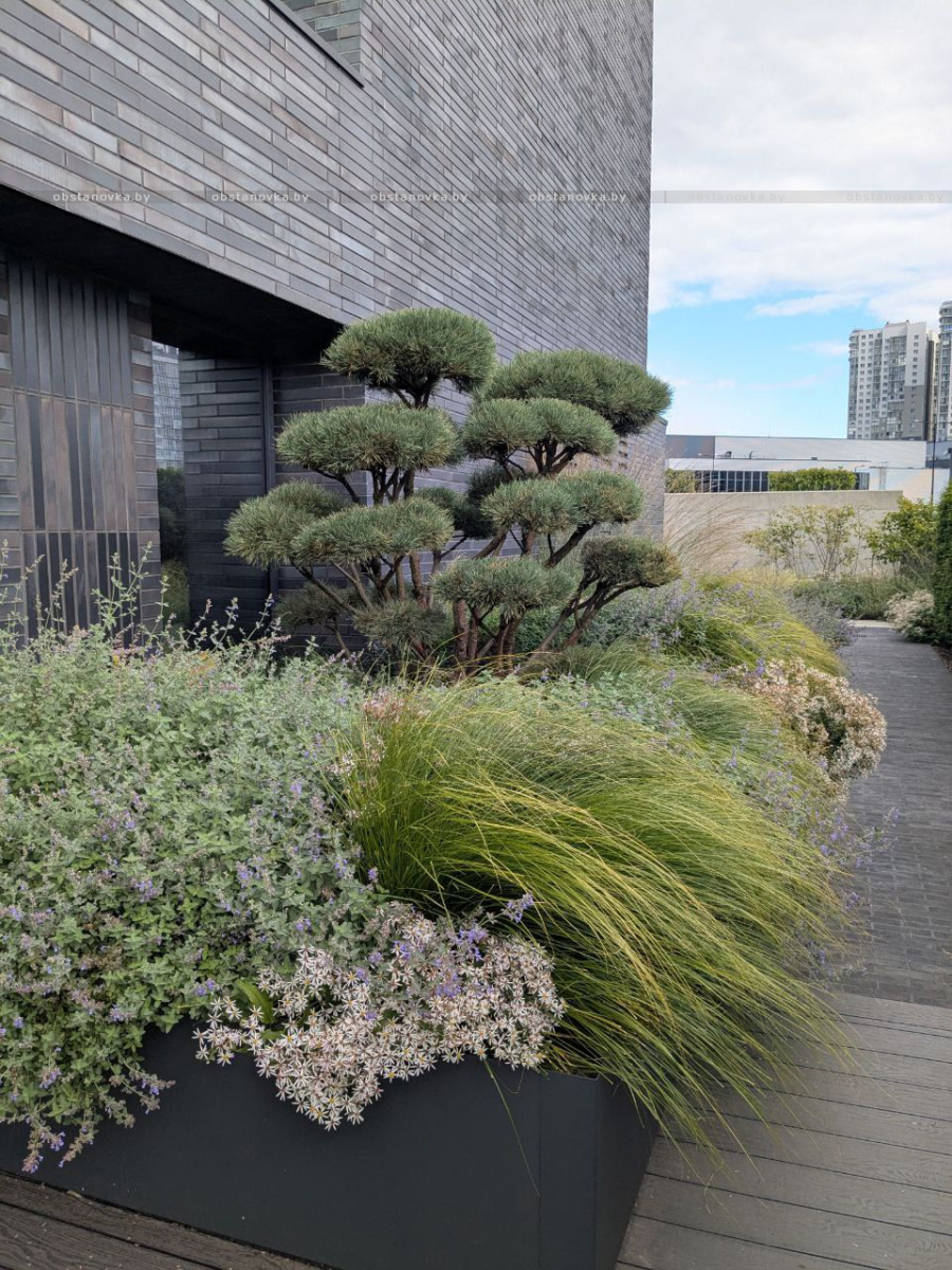 Перед нами стояла очень сложная задача — сделать уютный сад среди бетона и стекла, чтобы из окна наши заказчики не видели чужую жизнь, а могли рассматривать красивые деревья, травы и вдыхать аромат цветов.