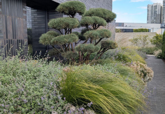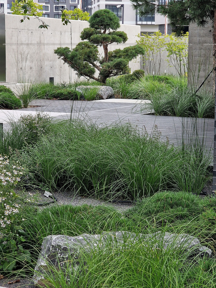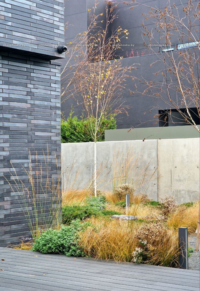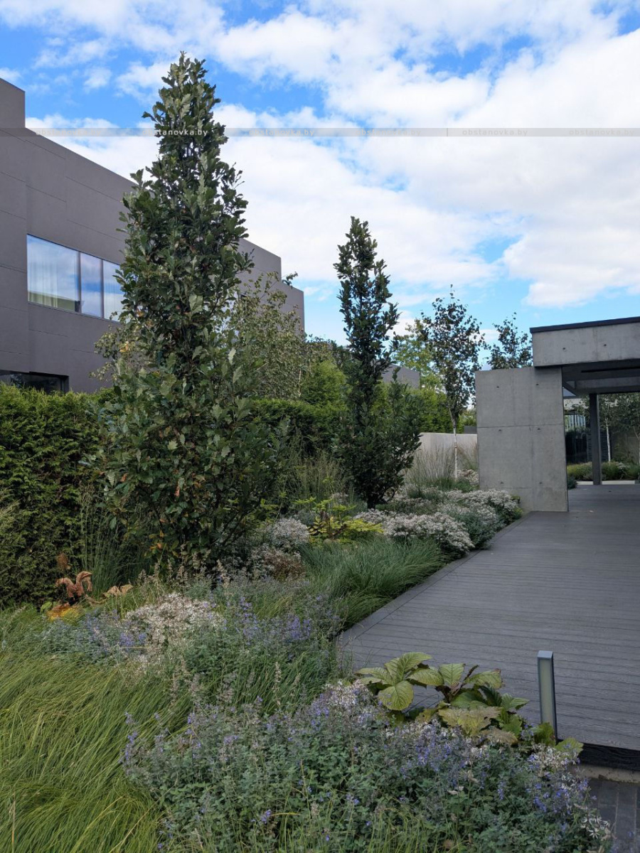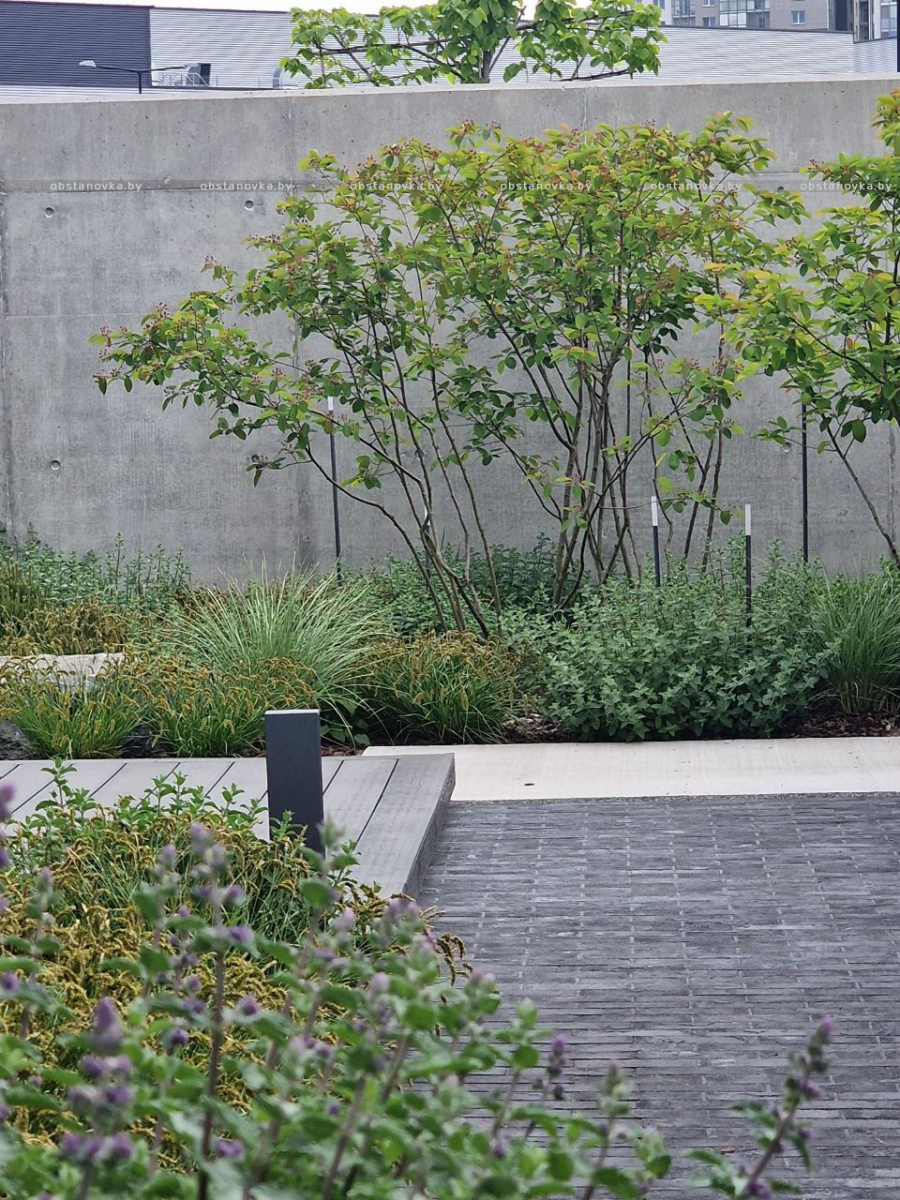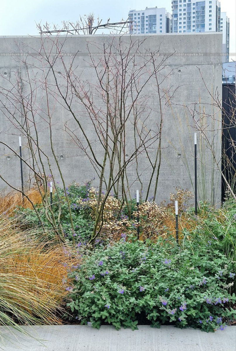 Перед нами стояла очень сложная задача — сделать уютный сад среди бетона и стекла, чтобы из окна наши заказчики не видели чужую жизнь, а могли рассматривать красивые деревья, травы и вдыхать аромат цветов.