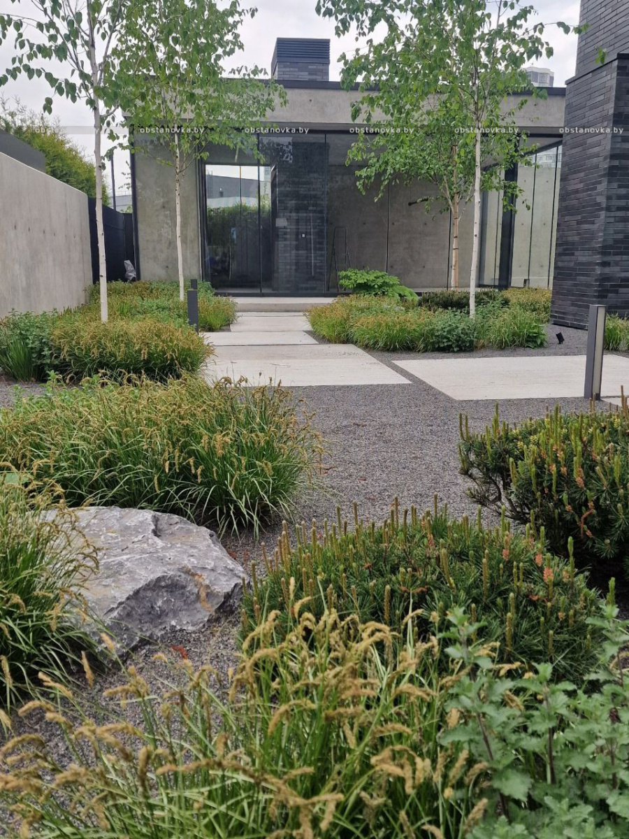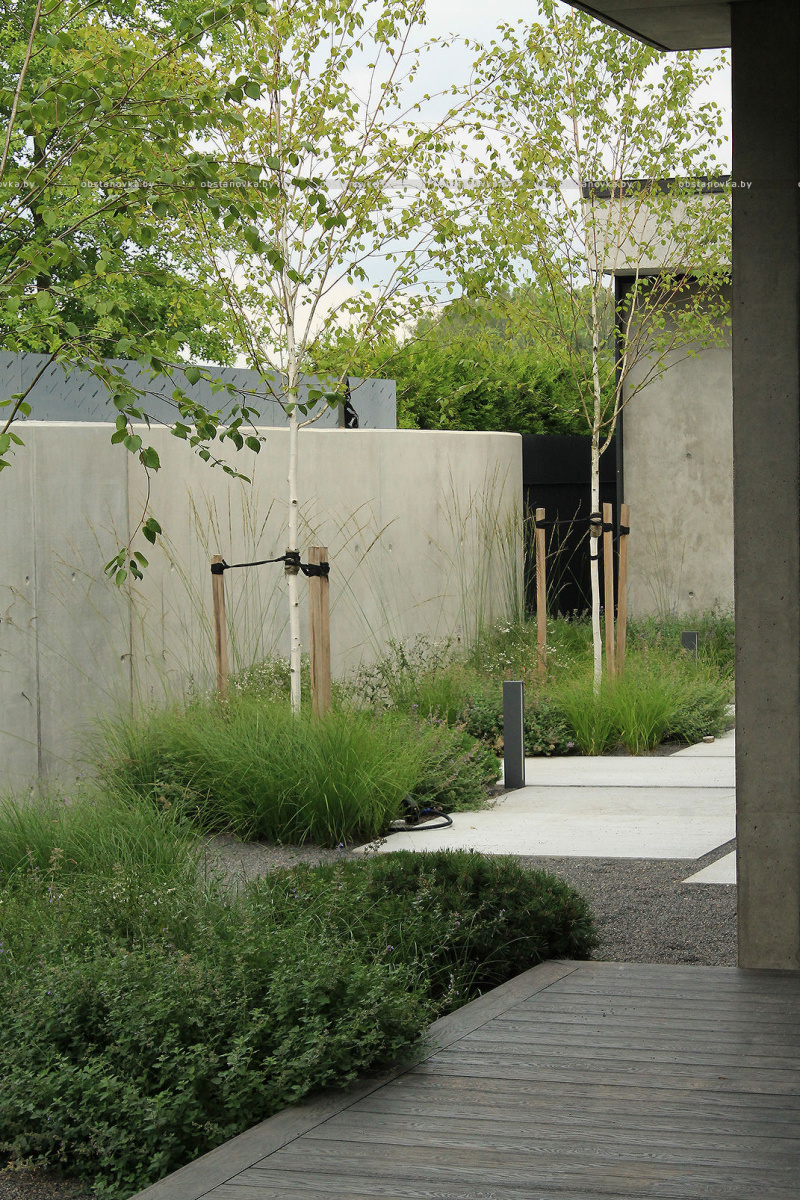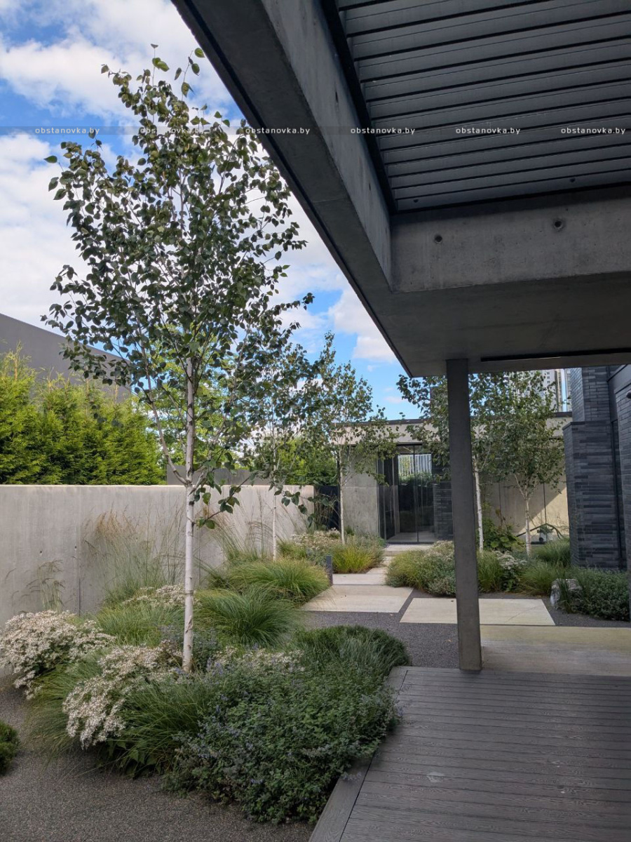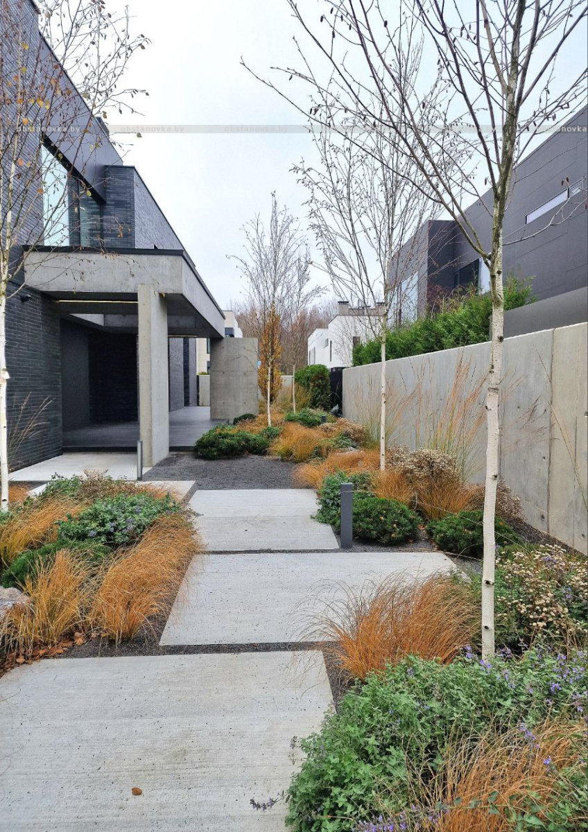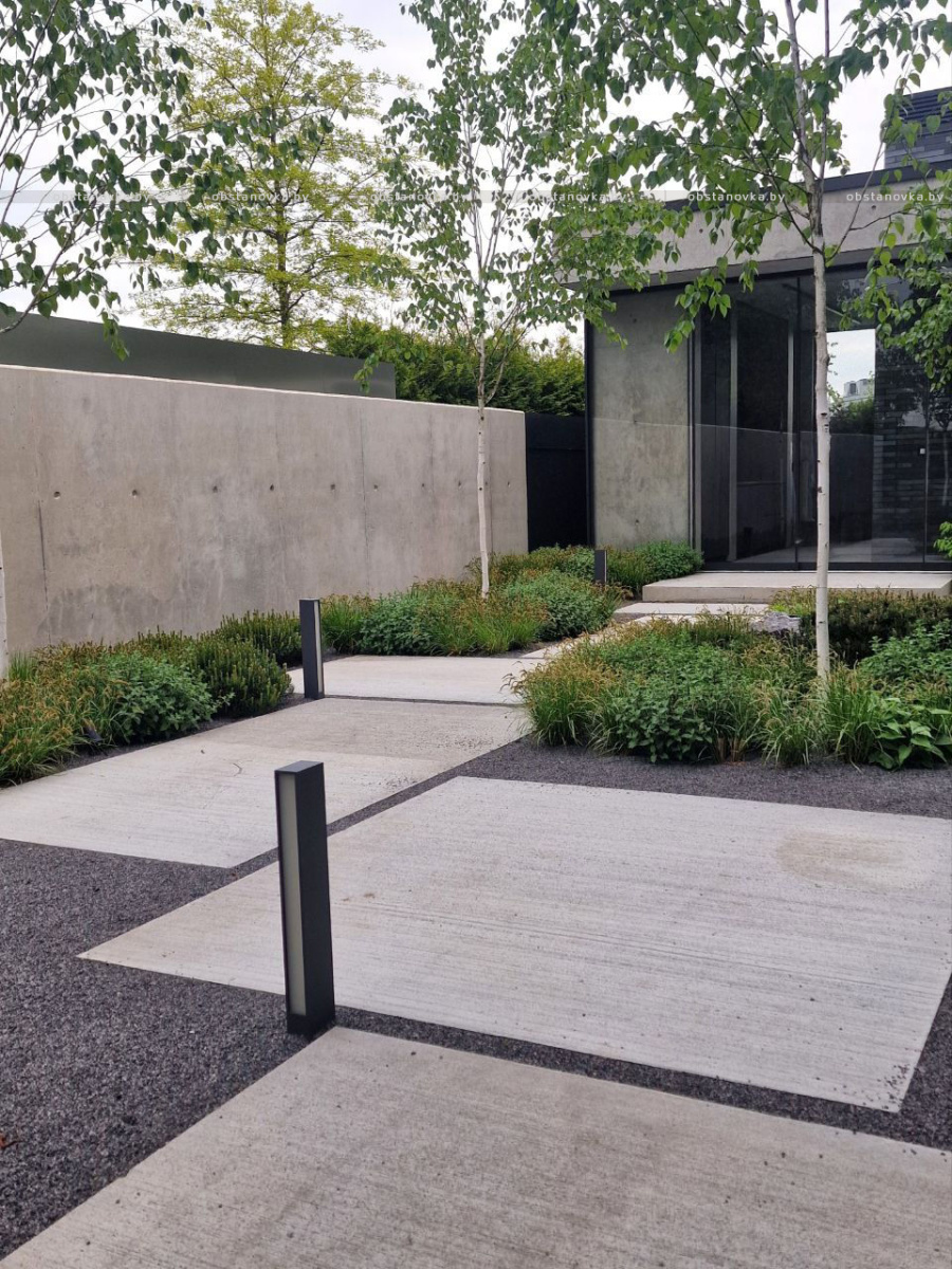 Наши бетонные плиты — это графика оконных проёмов. Материал плит повторяет материал отделки дома и заборов. На фоне холодного бетонного забора тонкие берёзы выглядят особенно изящно и хрупко.