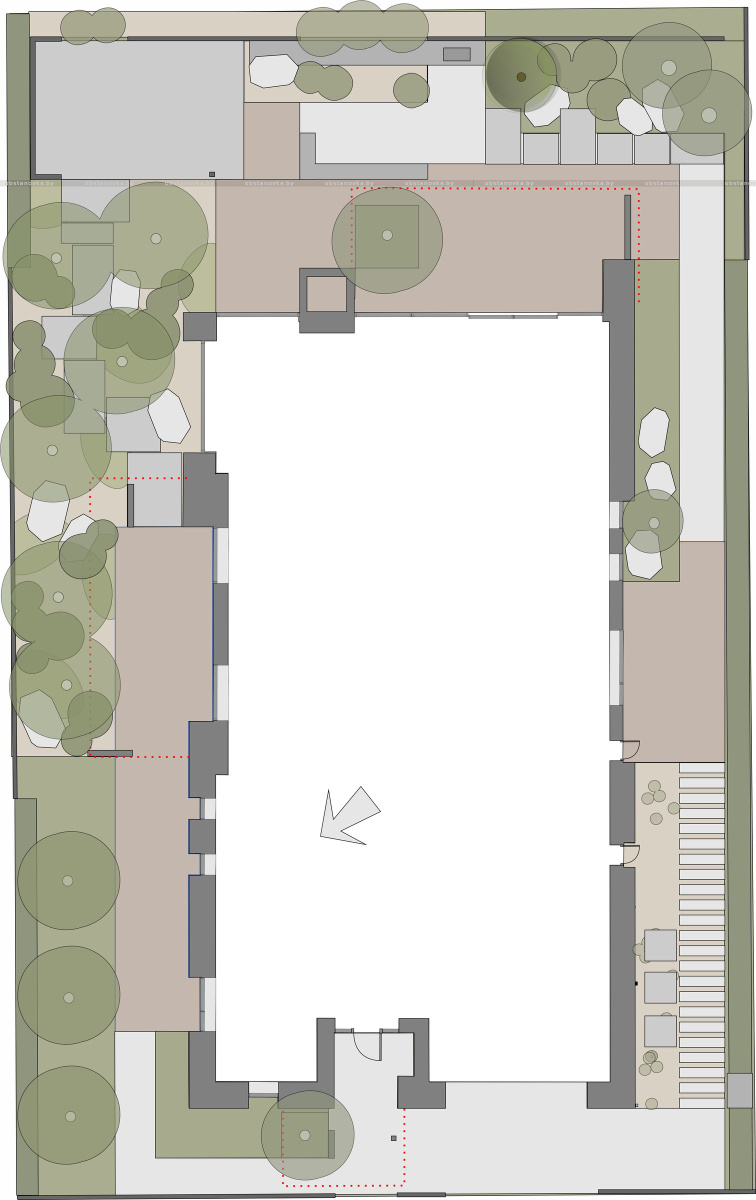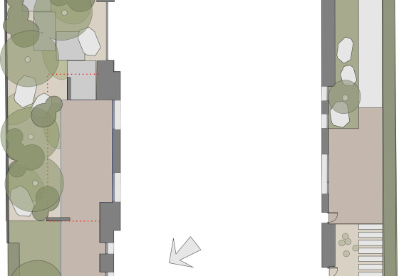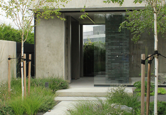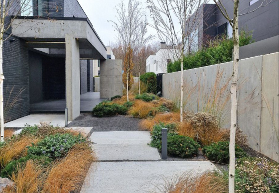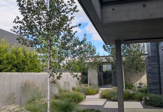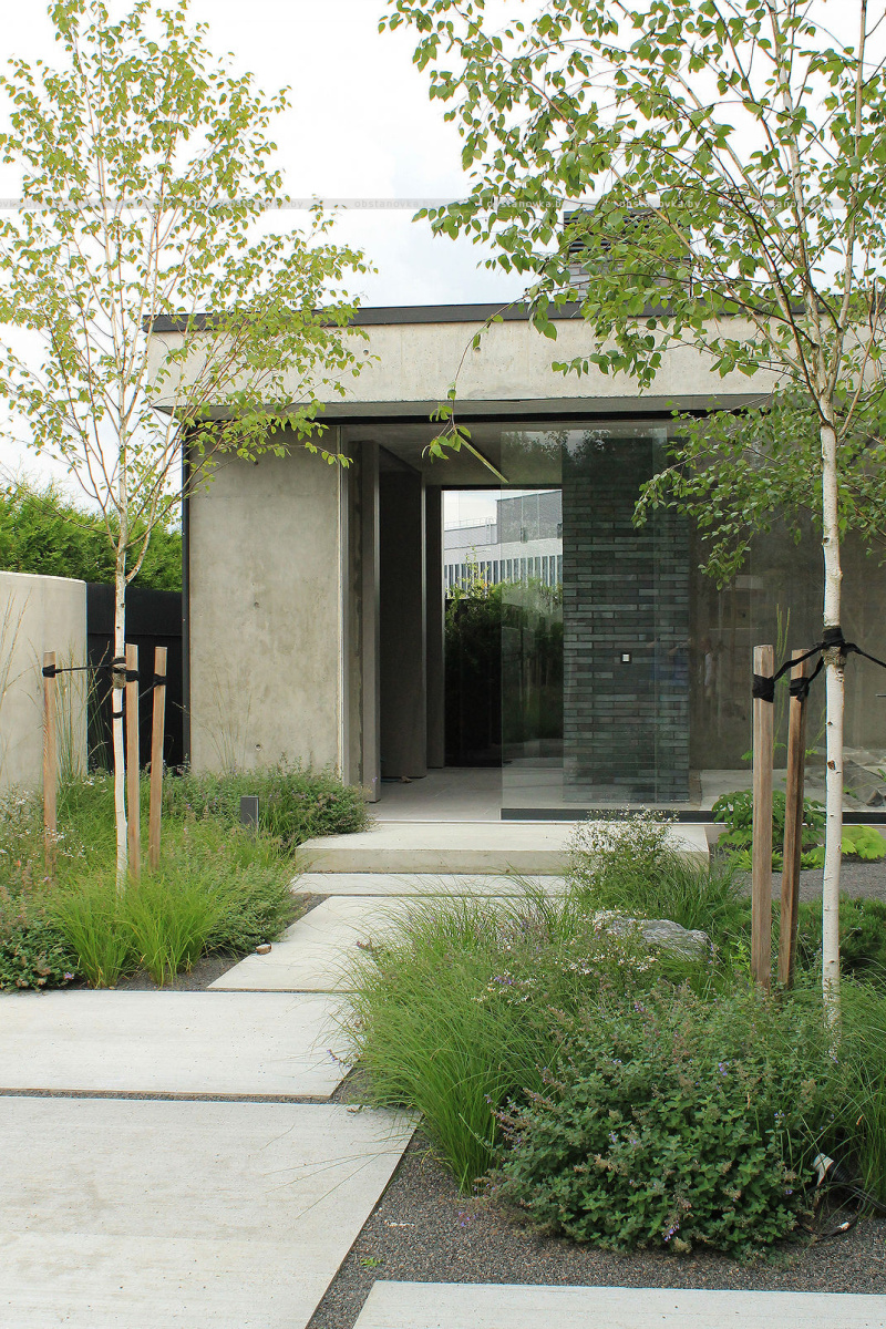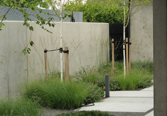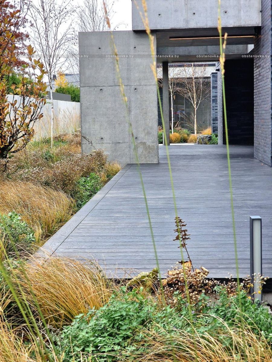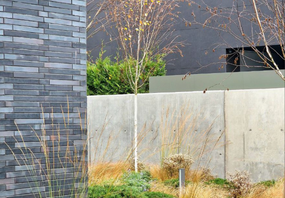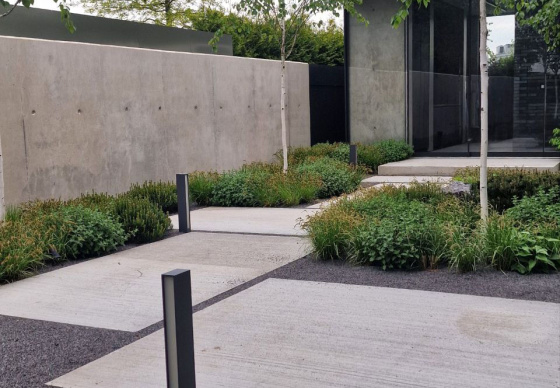 Наши бетонные плиты — это графика оконных проёмов. Материал плит повторяет материал отделки дома и заборов. На фоне холодного бетонного забора тонкие берёзы выглядят особенно изящно и хрупко.
