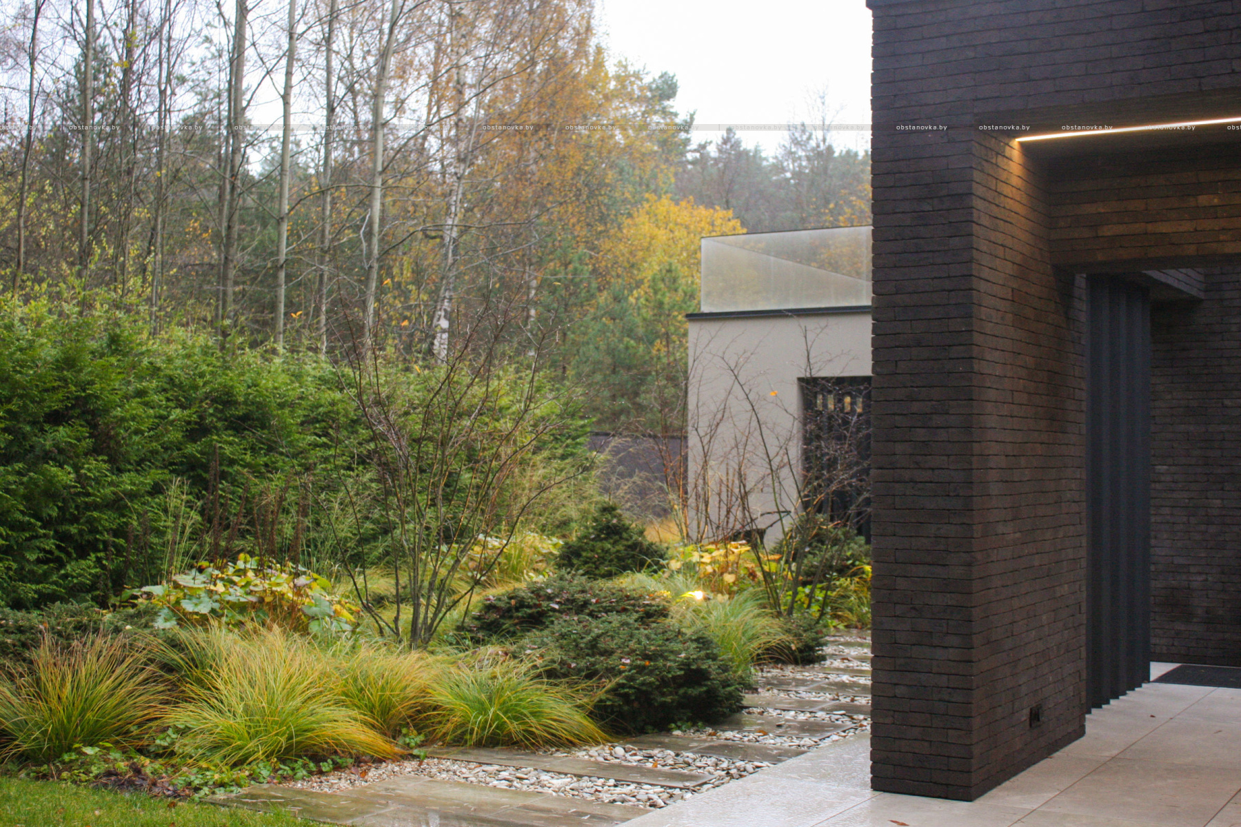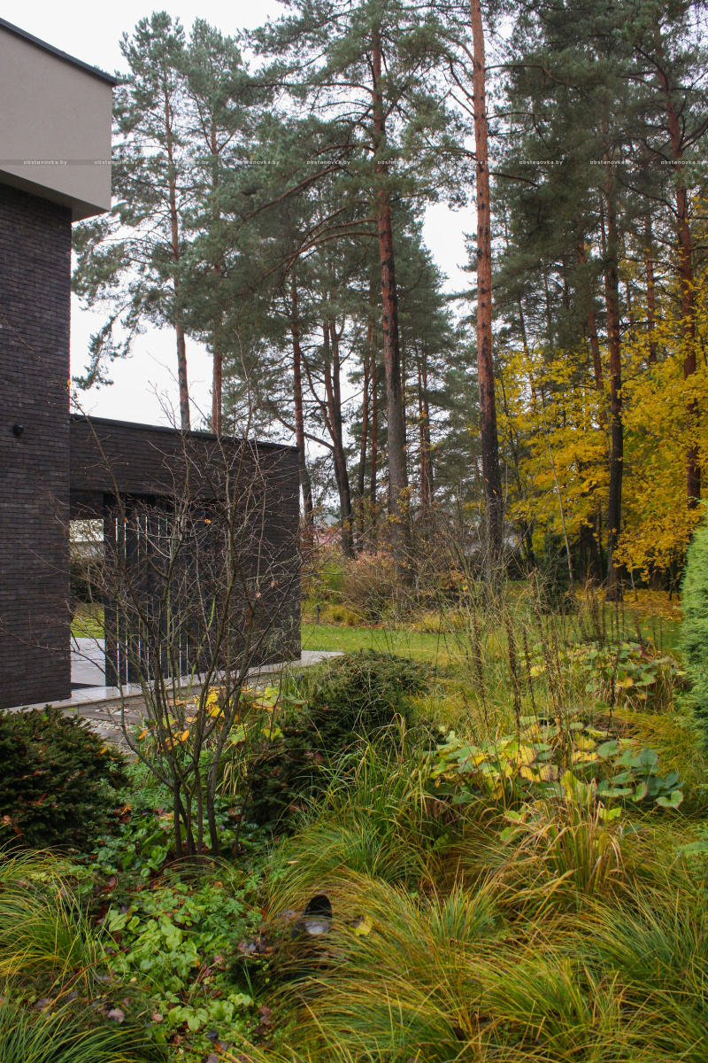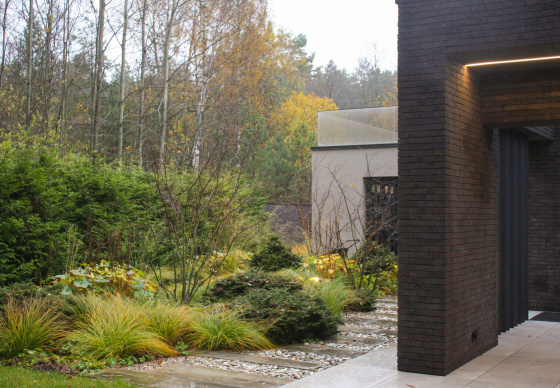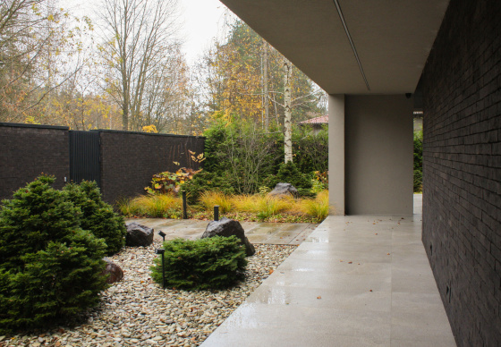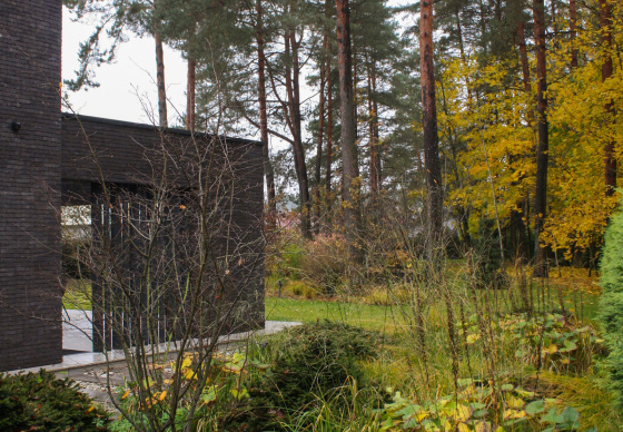 Участок располагается на окраине посёлка и примыкает к лесу, и это сподвигло продолжить природный контекст на участке, растворить границы и сохранить умиротворение окружения. Чёткий, понятный дизайн всех элементов родился и на основе самого характера хозяев, где чувствуются строгость, понимание собственных границ, целеустремлённость на пару с трепетом человеческой души.