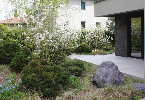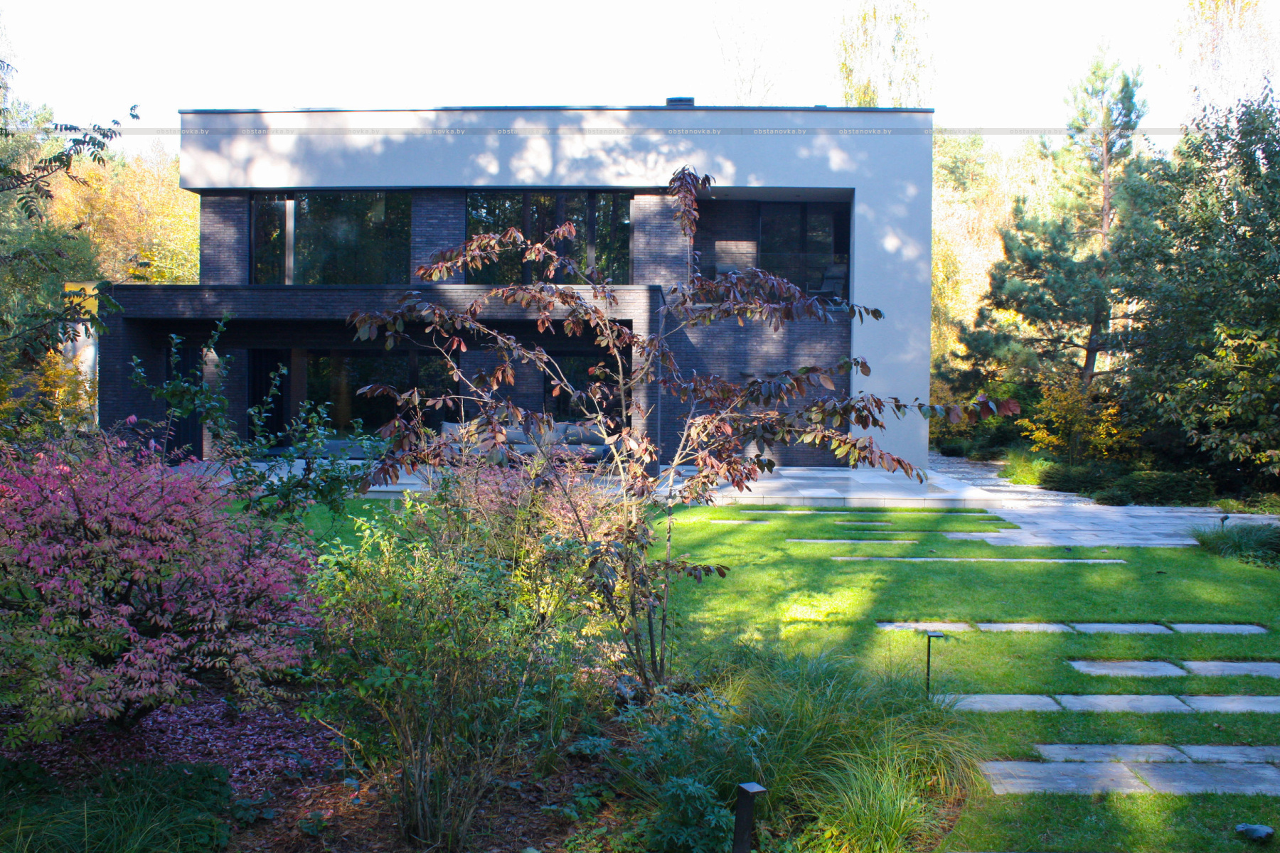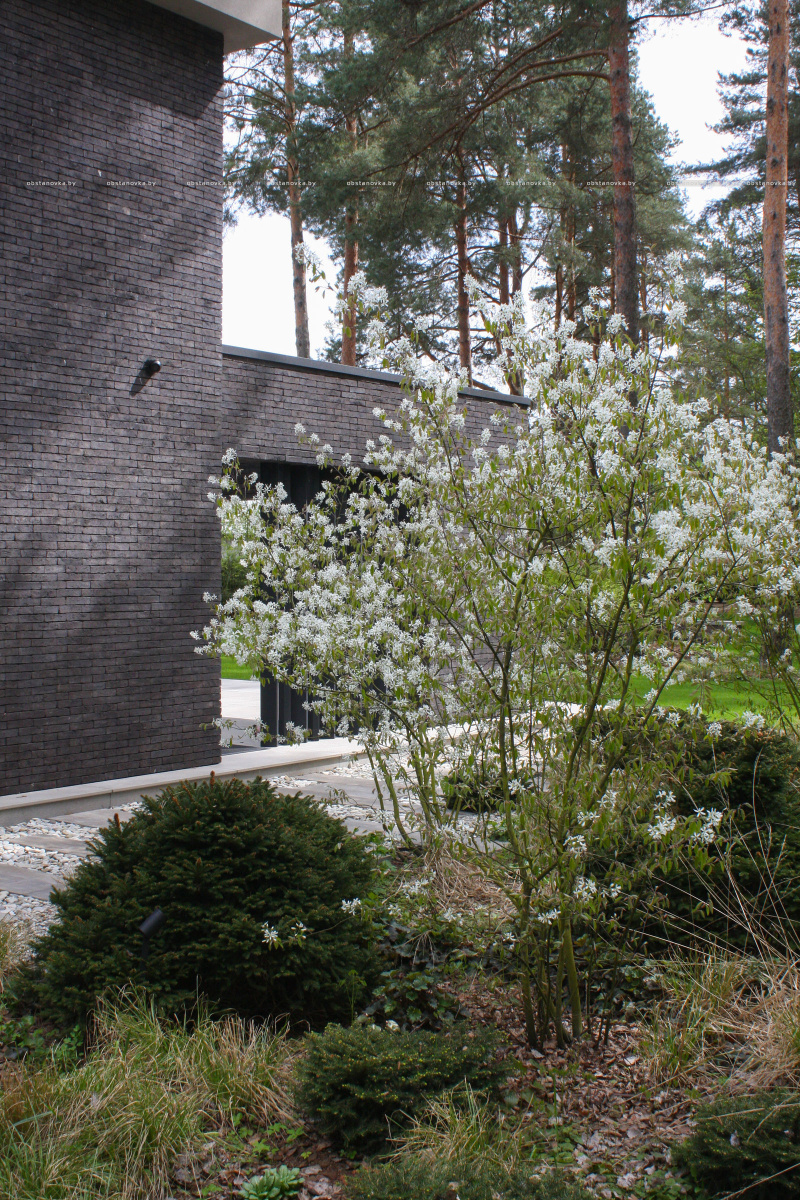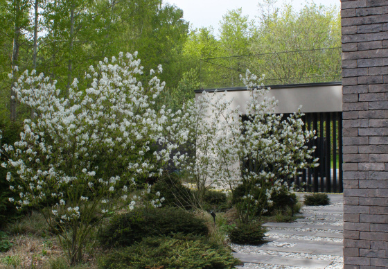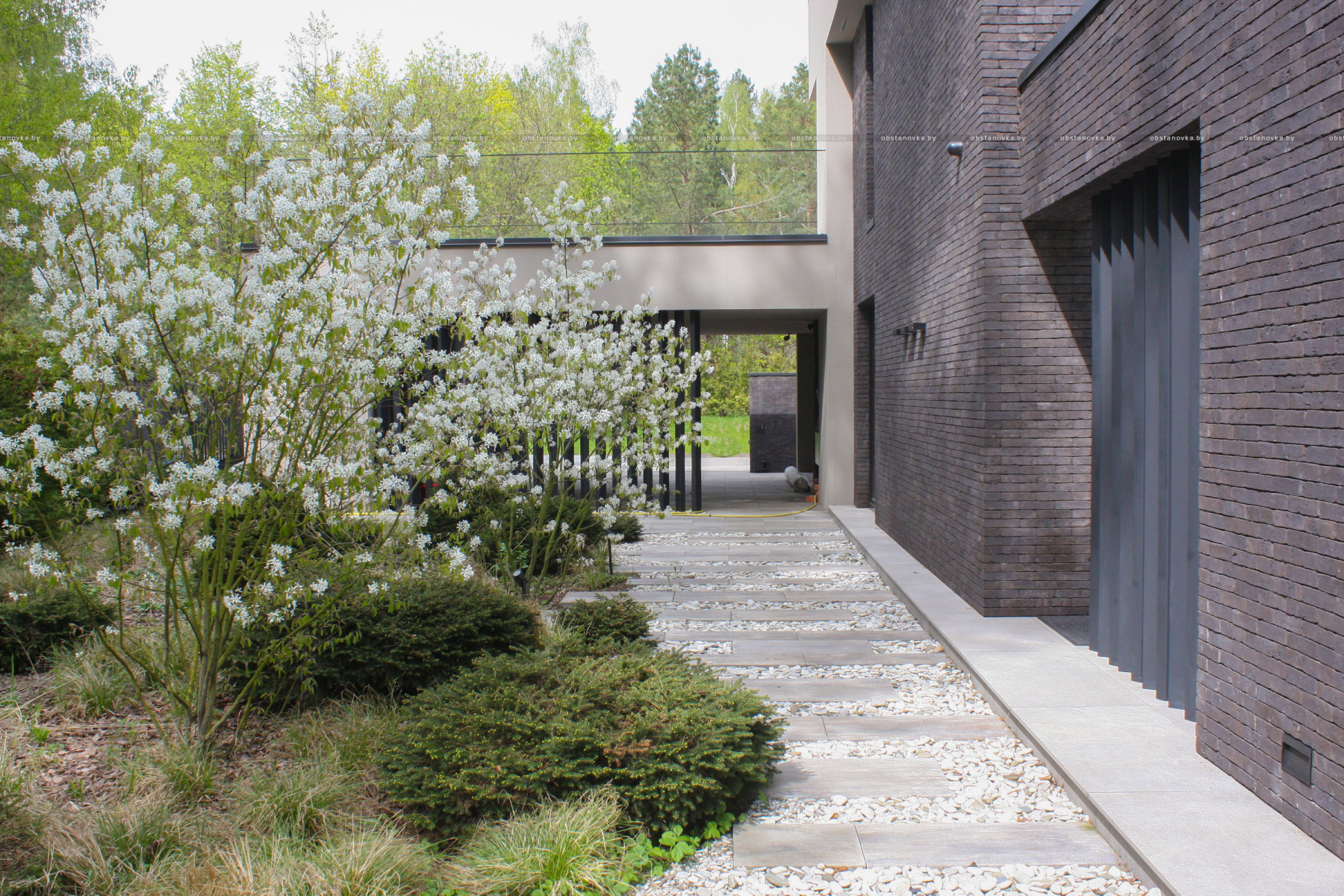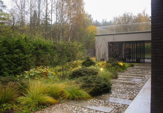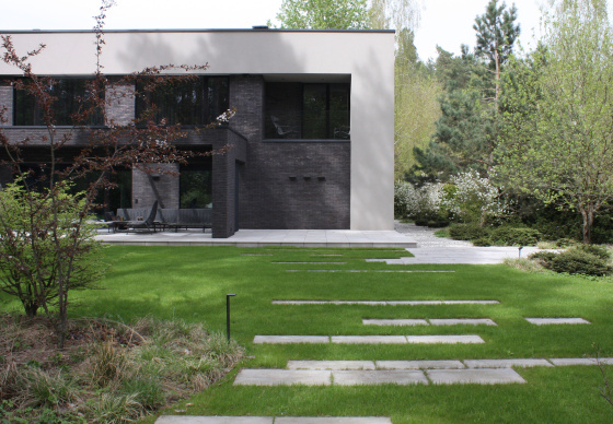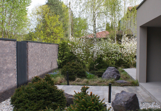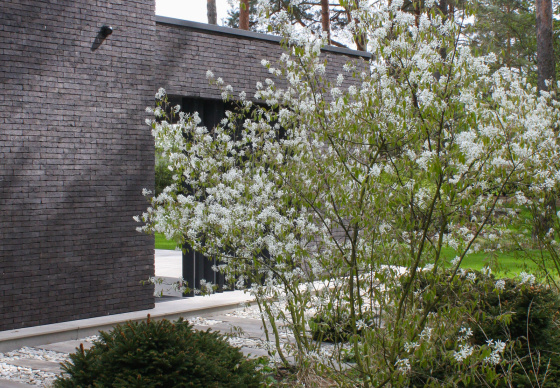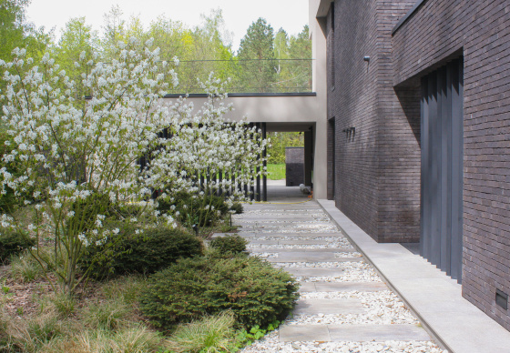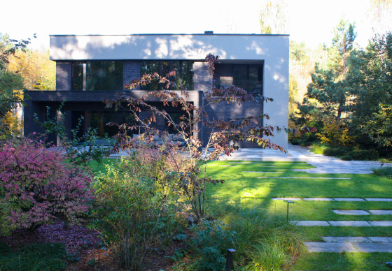 Посредством дизайна были соблюдены растительные пожелания — в минимальном наборе цвета и ассортимента, при этом удалось окутать дом зеленью на весь сезон. В течение года лишь несколько раз вспыхивают цветовые пятна весенних эфемероидов, а осенью загорается бересклет — всего на неделю.