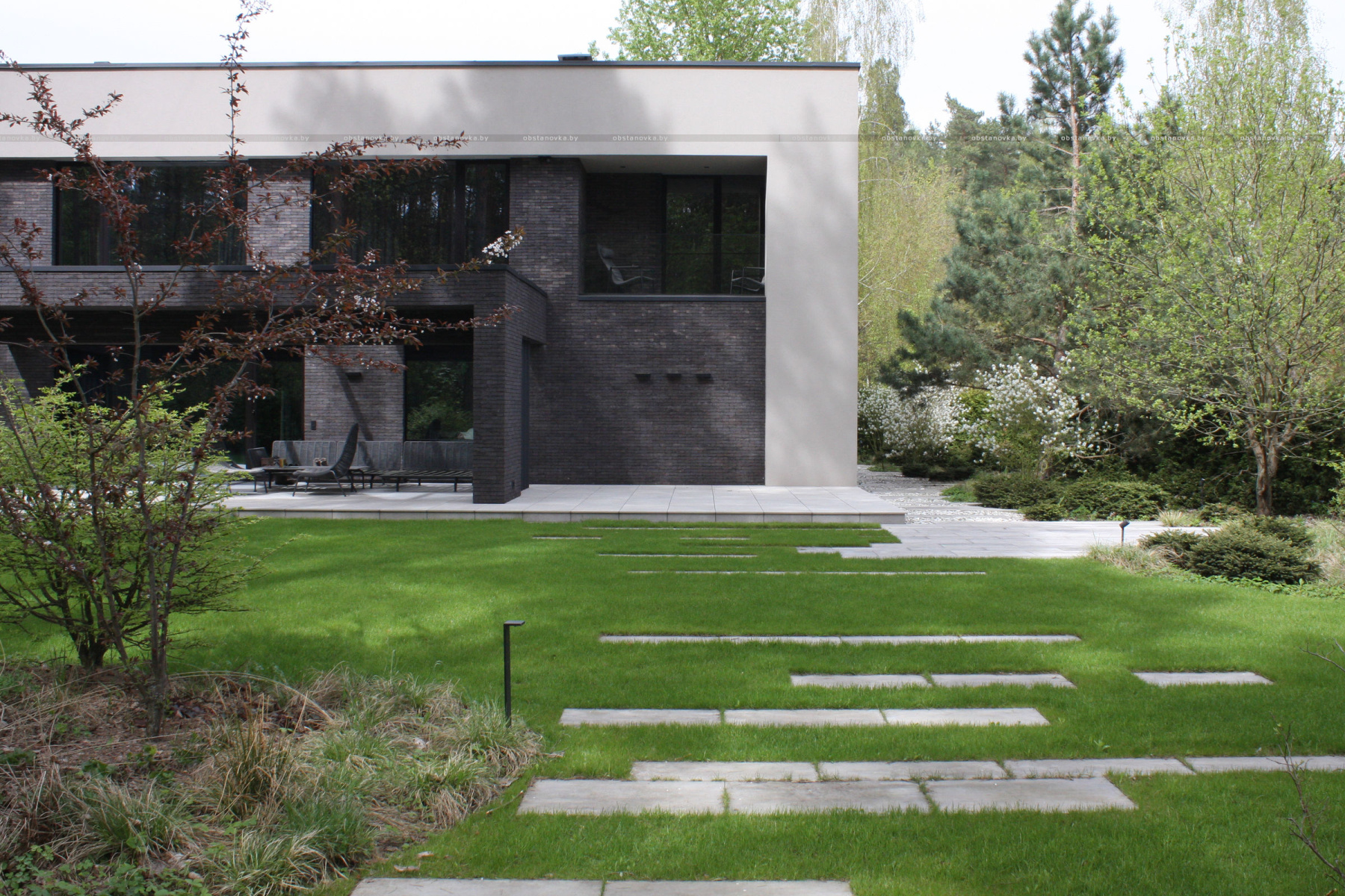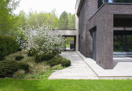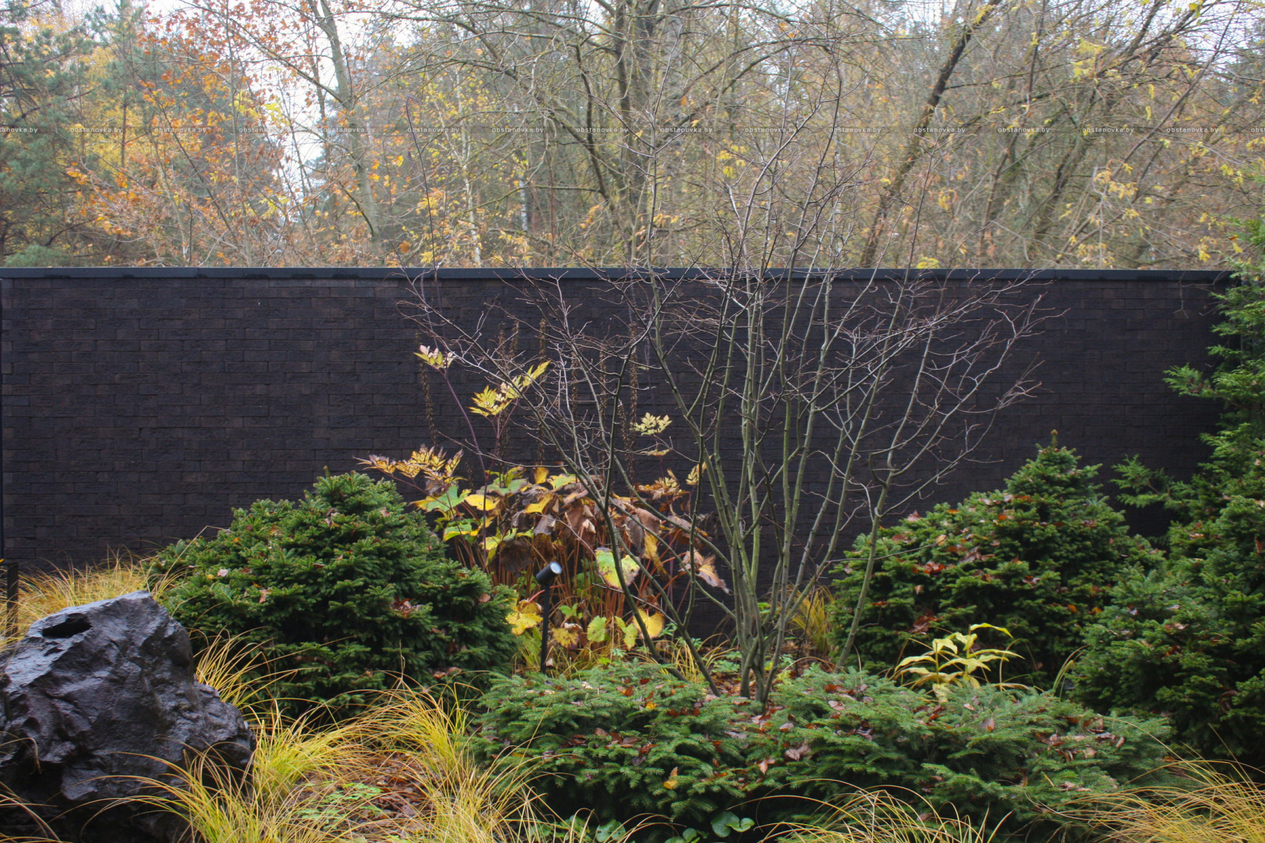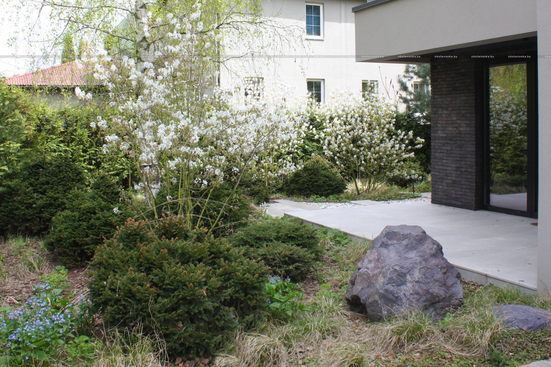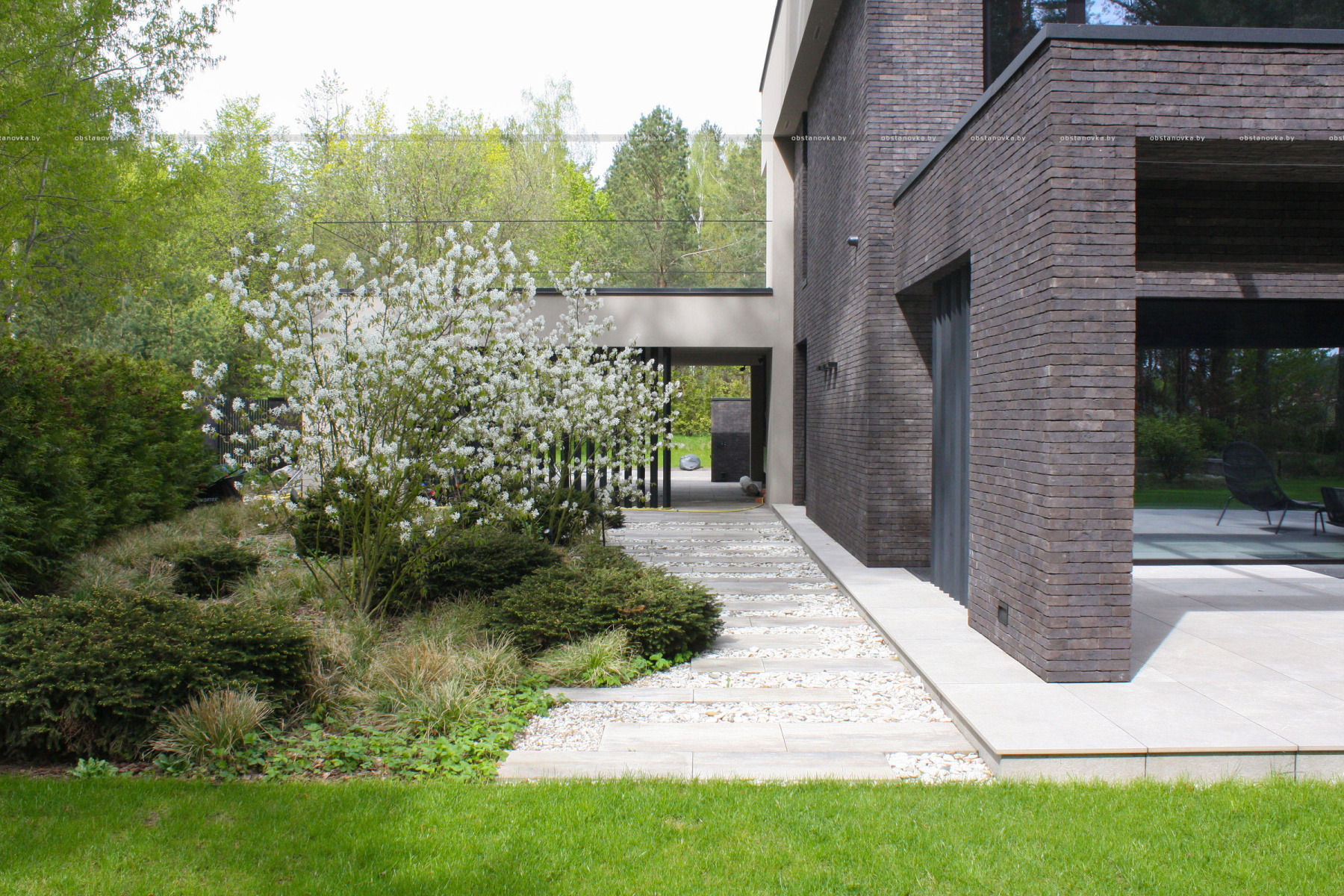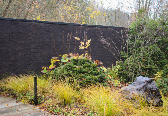 Посредством дизайна были соблюдены растительные пожелания — в минимальном наборе цвета и ассортимента, при этом удалось окутать дом зеленью на весь сезон. В течение года лишь несколько раз вспыхивают цветовые пятна весенних эфемероидов, а осенью загорается бересклет — всего на неделю.