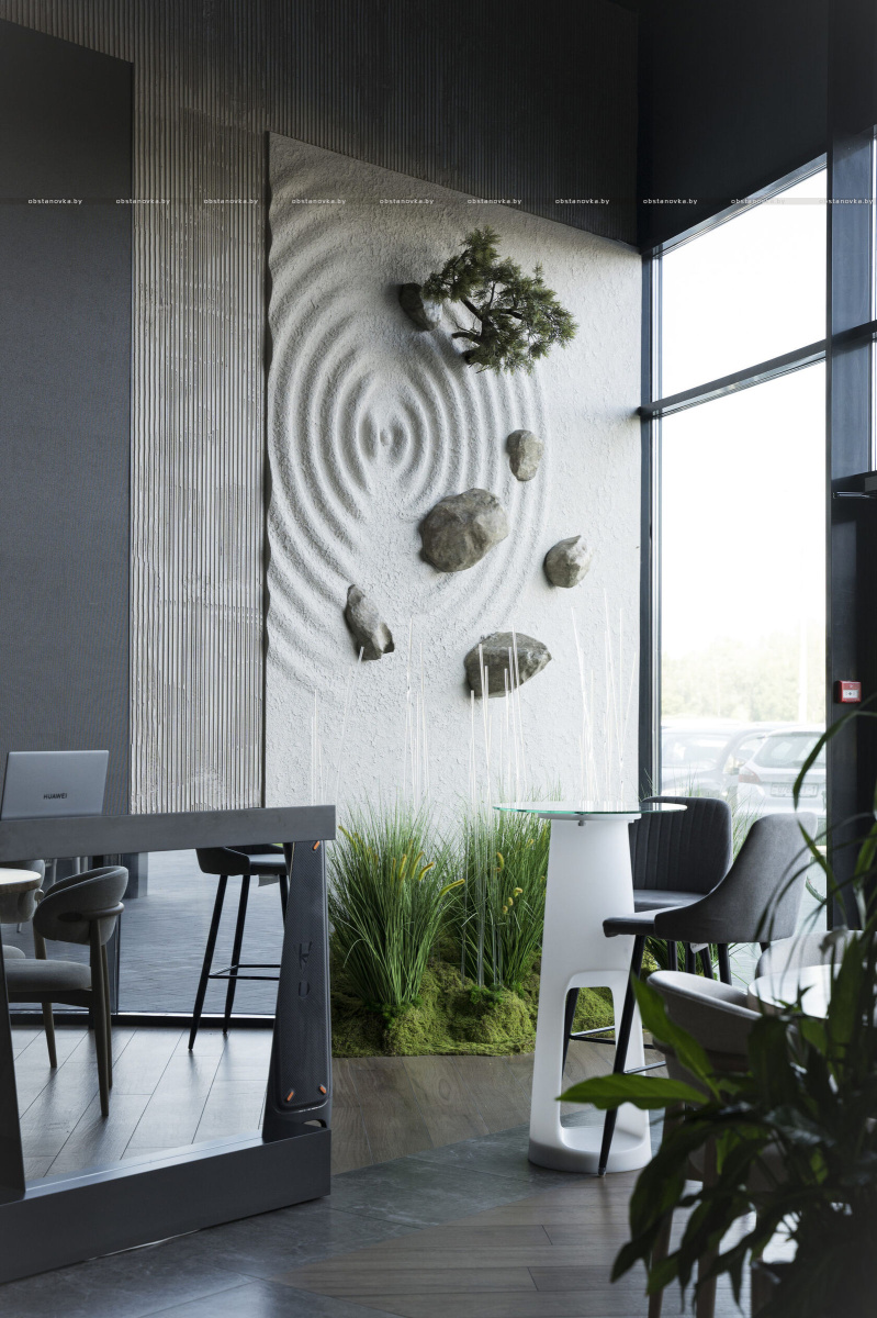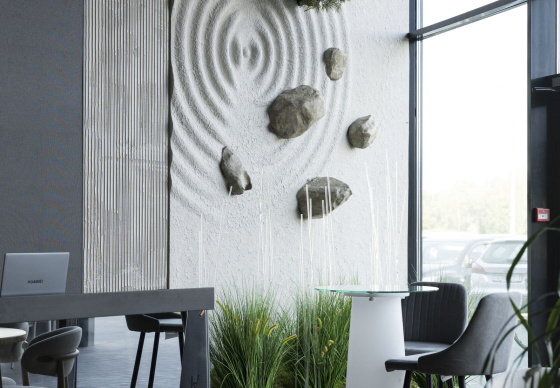 Сад камней, перевернутый в вертикальную плоскость, использован для создания уникального дизайна интерьера, который будет привлекать внимание посетителей сменой привычной плоскости восприятия. Этот элемент заставит задуматься о красоте привычных нам вещей, даже если есть проблема - мы можем повернуть её таким образом, чтобы нам было спокойно на душе и это принесло только положительные результаты для нашей последующей жизни.