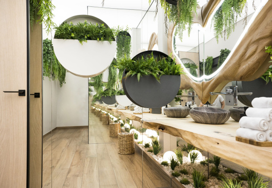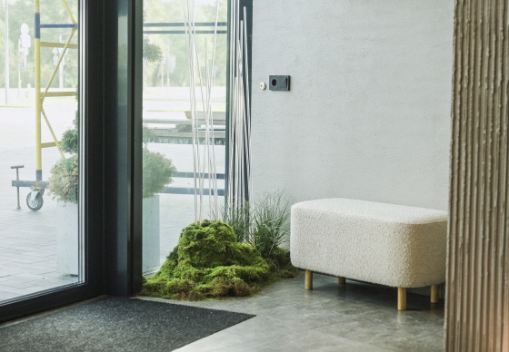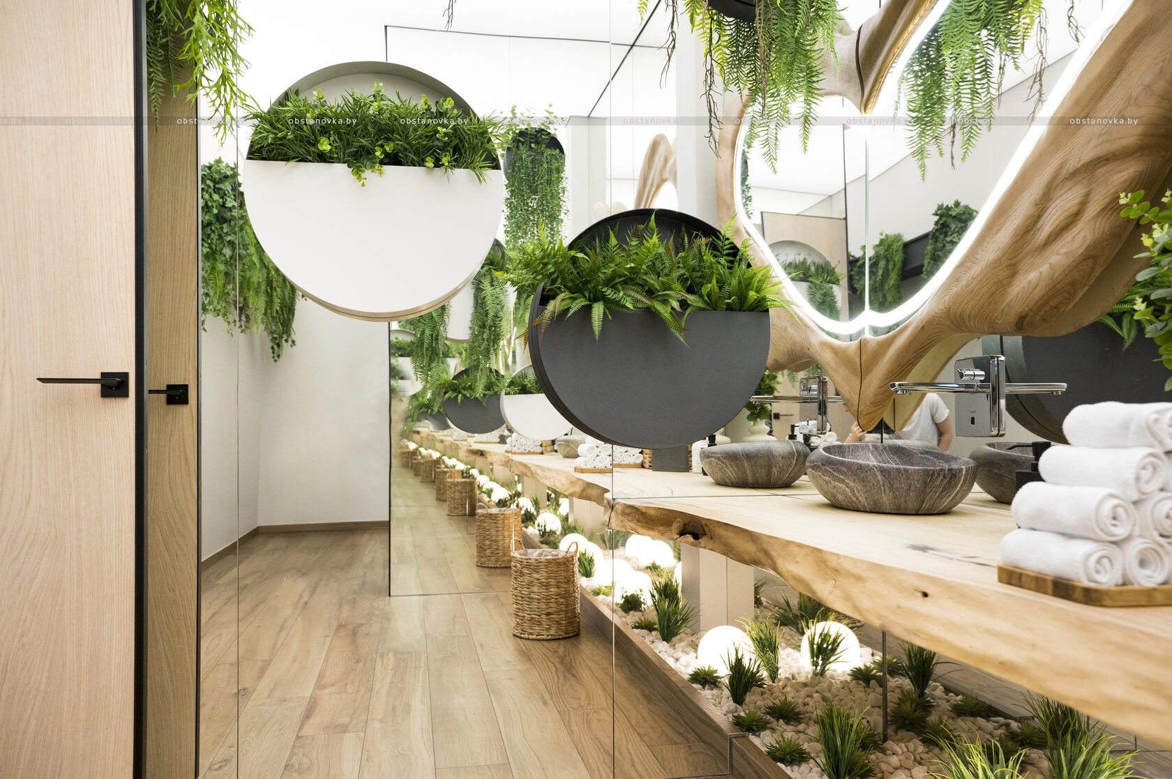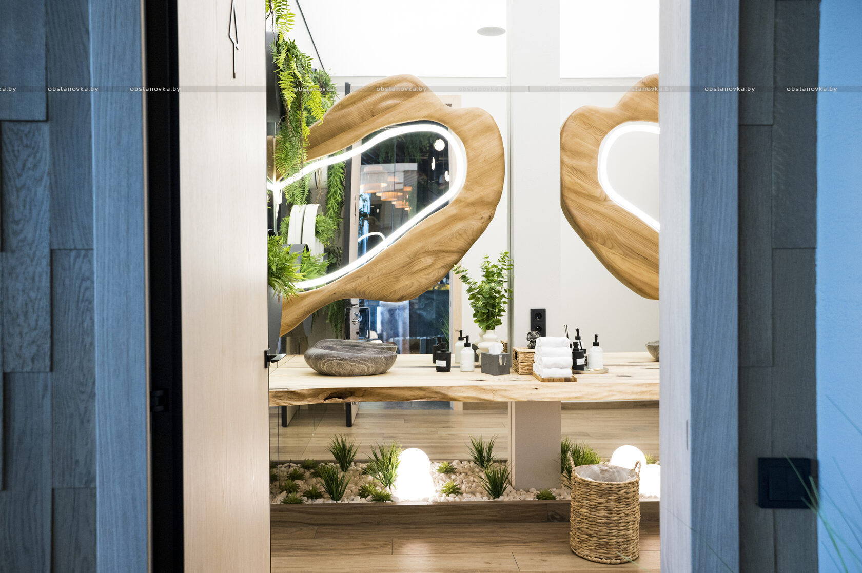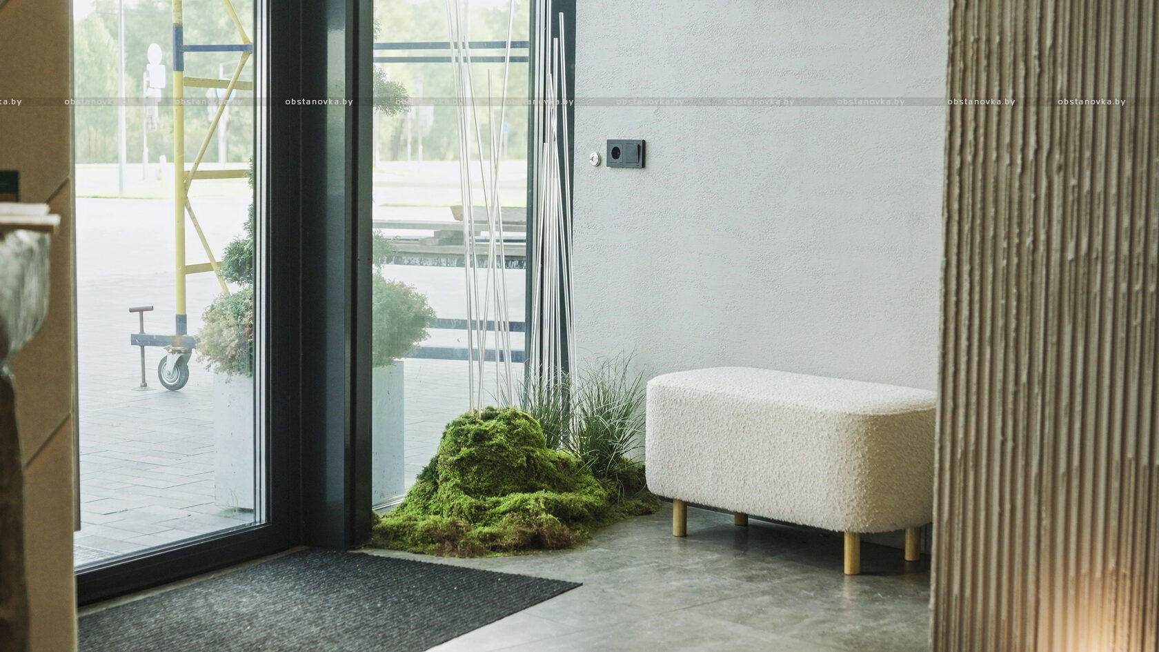 Стойка администратора в виде композиции камней символизирует естественность и простоту, которые являются основными принципами экологического стиля.