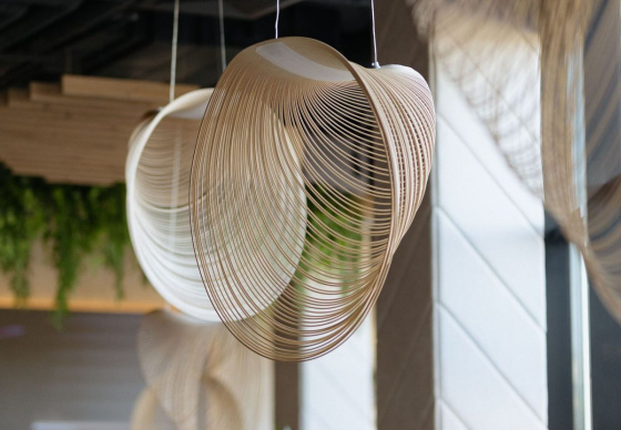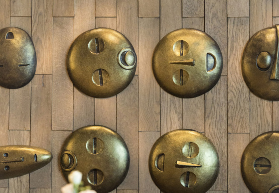 Фрезерованные панели создают рефлексию света на масках, напоминая нам о том, что в разном окружении мы можем стать совершенно разными людьми. Подвесные светильники разных уровней символизируют социальную значимость каждой единицы человека: вне зависимости от величины капитала или запаса здоровья, каждый человек должен приносить свет и пользу людям.