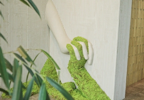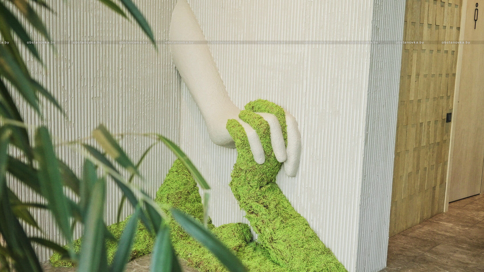 Ландшафтная композиция с мхом и скульптурой из двух рук, касающихся друг друга, символизирует единство и взаимодействие разных элементов. Бетонная рука и рука, покрытая мхом, представляют собой два разных элемента, которые, несмотря на свою разность, взаимодействуют друг с другом.