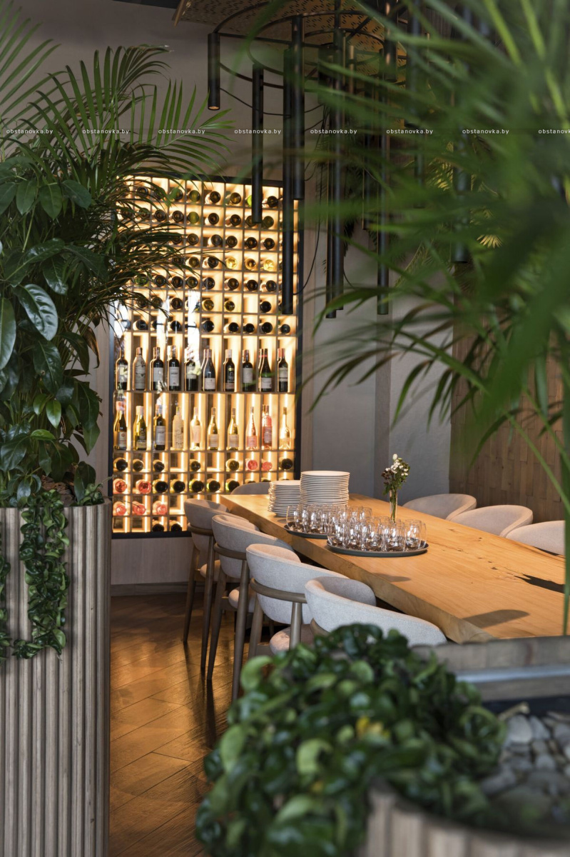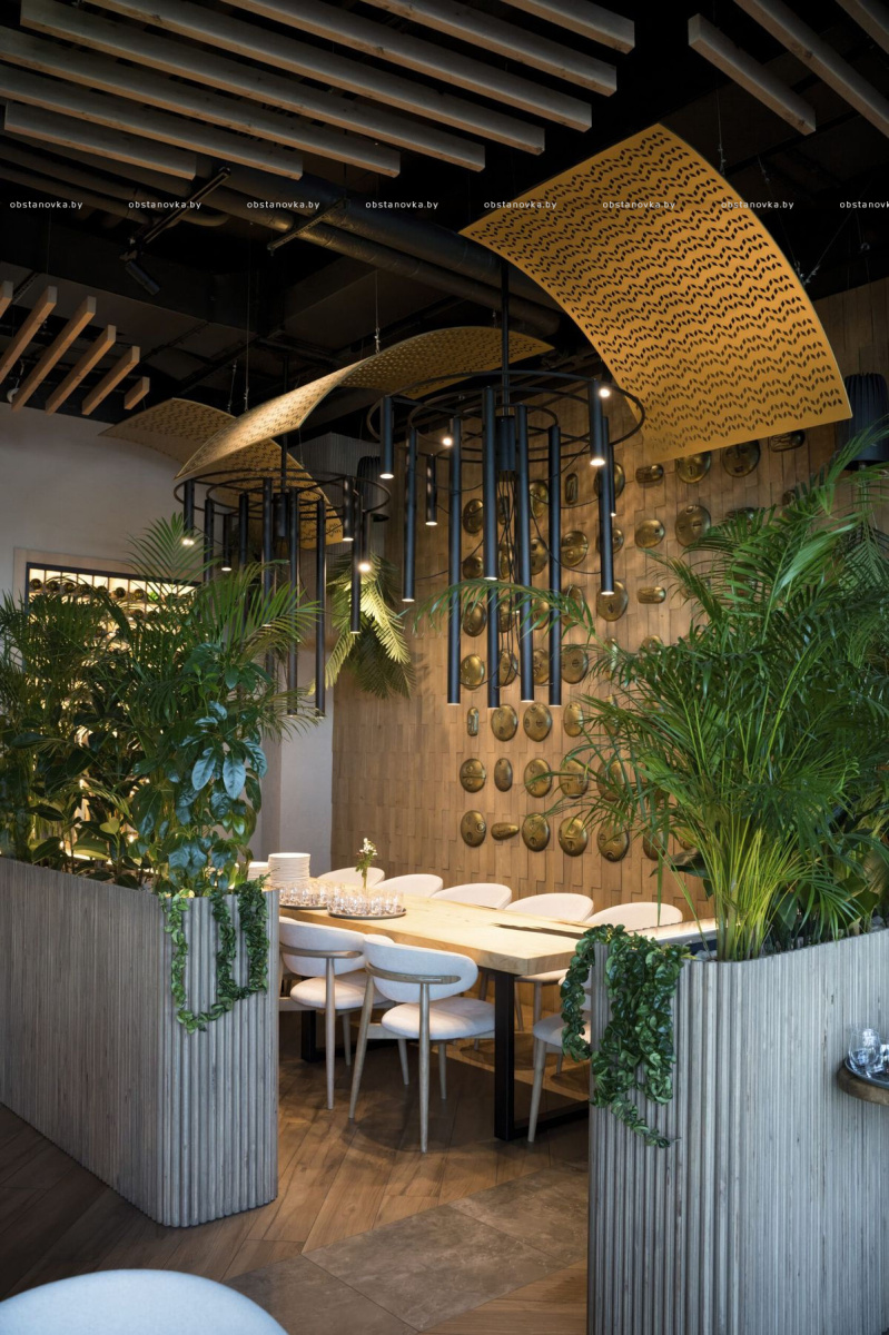 Деревянные кашпо для растений, обшитые полукруглой рейкой, будут символизировать гармоничное взаимодействие человека с природой. Растения, окруженные теплым деревом, создадут атмосферу уюта и естественности, напоминая о важности сохранения экологического баланса. Подсветка кашпо для растений добавит элемент жизни и динамики в интерьер ресторана. Свет будет символизировать энергию и рост, а растения будут напоминать о круговороте жизни и цикличности природы.