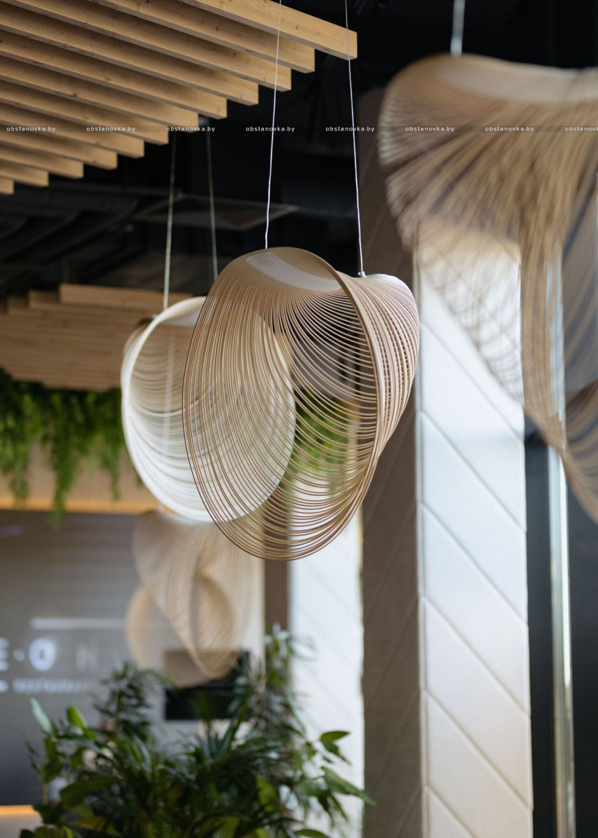 Потолочные композиции в виде направленных брусков, сформированных в плавную форму: Плавные формы композиции брусков на потолке, будут напоминать о непрерывном движении жизни и энергии, создавая атмосферу динамики и преображения. Это будет символизировать стремление к развитию, росту и принятию перемен.