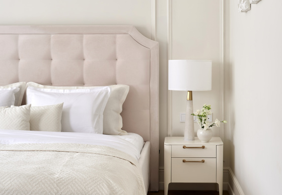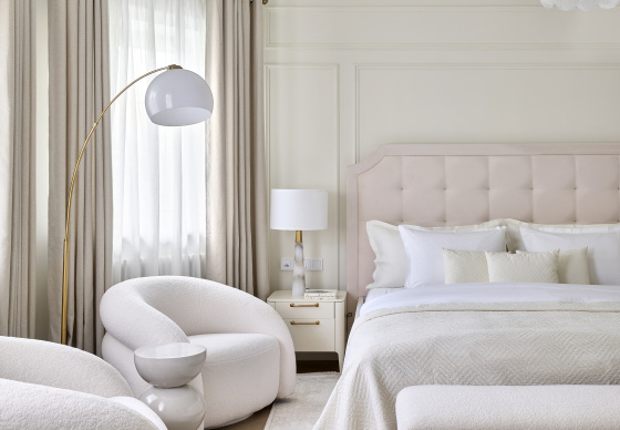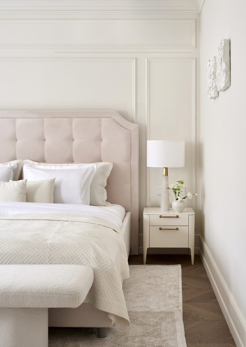 Спальня хозяев — самая уютная и обволакивающая, выполнена в нежной монохромной гамме с мягкими фактурами, бархатом, латунной фурнитурой и живописными картинами.