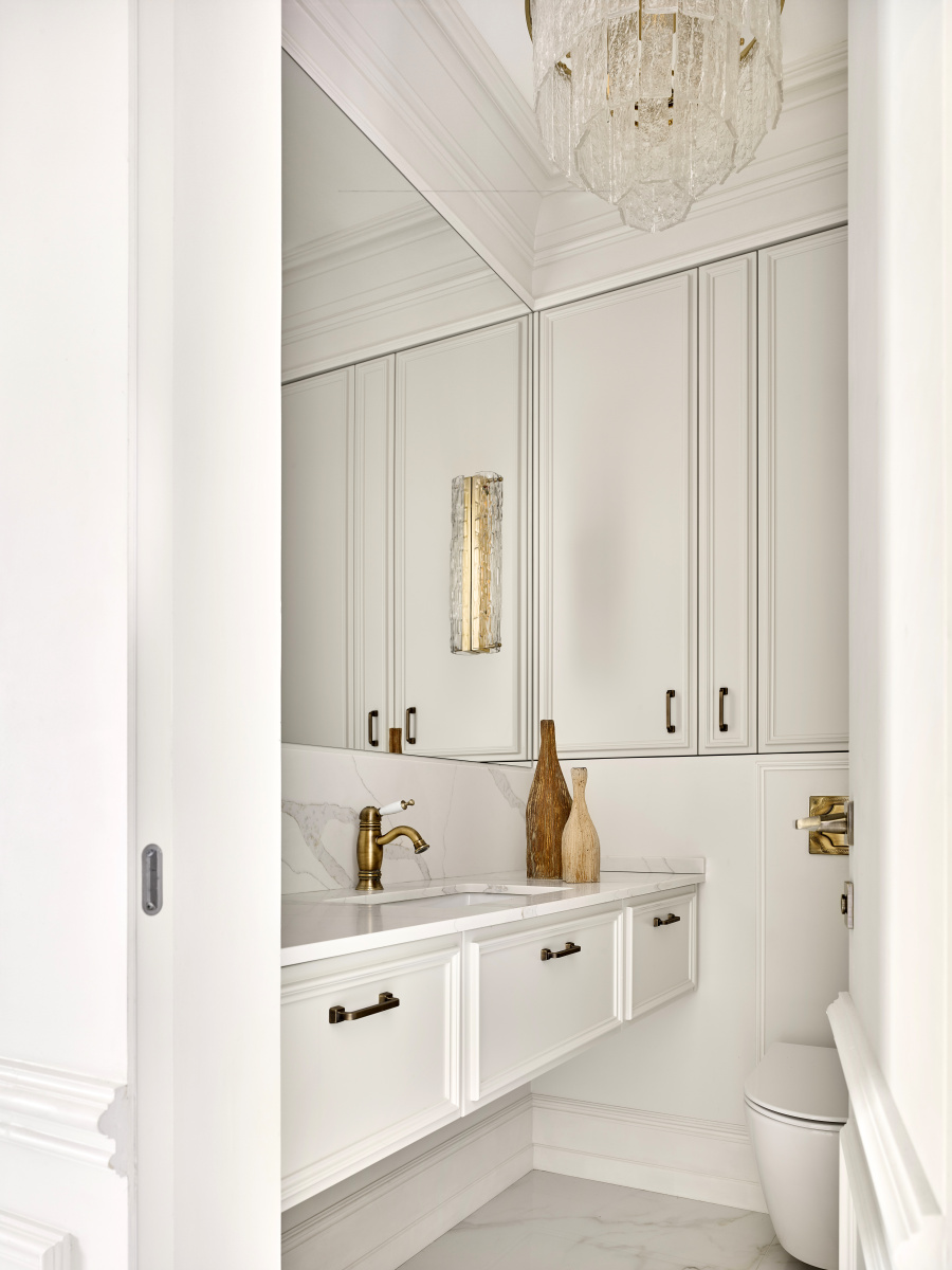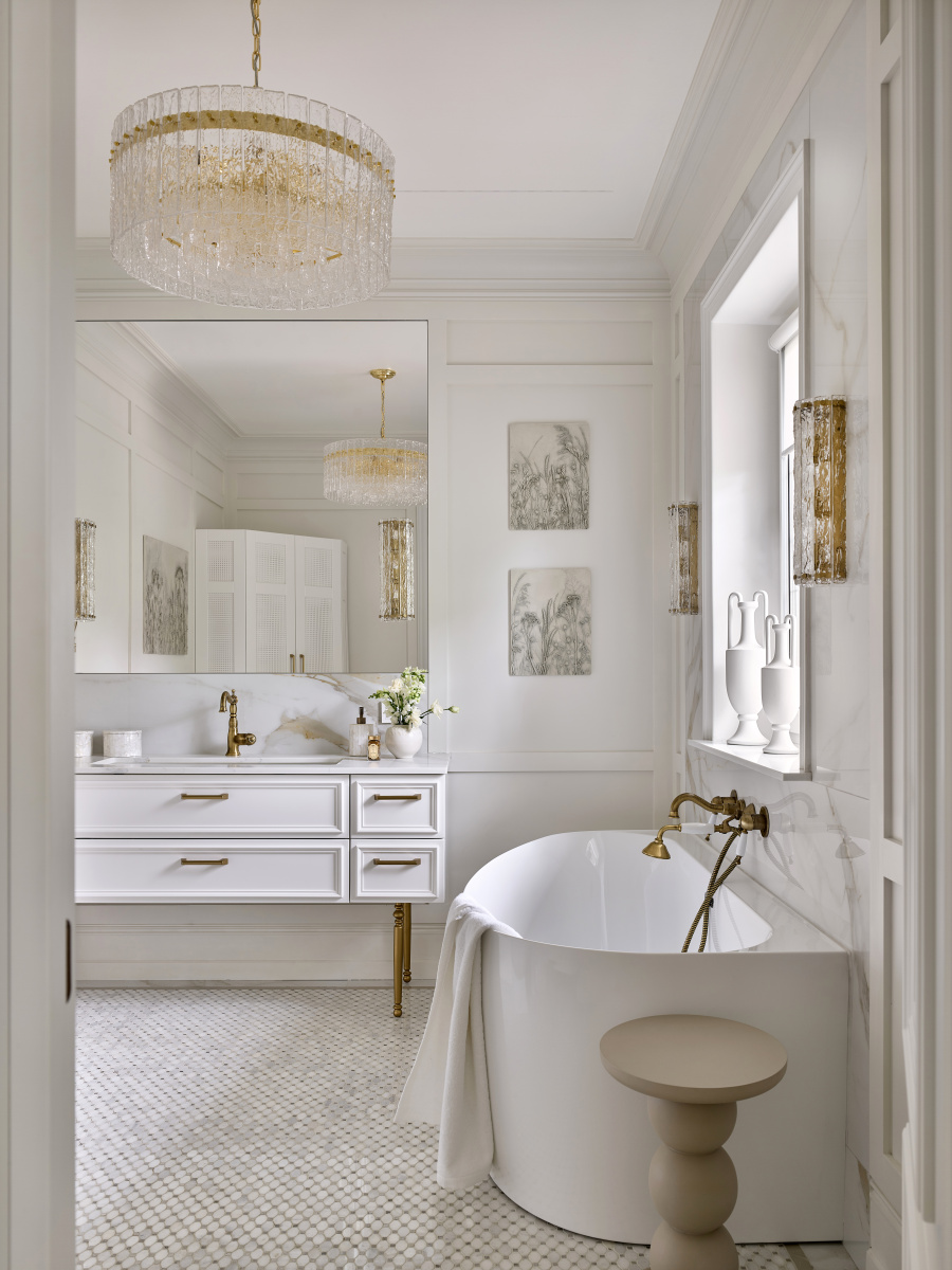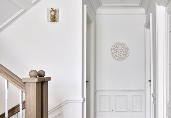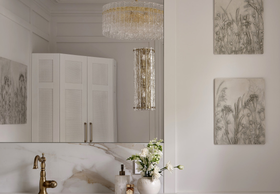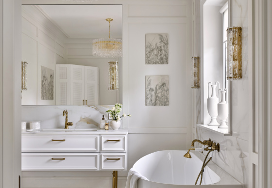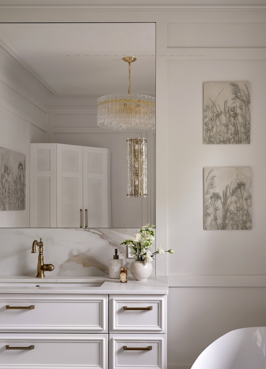 Особое удовольствие доставляет мастер-ванная с ванной у окна и барельефом, который создаёт атмосферу покоя и уединения.