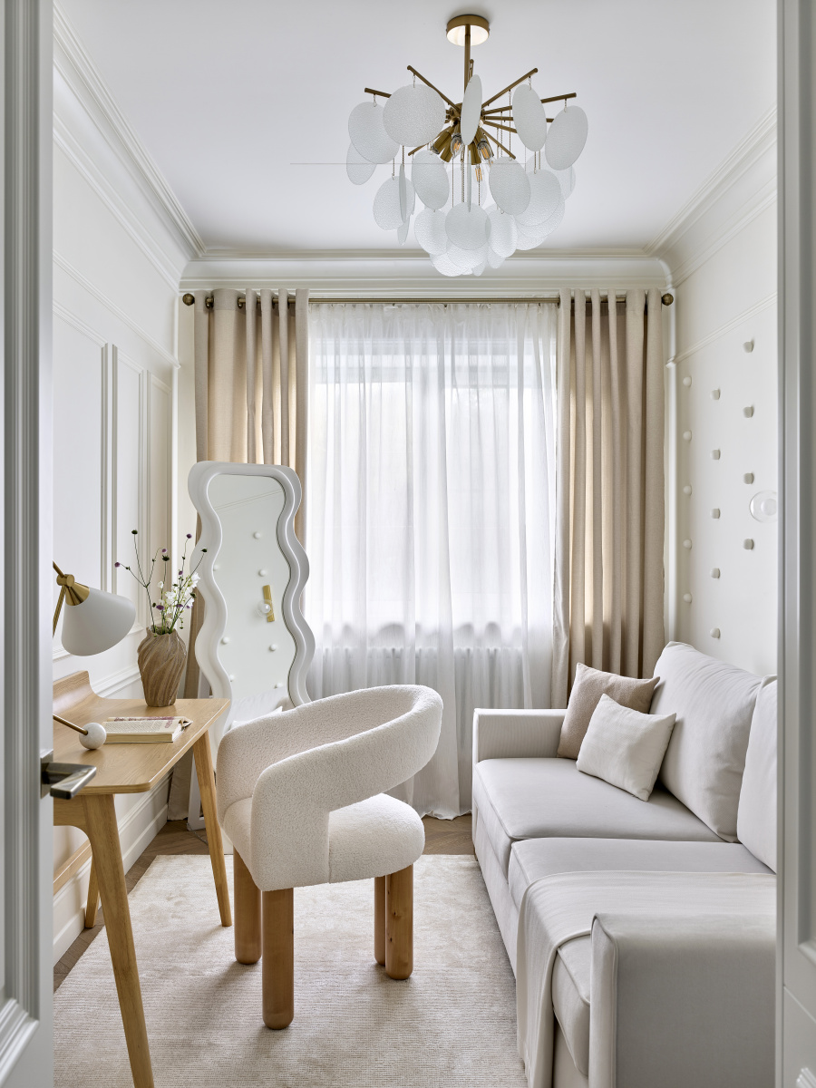 Детская — с ноткой волшебства и игривыми деталями: волнообразное зеркало, декор из мебельных ручек и мягкое рабочее место.