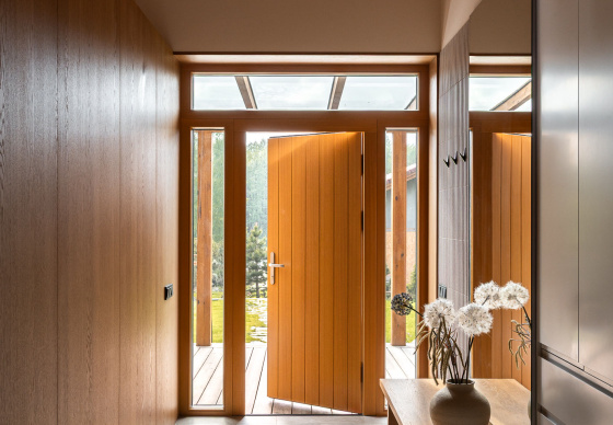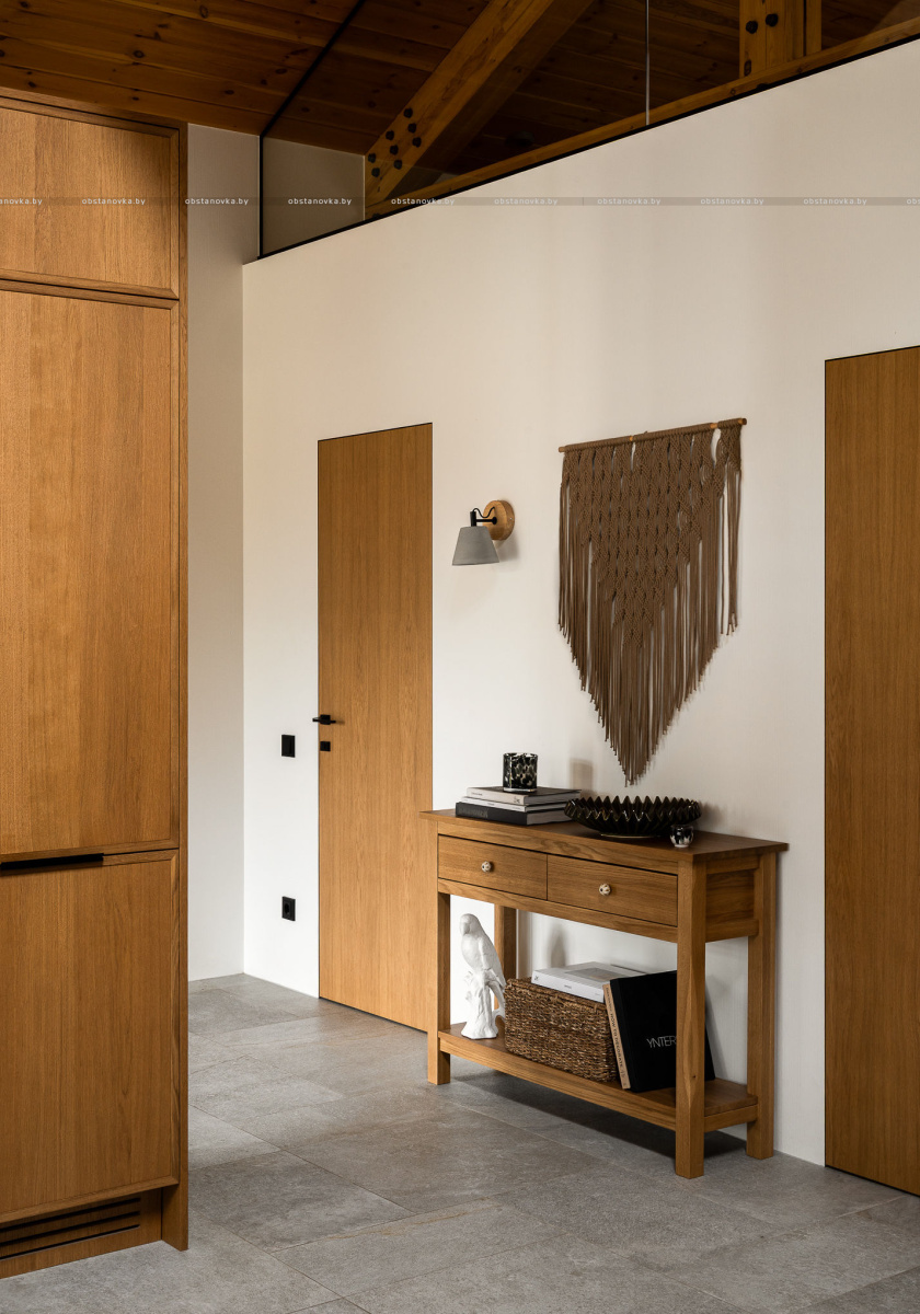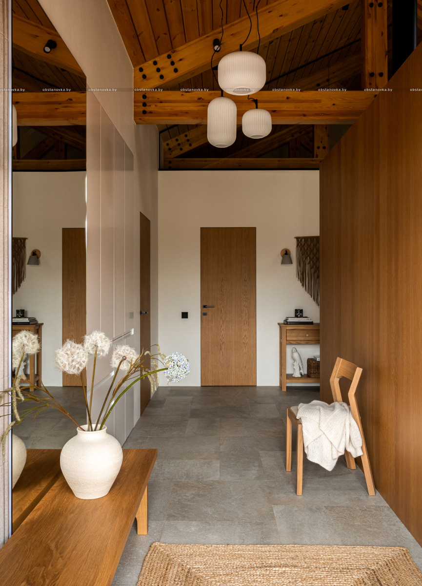 В прихожей мне очень нравится большое зеркало. Учитывая, что заказчик поставил входную дверь с оконными рамами, этот светлый холл отражает свет в зеркале и становится ещё светлее и просторнее. Очень люблю вид из дома на эту входную группу.