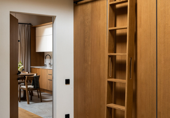 Стенка, делящая основное пространство зоны с прихожей, — это цельная конструкция, которая проектировалась вместе с кухней. Металлический каркас устанавливали до укладки плитки, а после зашивали шпоном со стороны прихожей. Таким образом, кухня стала декоративным приёмом разделения зон.