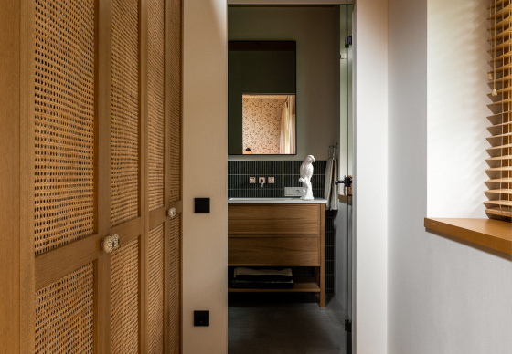 Шкаф спрятали за шпоновыми панелями со стороны кровати, получился цельный элемент. Фасады шкафа сделали из ротанга — очень нравится сочетание дикого леса за окном и ротанга. Также врезали окно в крыше уже после утверждения дизайна — комната стала ещё светлее.