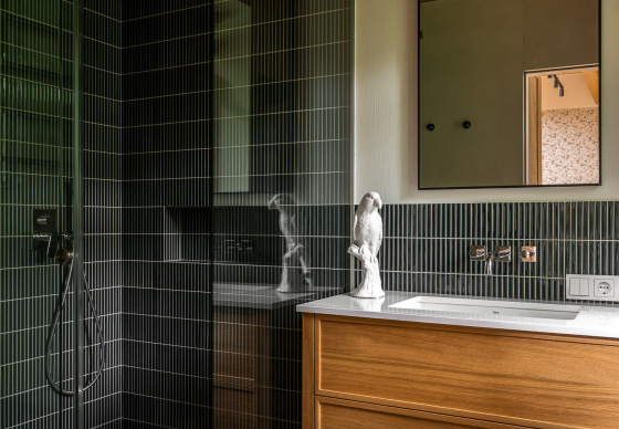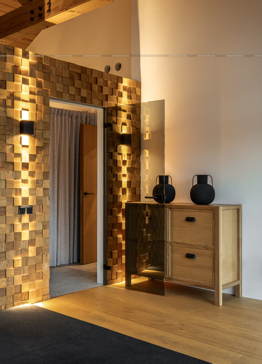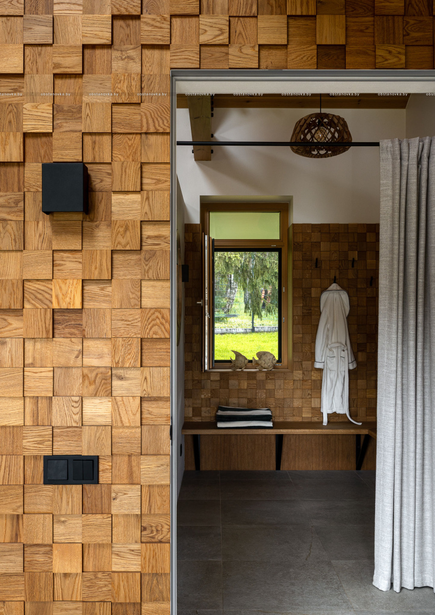 Мои авторские приёмы — это декоративная плитка на стене. Мы использовали этот приём возле камина и в прихожей. Также люблю использовать цветную плитку «кабанчик» в ванных комнатах. Оформление деревянным панно стенки в тренажёрном зале и банной зоне — тоже моё любимое решение. Задача — создать домашний уют в этих нежилых помещениях.