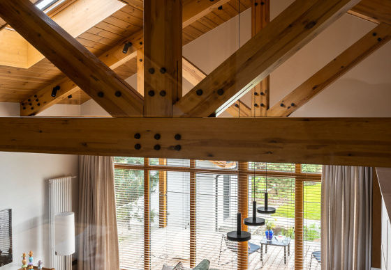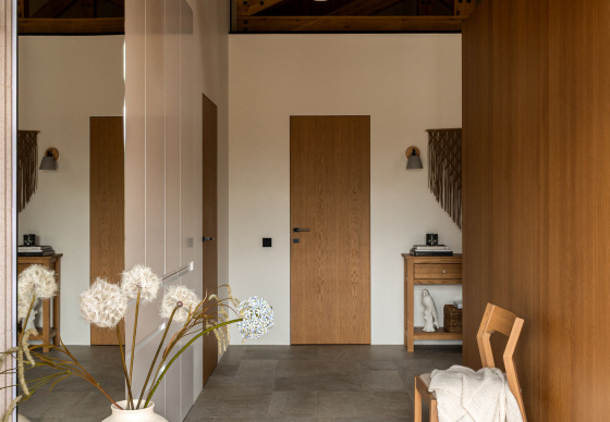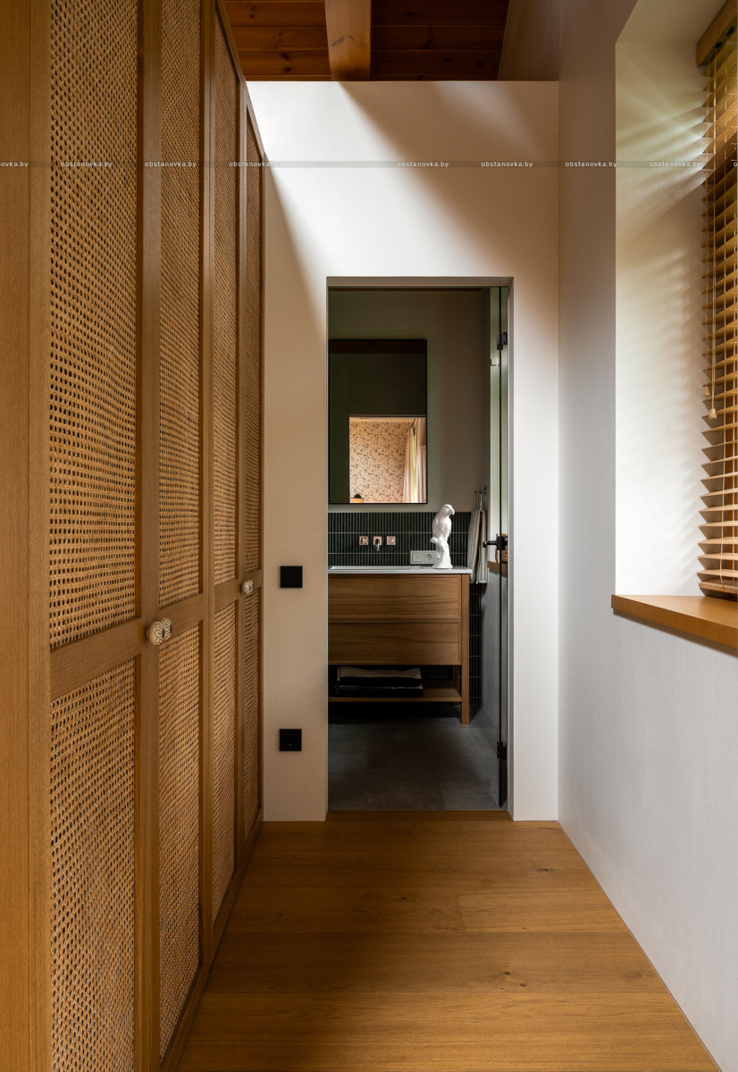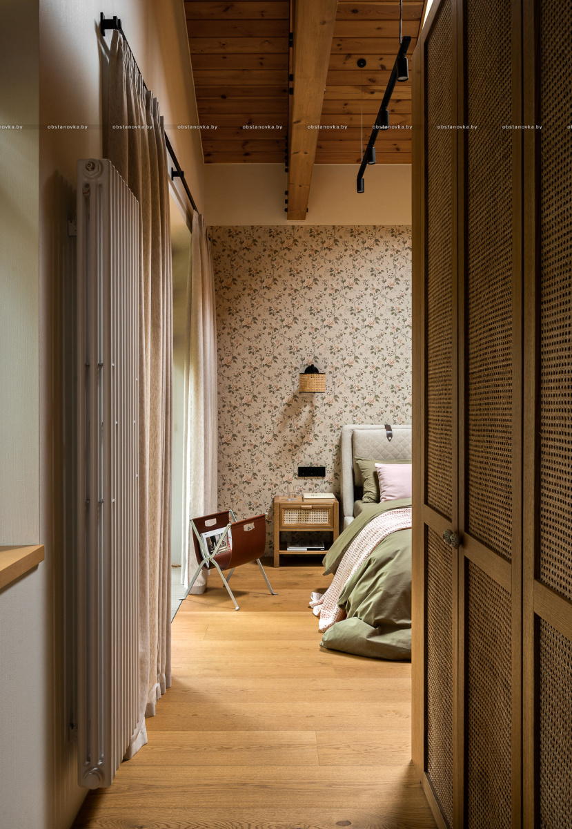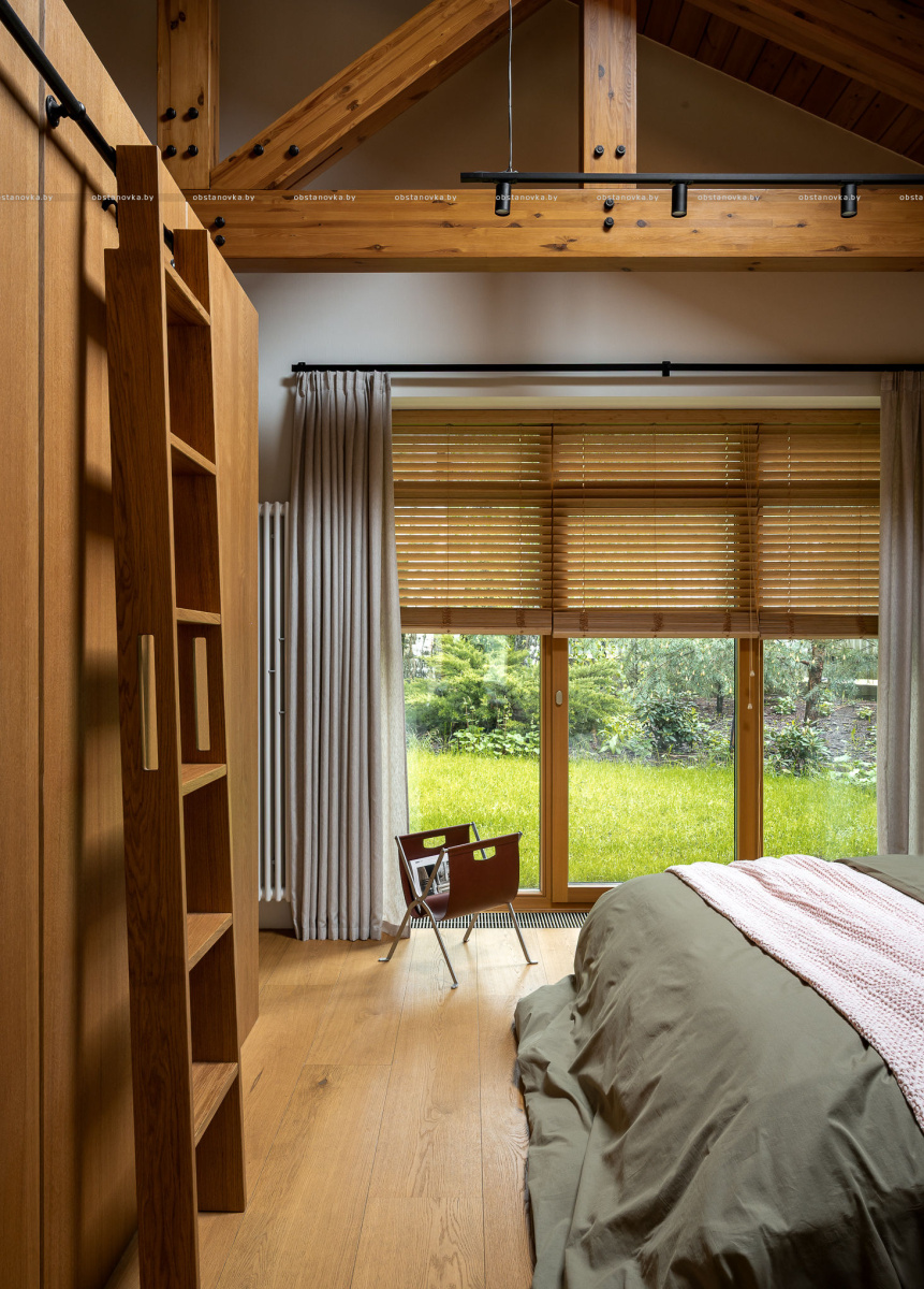 Здесь есть стенка, которая делит спальню от хозкомнаты. Так как мы решили, что фермы должны читаться и быть видны с любого угла дома, над хозпомещением образовалось пространство, которое заказчики решили оставить как антресоль, и появился декоративный элемент — лестница наверх.