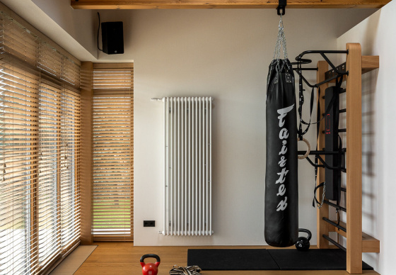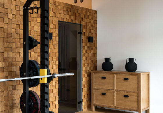 Чтобы объединить два помещения (так как из тренажёрного зала мы попадаем в дом через общую зону, где виднеется зона переодевания), мы решили зашить стены деревянными панелями и изготовили шкаф и скамейки из шпона такого же цвета.