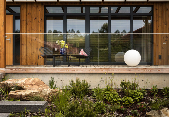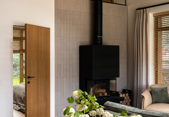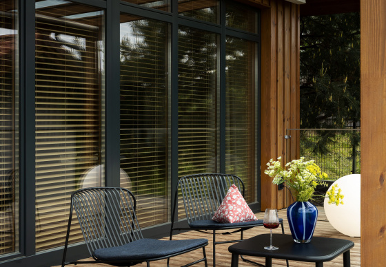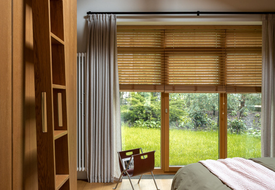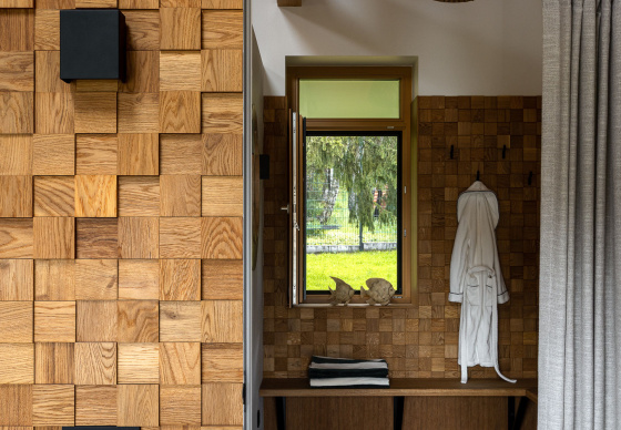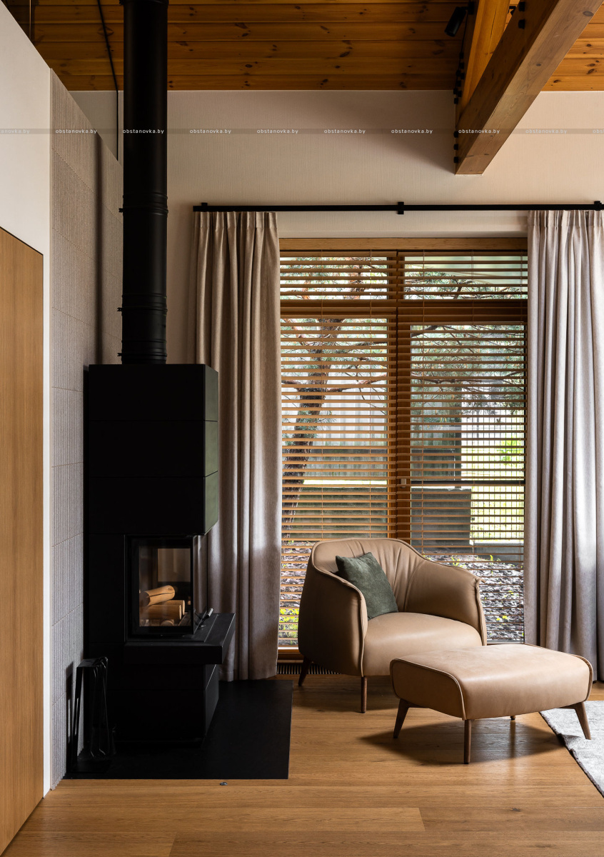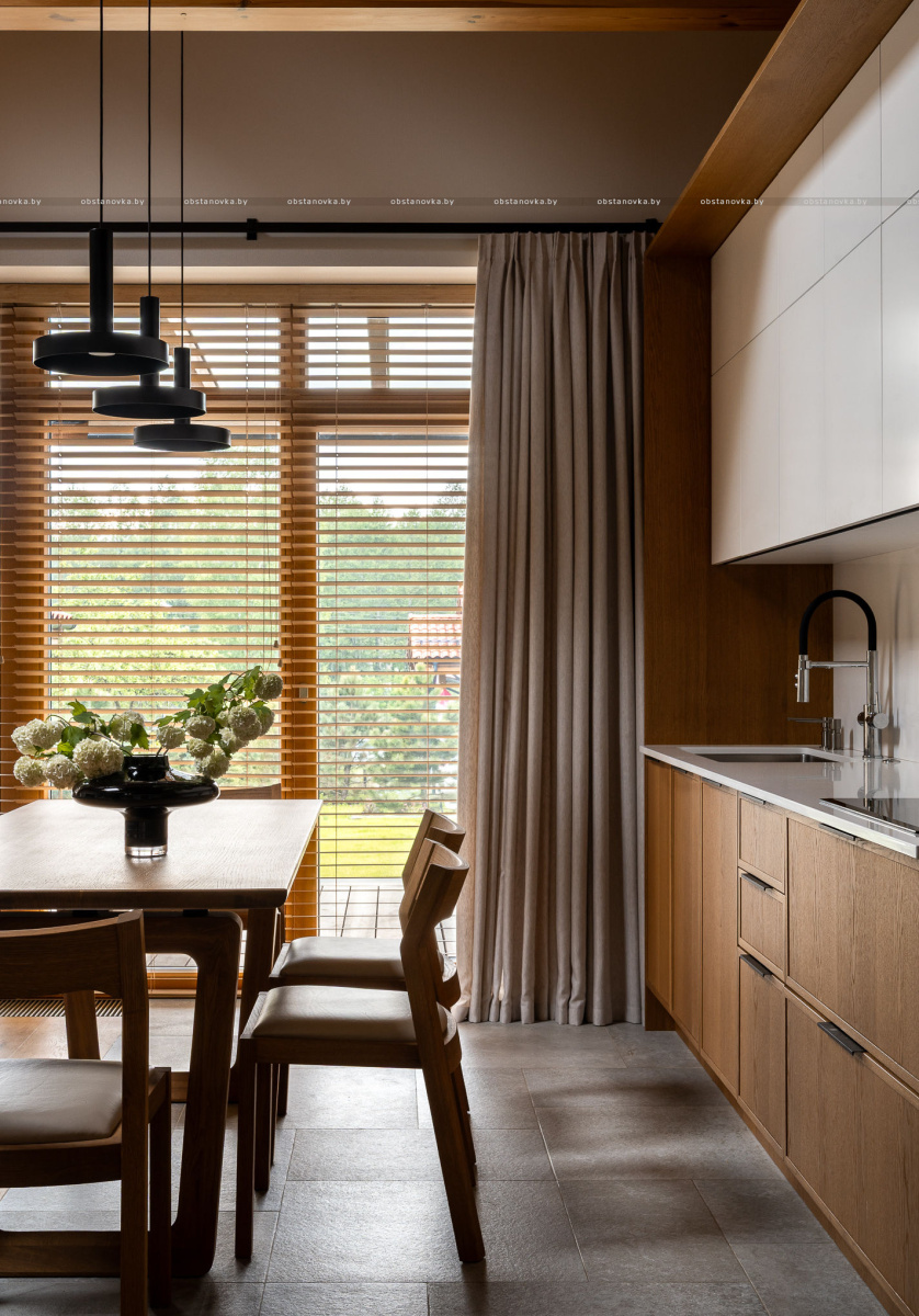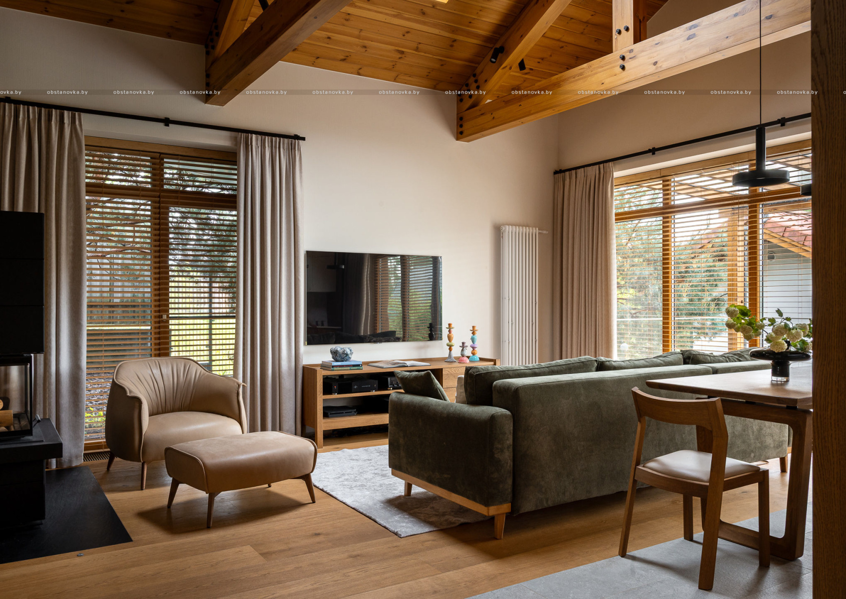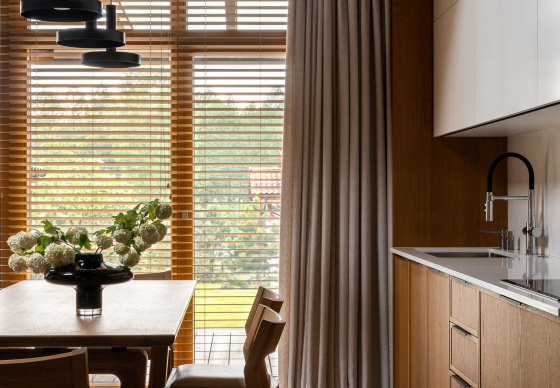 Добавили деревянные панели на стены, чтобы создать ещё более уютный интерьер. Подсветка на панелях в виде бра создаёт красивую игру теней. Архитектор заложил большое остекление, и так как это солнечная сторона, мы изготовили деревянные жалюзи — они добавили мягкости и уюта этому помещению.