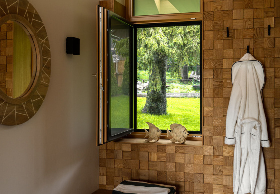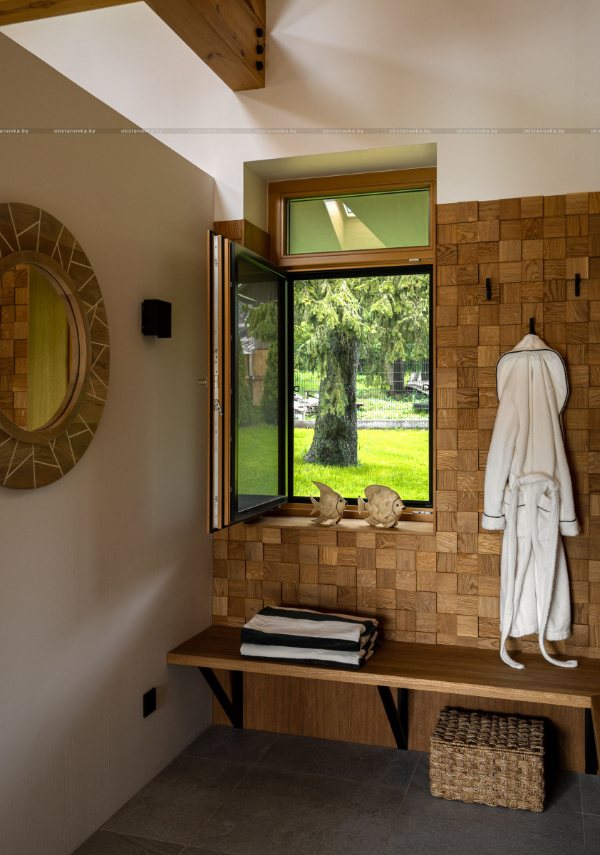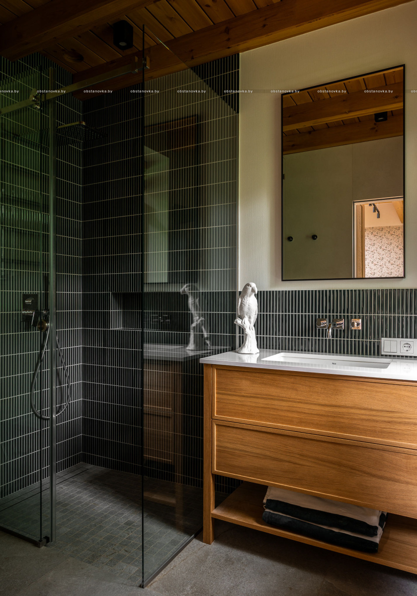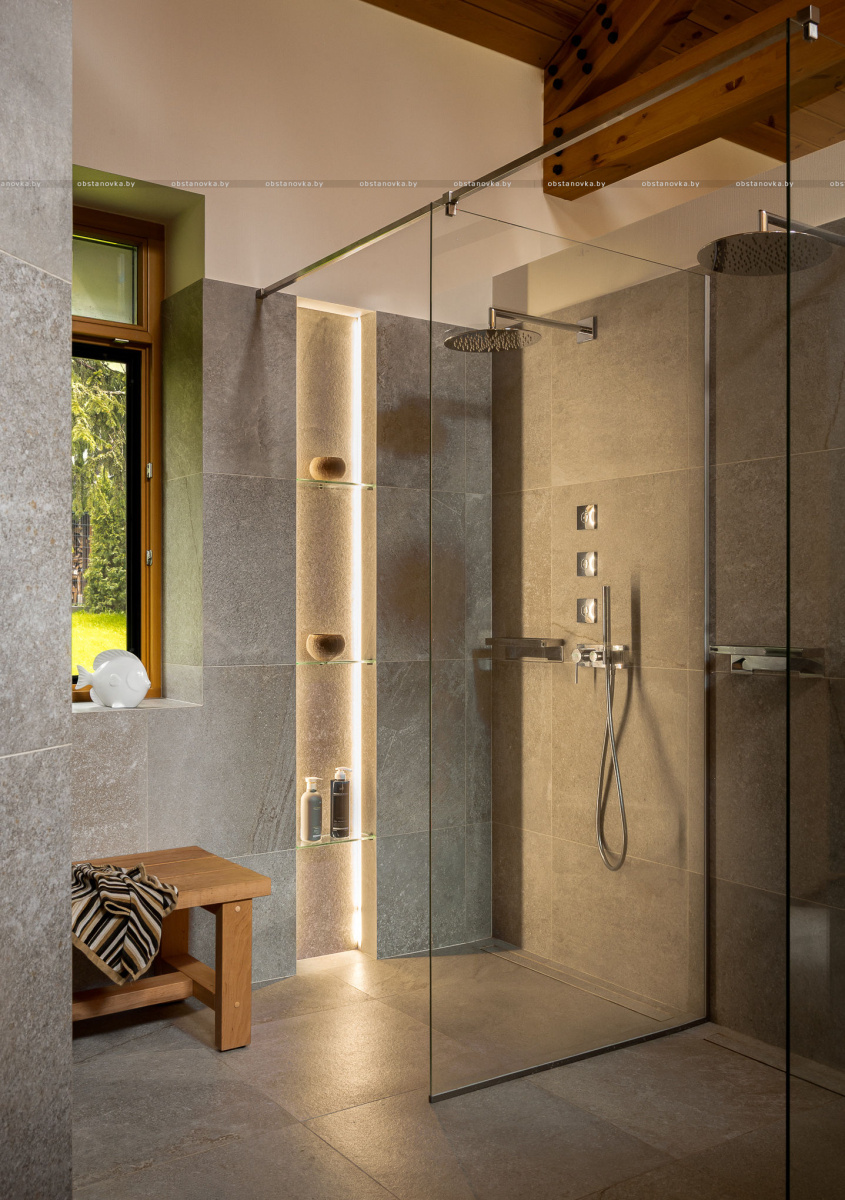 Плитка-мозаика в душевой цвета голубой сосны, а на стенах — плиты Laminam. Светлое окно в дикий лес даёт полное ощущение соединения с природой по цветовым и текстурным решениям. Ниша для банок в душе рассчитывалась под высоту плитки и шампуней.