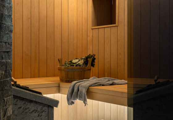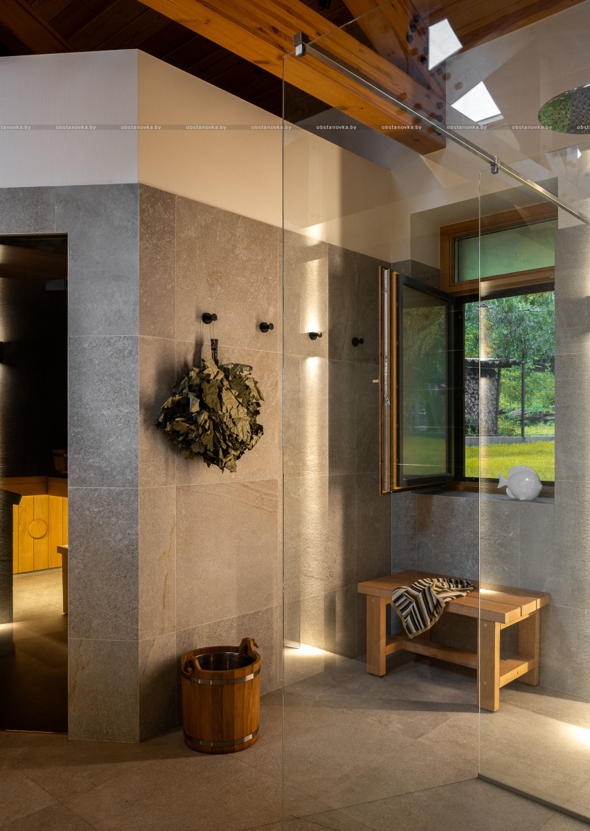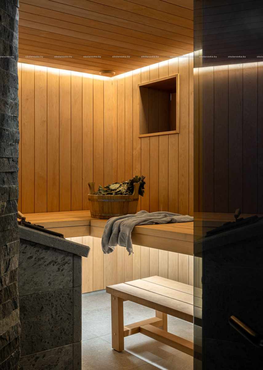 Заказчик пожелал две душевые — мужскую и женскую. Мы добавили нишу для хранения после бани и сделали подсветку как приём мягкого света для расслабления.