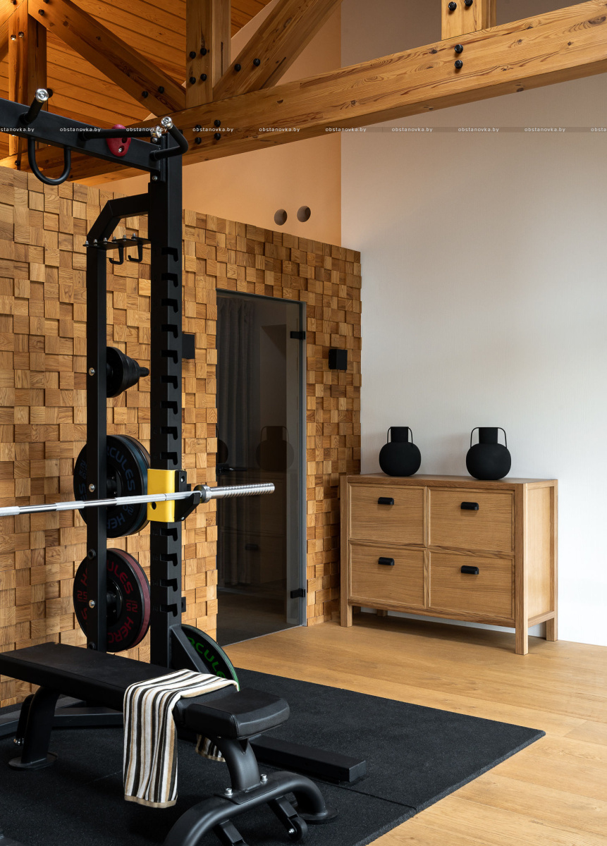 Тренажёры изготавливались под заказ — всё, что любит заказчик. Пол мы оставили таким же, как в гостиной, чтобы помещение не выглядело как общественный тренажёрный зал (хотя изначально заказчик хотел положить профессиональное покрытие).