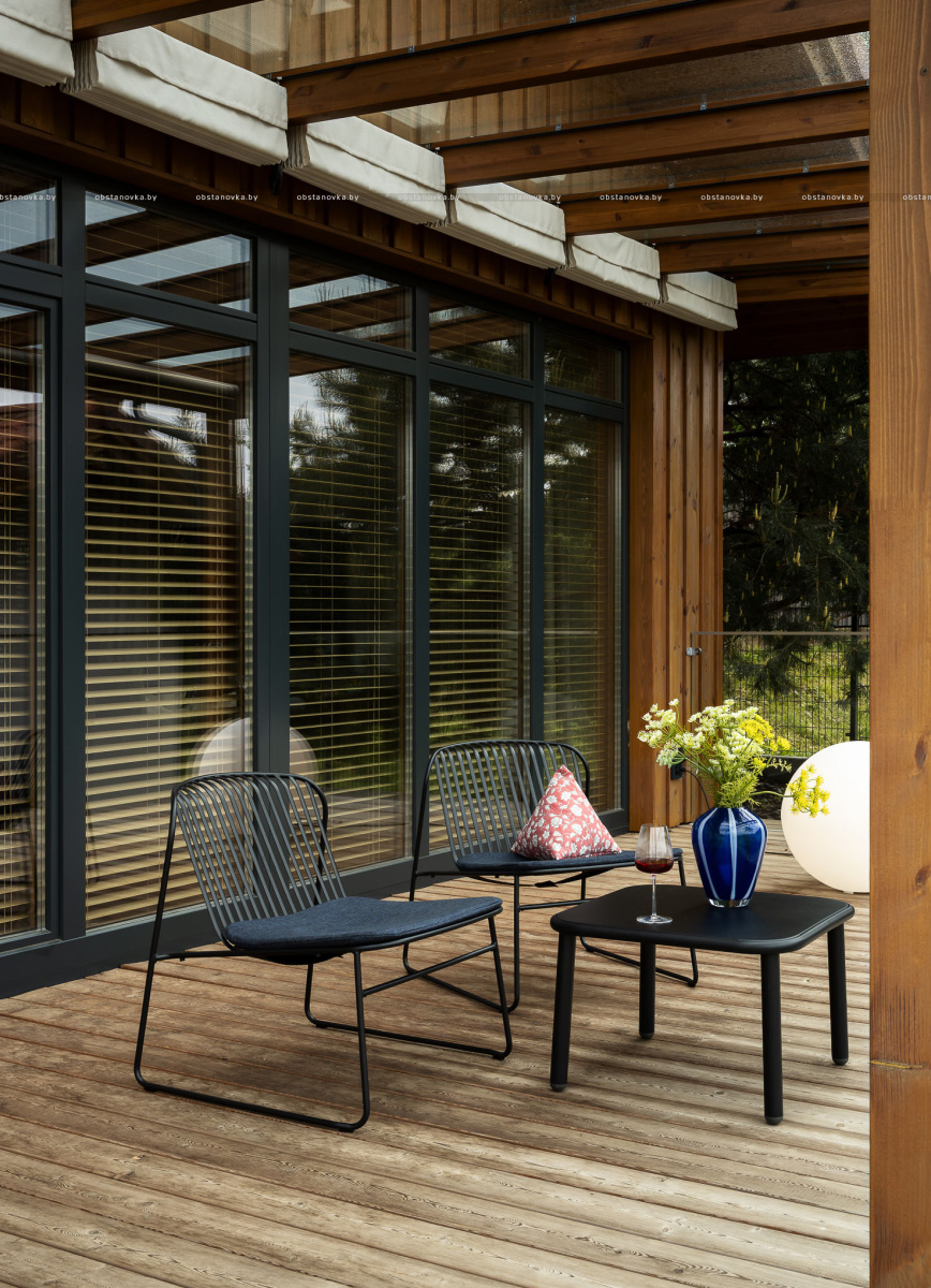 Самый необычный элемент этого интерьера для меня — это продолжение стены из стекла в общей зоне, которая позволяет увидеть фермы в перспективе. Стенку изготавливали из трёх стеклянных элементов.