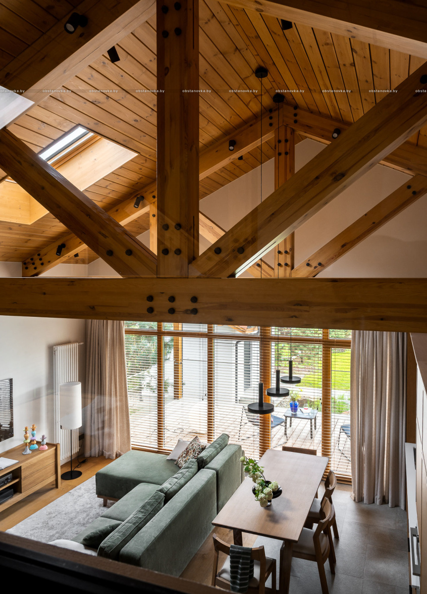 Сам заказчик увлекается беговыми лыжами и любит силовые упражнения, почти все тренажёры в зале были изготовлены под заказ. Пожелание заказчика — оставить максимально открытое пространство, чтобы были видны фермы и больше света в доме. Любят неяркие цвета и сидеть у камина. В планировке дома заказчика большая площадь отдана под его увлечения — это баня, предбанник, раздевалка и тренажёрный зал.