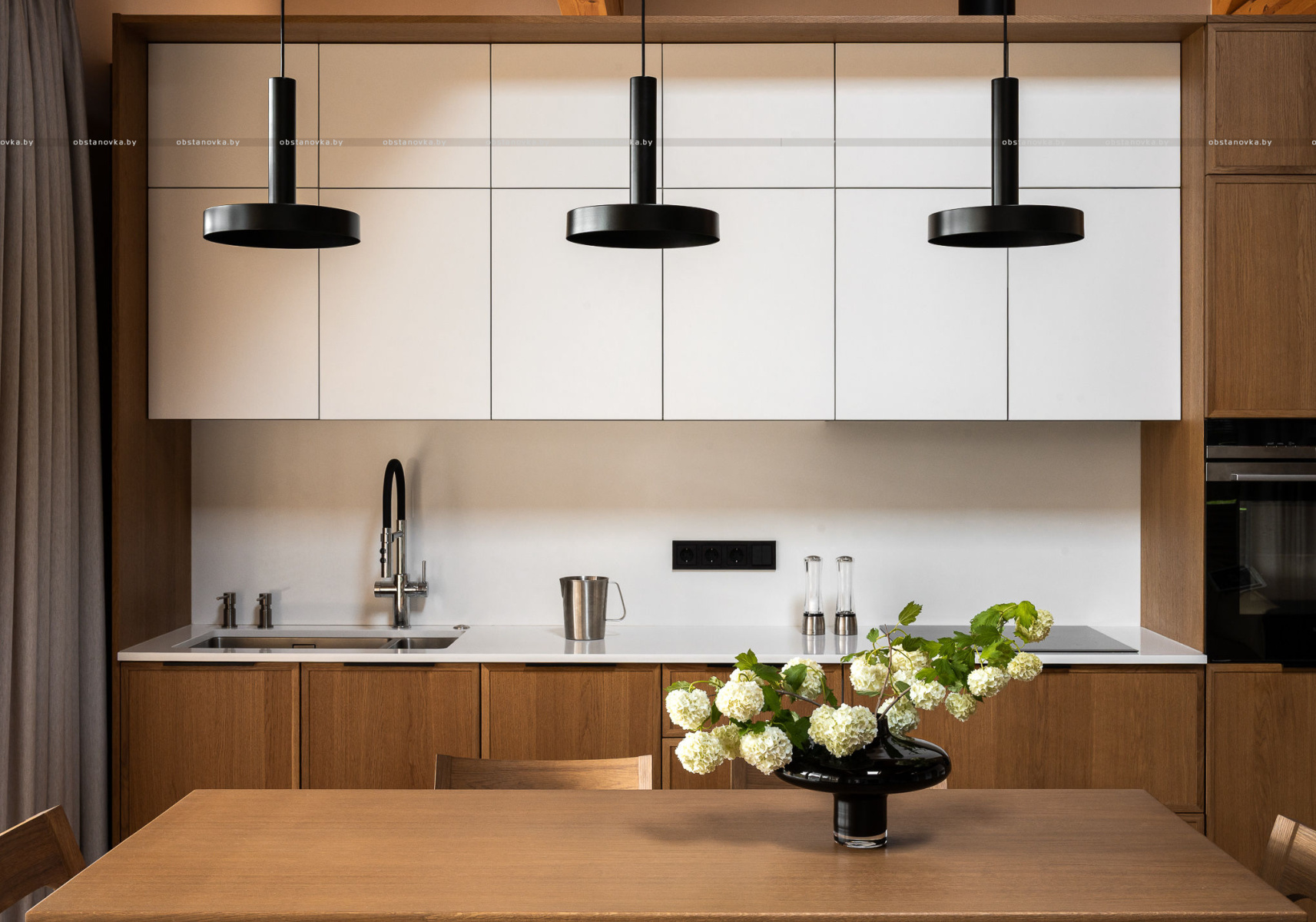 Также сама кухня обрамлена шпоном со всех сторон и находится как бы в коробочке.