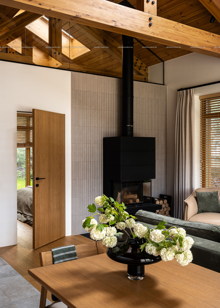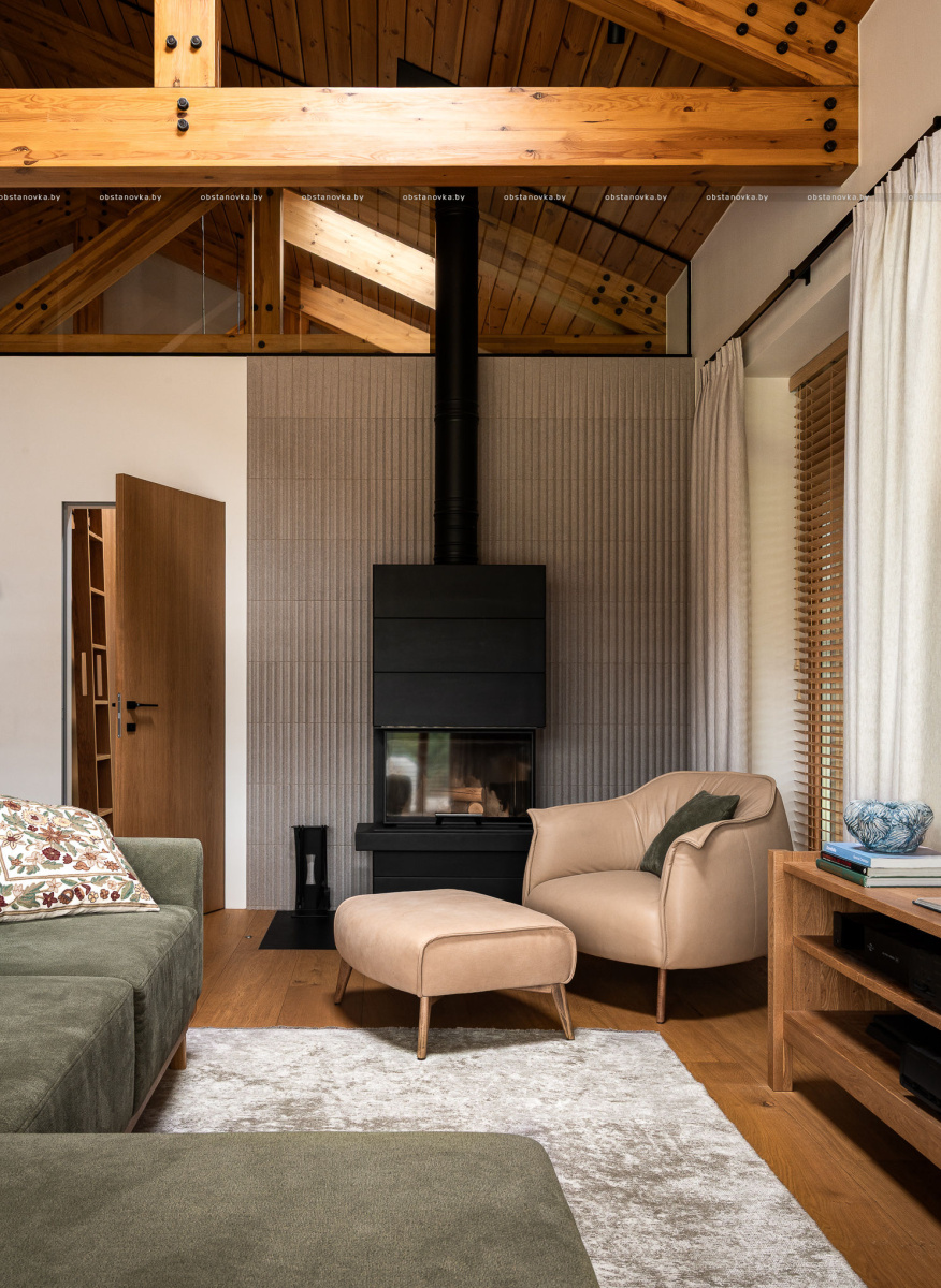 Считаю, что в этой зоне основной акцент — это камин и оформление каминной зоны. Рада, что рядом с камином есть окно — это не тёмный угол, а светлая зона. Нравится стенка из плитки, которая делит длинную стену на зоны. Окна Velux в крыше дают много естественного света — их врезали уже по ходу ремонта, когда заказчик решил добавить света в гостиную.