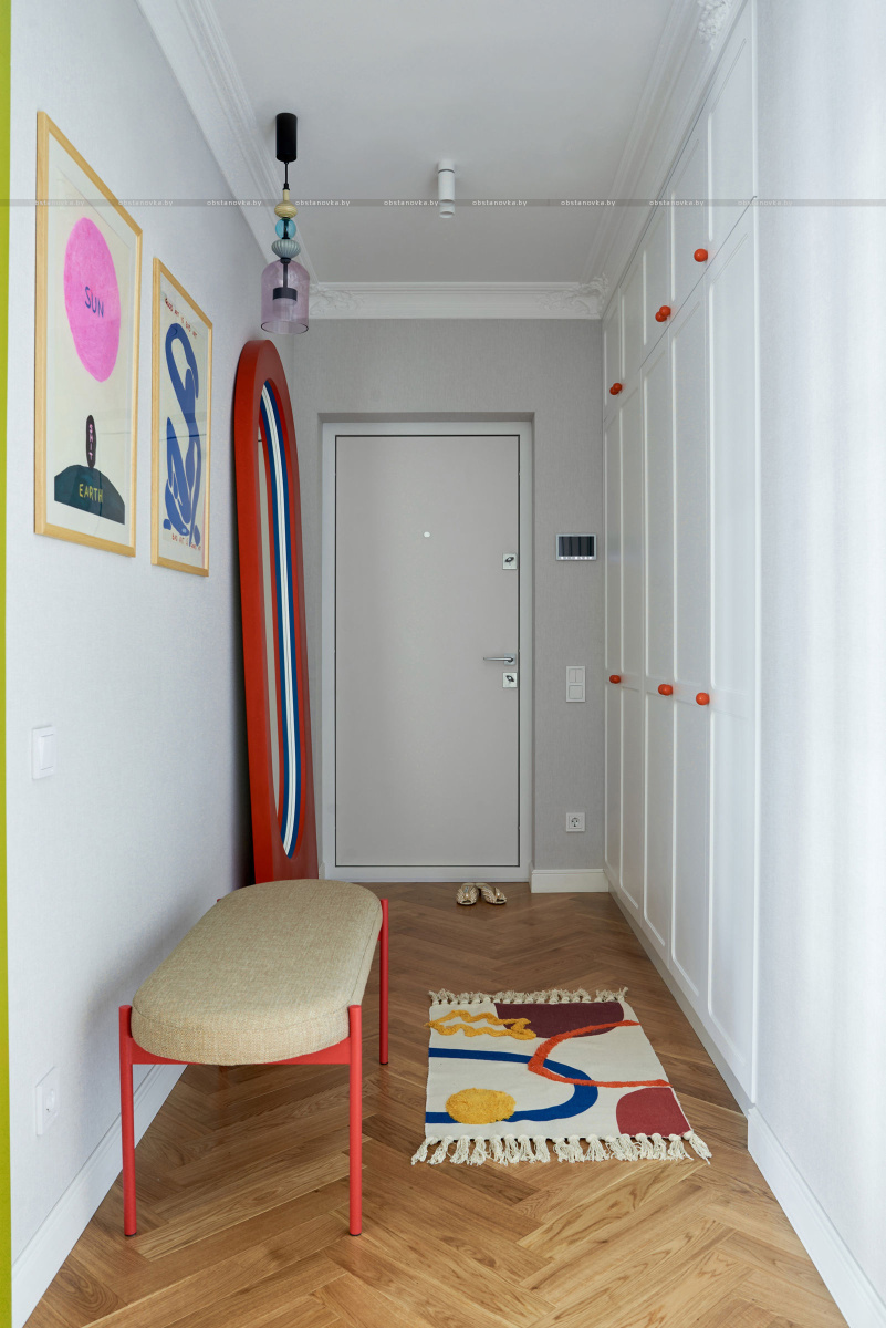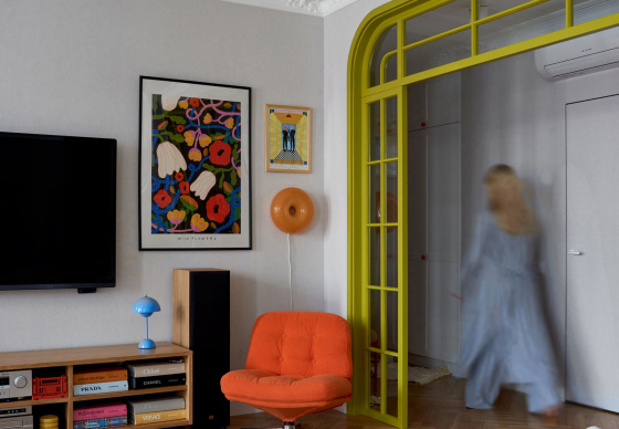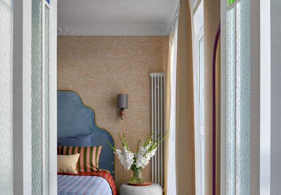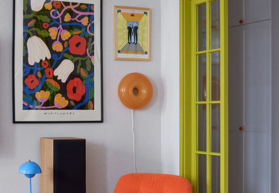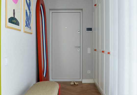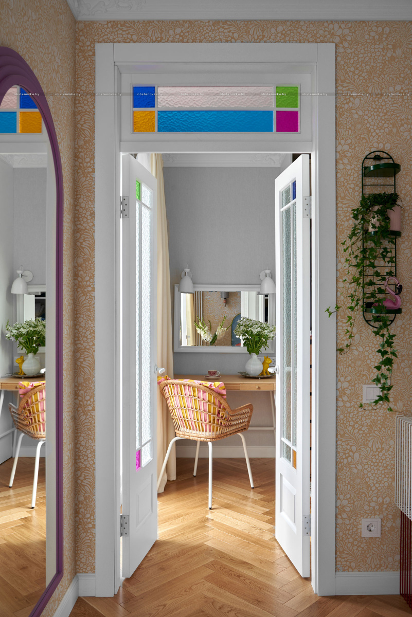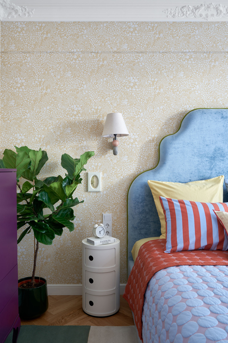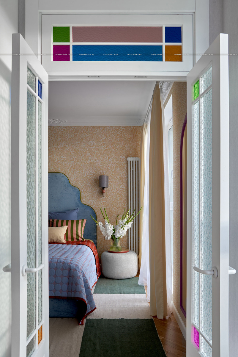 В спальню ведут две распашные двери из натурального дерева. Получился яркий, нешаблонный интерьер с легким налетом mid-century, в который мы гармонично интегрировали идеи и пожелания заказчиков.