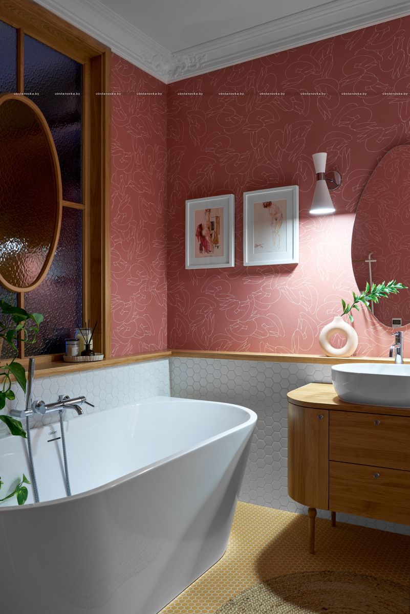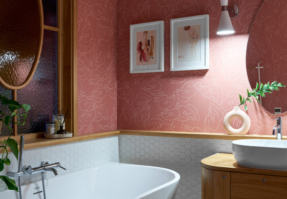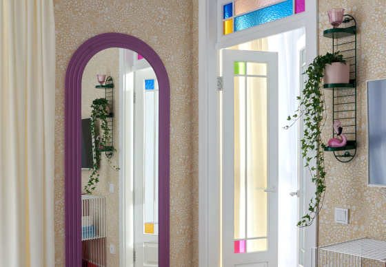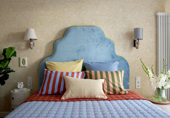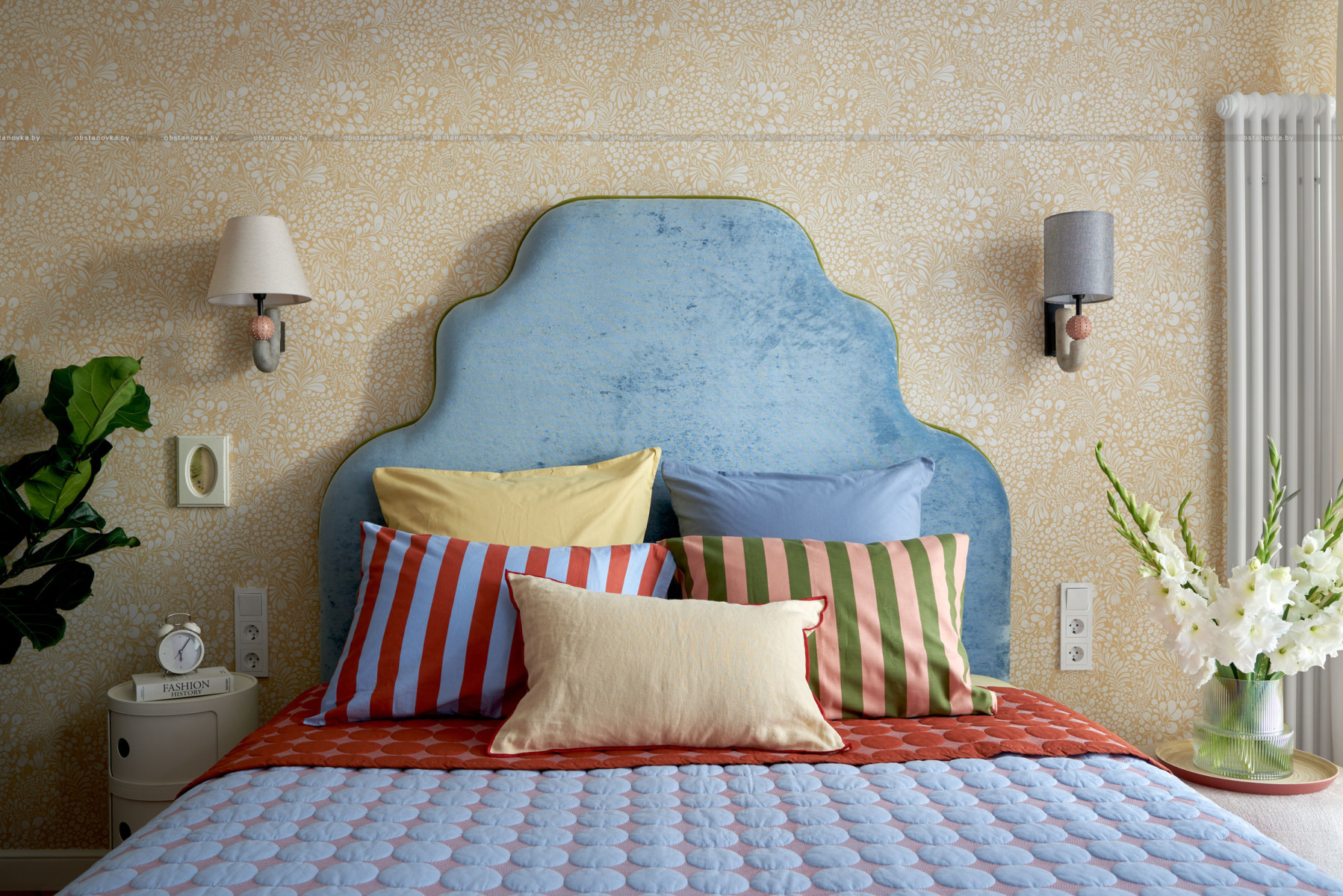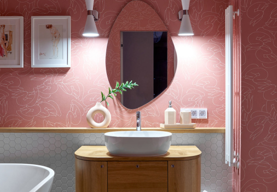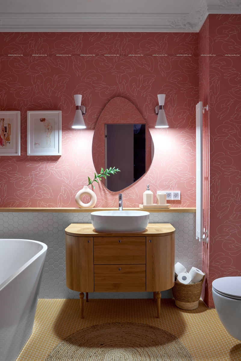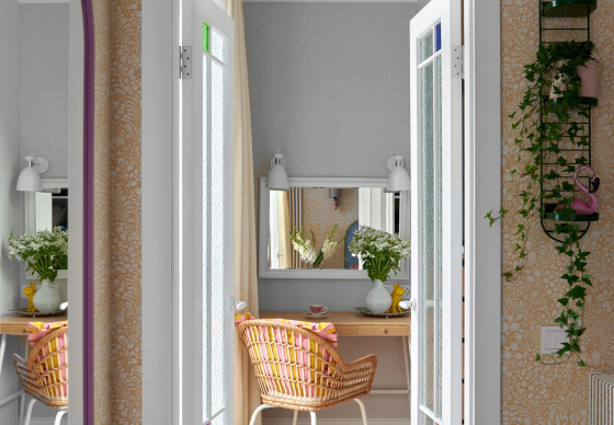 В спальню ведут две распашные двери из натурального дерева. Получился яркий, нешаблонный интерьер с легким налетом mid-century, в который мы гармонично интегрировали идеи и пожелания заказчиков.
