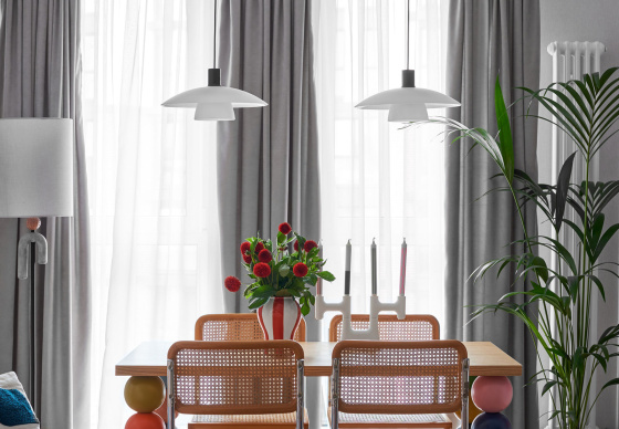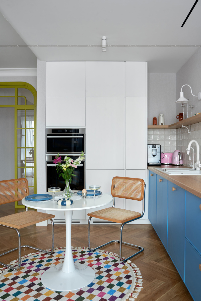 Мы сделали просторную кухню-гостиную со столовой зоной, а также спальню с большой гардеробной — заказчица увлекается модой и стилем.