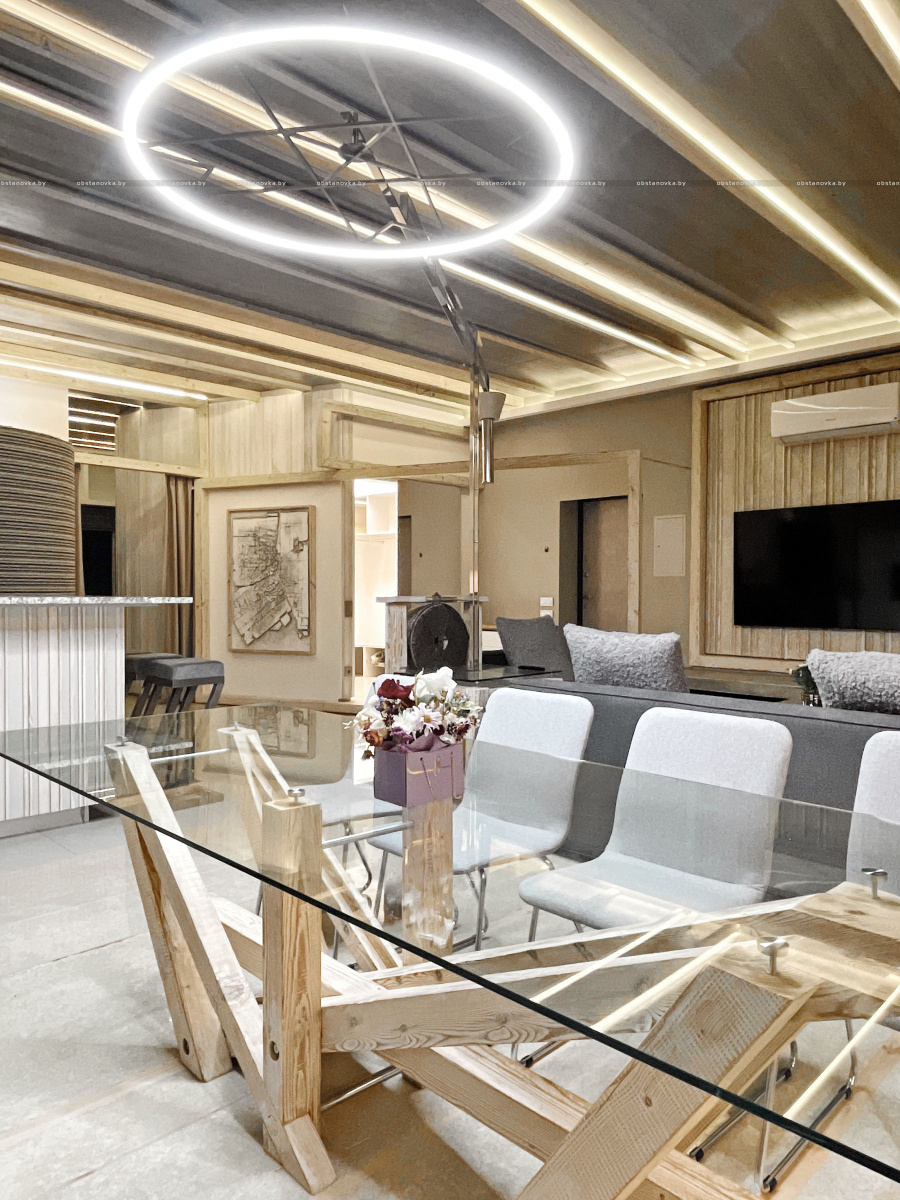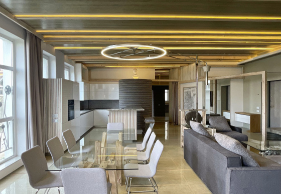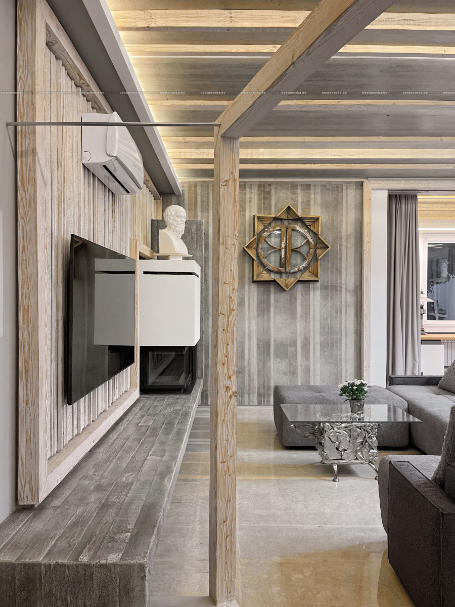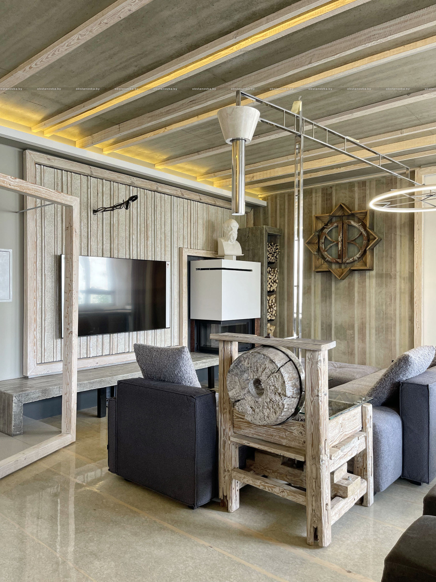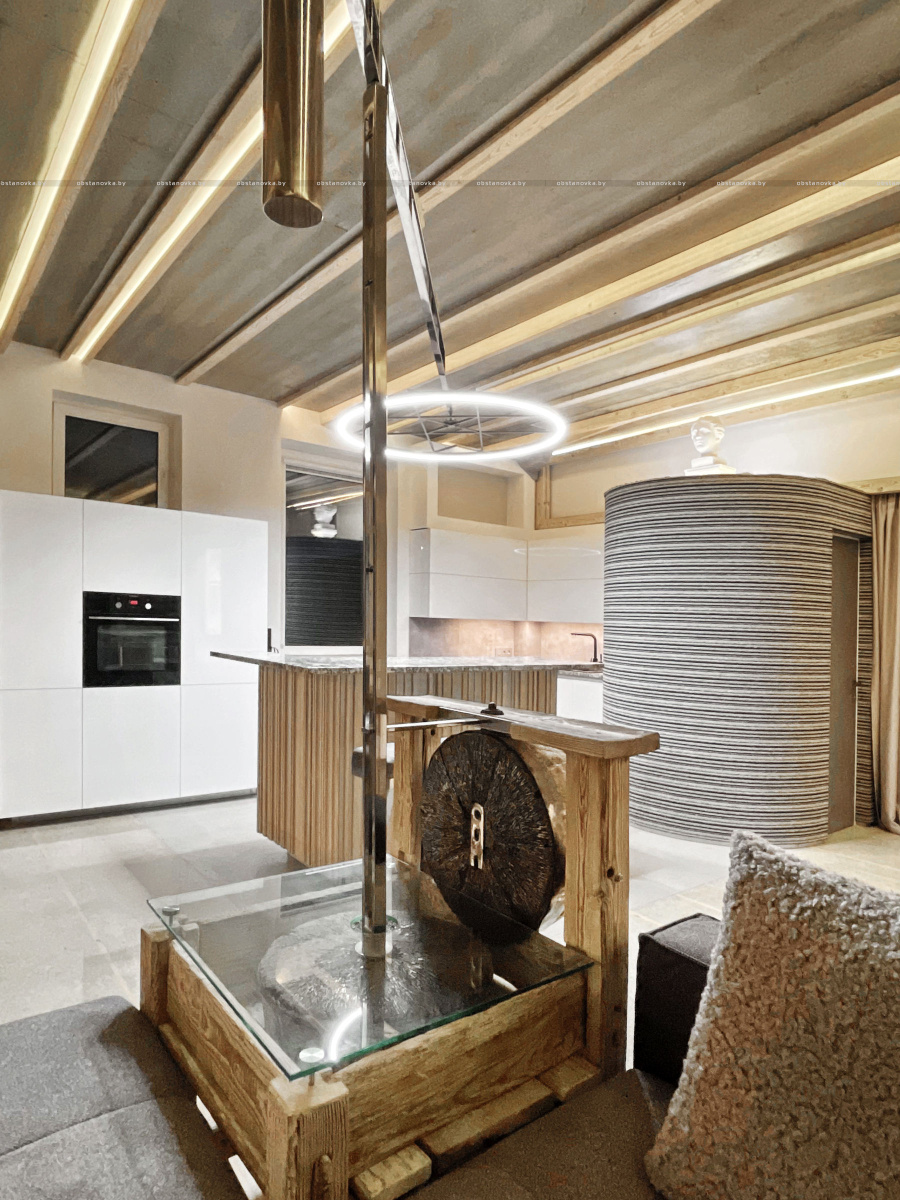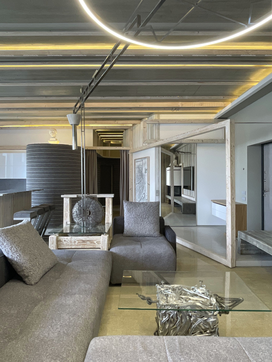 Пэўна што яны перамяжуюцца з сучасным аздабленнем. Столі кватэры выкананы з памытых бетонных пліт і зафіксаваны матавай грунтоўкай. Шчыліны паміж плітамі зачынены прадоўгімі ліхтарамі з дрэва і светадзіодаў, якія нагадваюць звыклыя бэлькі.