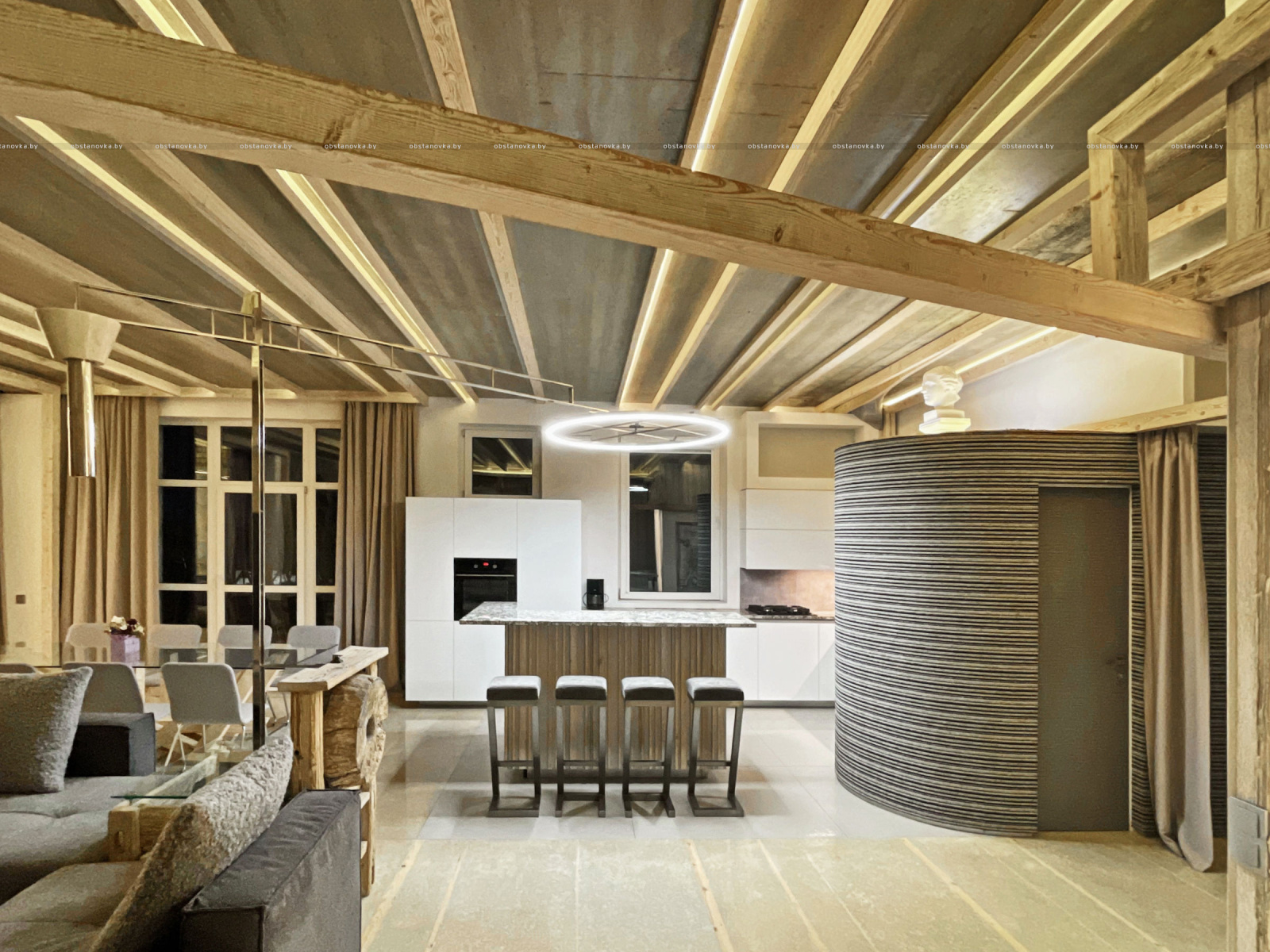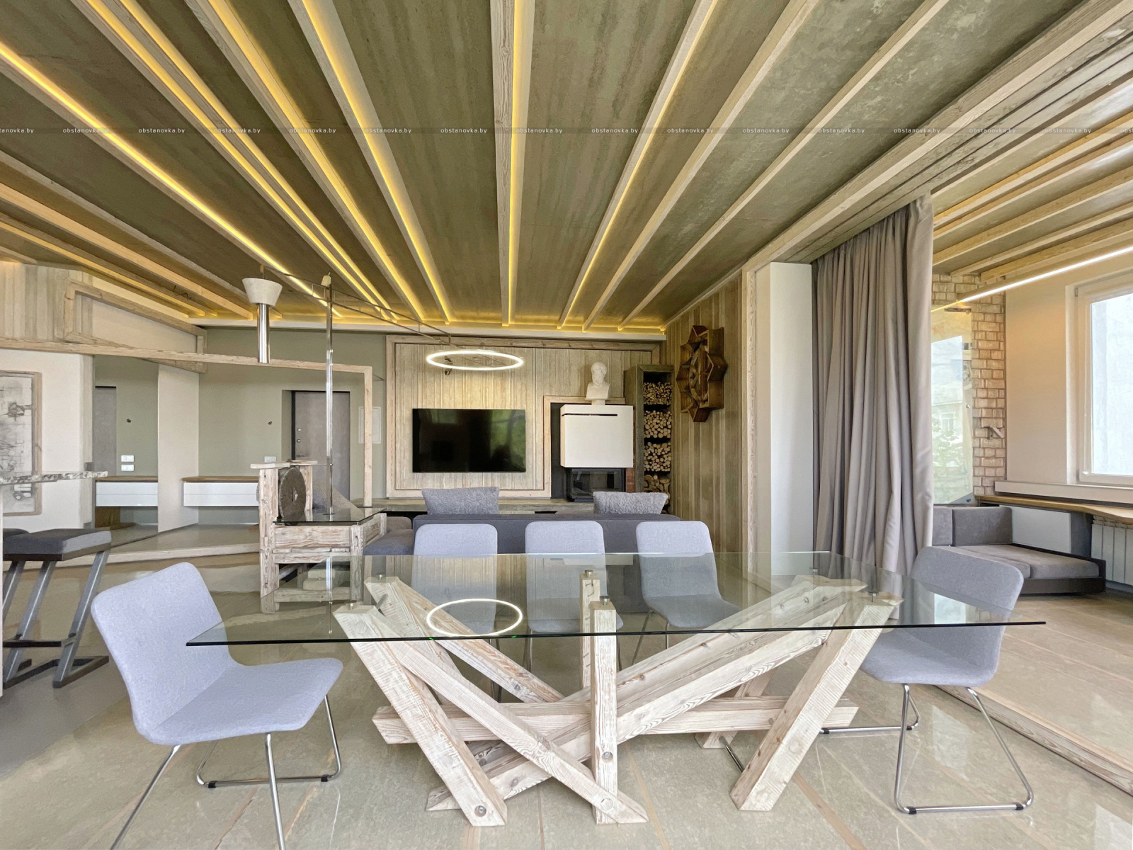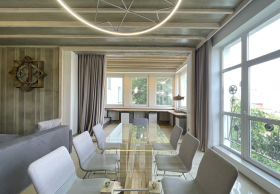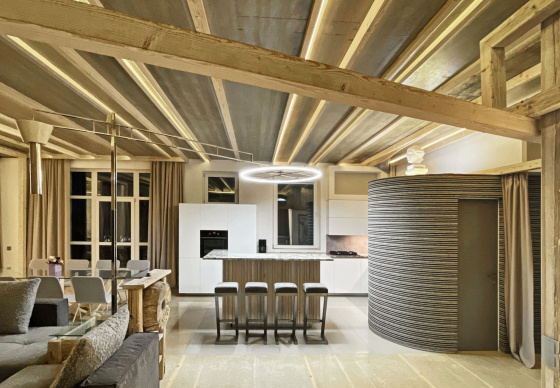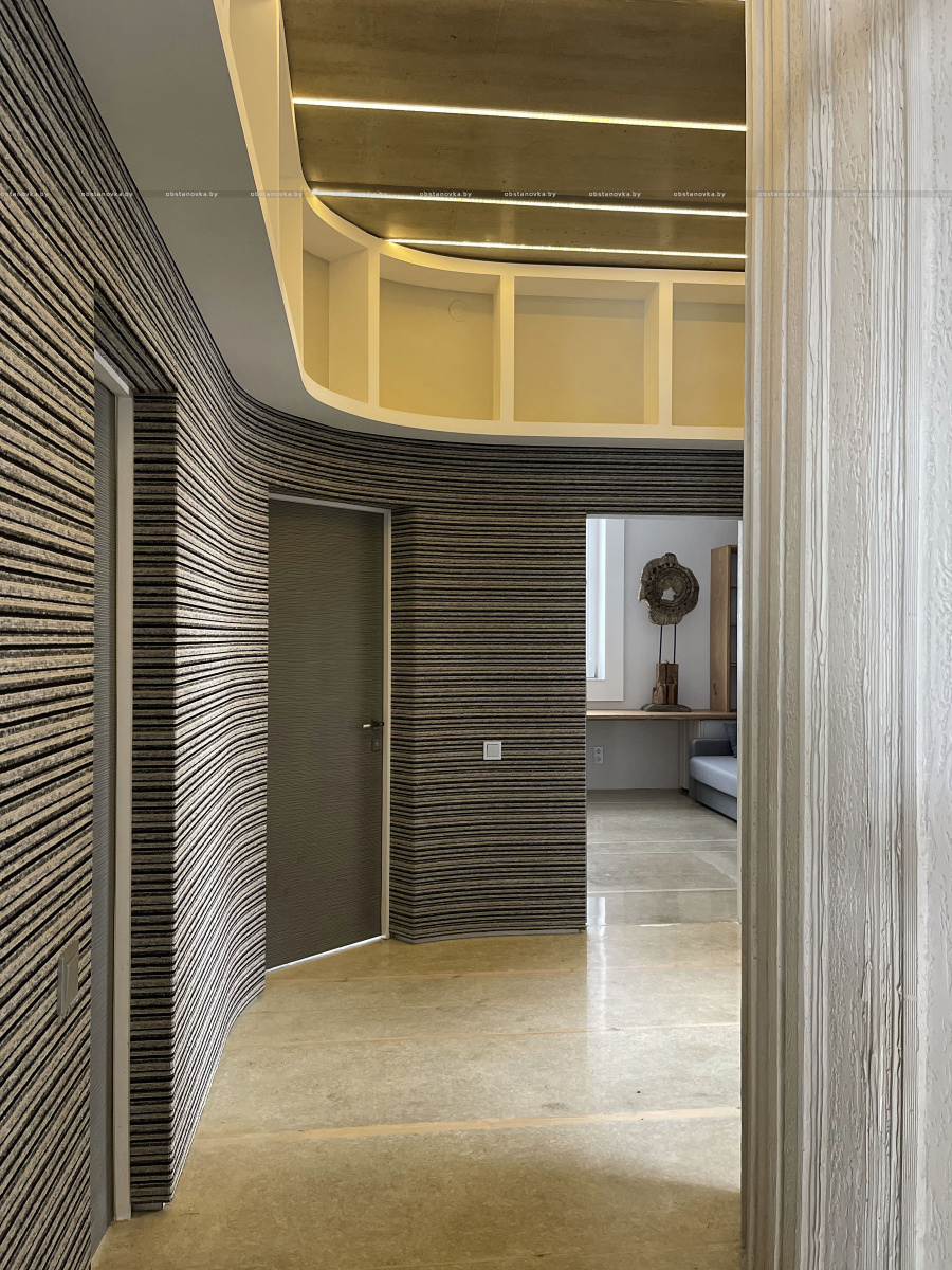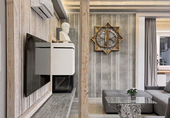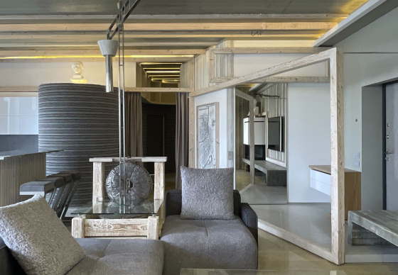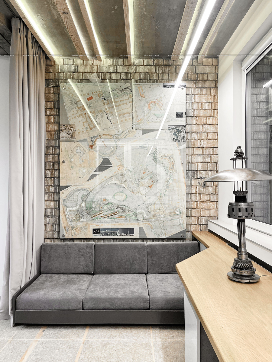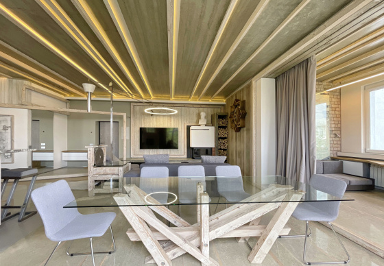 Пэўна што яны перамяжуюцца з сучасным аздабленнем. Столі кватэры выкананы з памытых бетонных пліт і зафіксаваны матавай грунтоўкай. Шчыліны паміж плітамі зачынены прадоўгімі ліхтарамі з дрэва і светадзіодаў, якія нагадваюць звыклыя бэлькі.