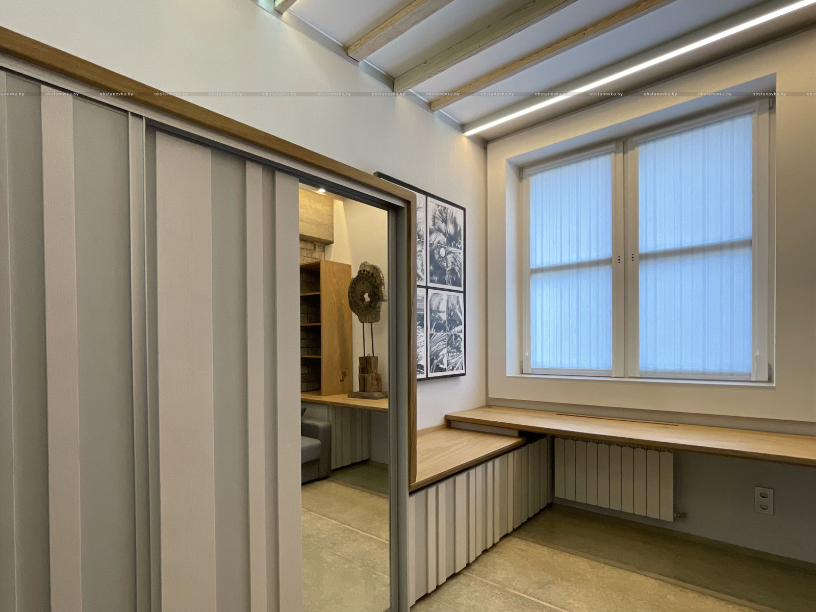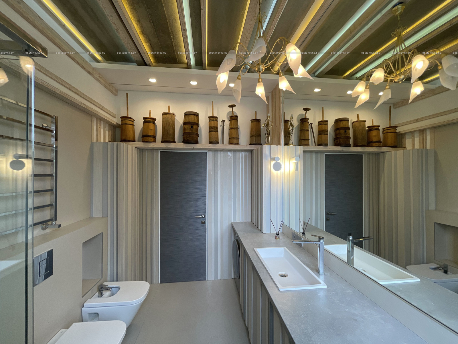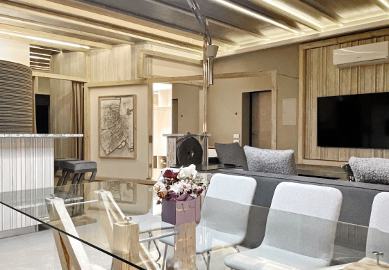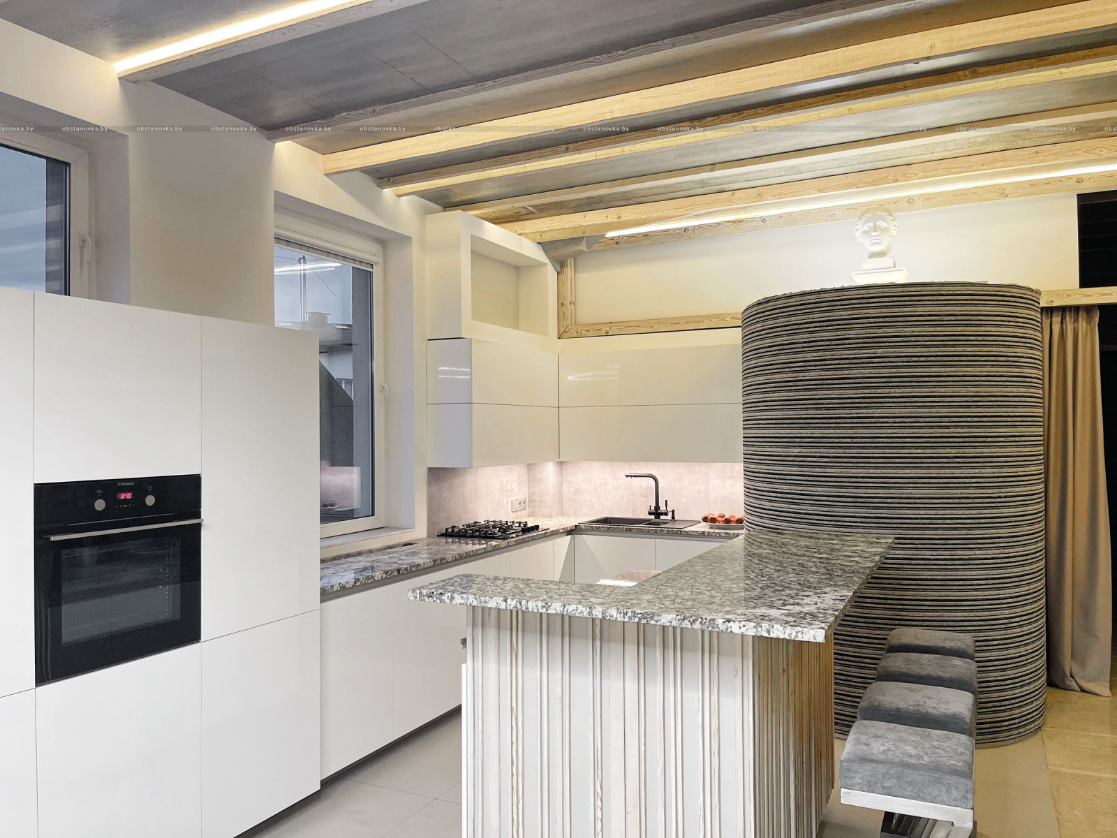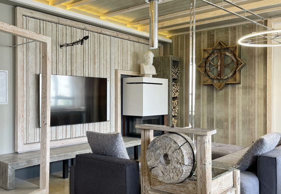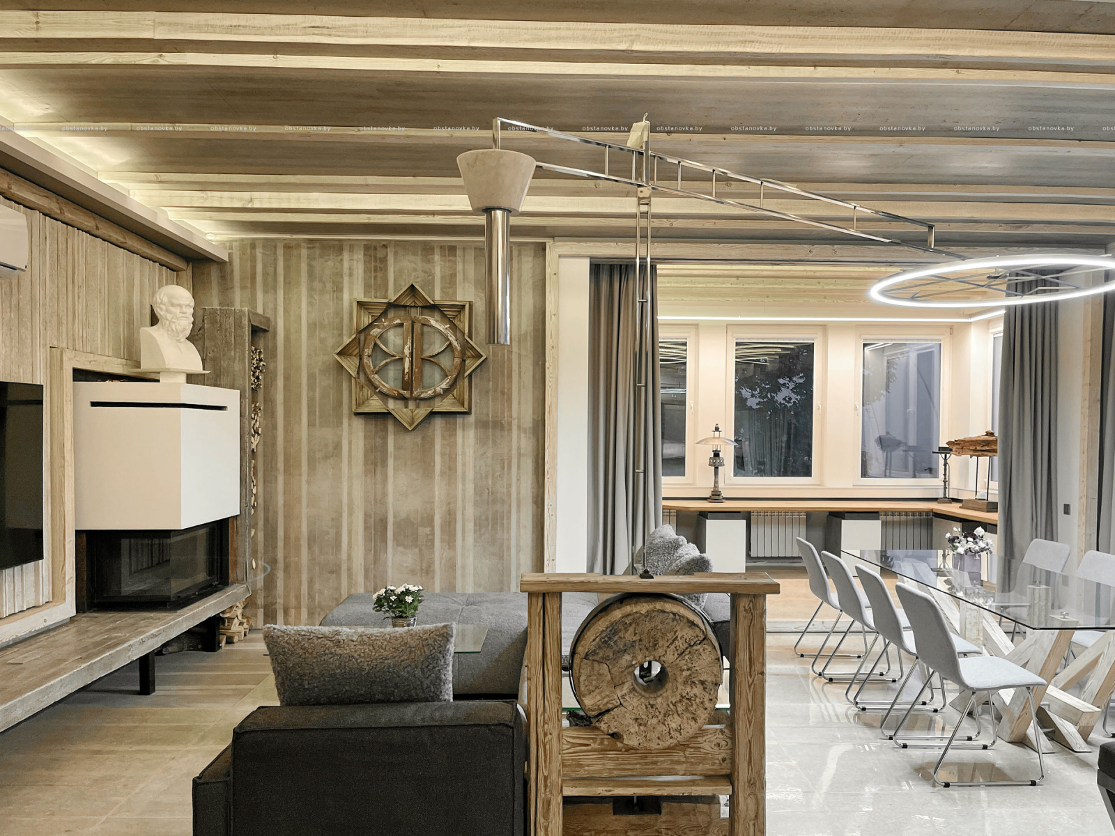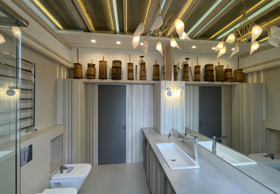 Пэўна што яны перамяжуюцца з сучасным аздабленнем. Столі кватэры выкананы з памытых бетонных пліт і зафіксаваны матавай грунтоўкай. Шчыліны паміж плітамі зачынены прадоўгімі ліхтарамі з дрэва і светадзіодаў, якія нагадваюць звыклыя бэлькі.