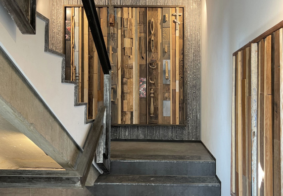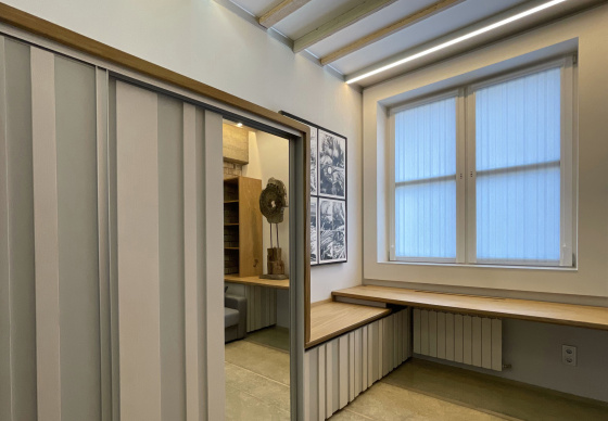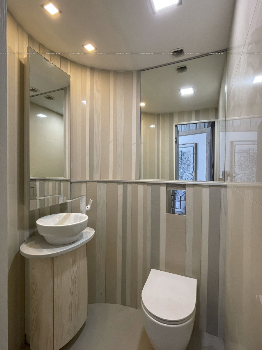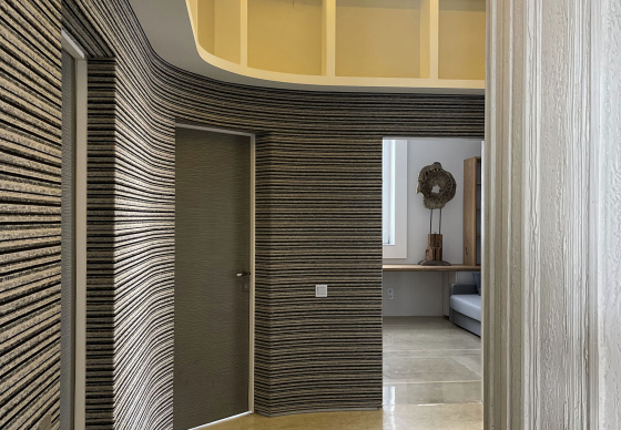 Агульны эстэтычны накірунак прадыктавалі адпадкі пліткі, якія засталіся з іншай будоўлі. Калі іх паклалі, атрымаўся «лес», нагадваючы штрыхкод гандлёвых цэтлікаў. Такі просты карунак пераскочыў на мэблю і прадыктаваў агульную стылістыку – «мы ў лесе». Астатняе аздабленне толькі падтрымлівае гэты шлях. Панэлі шафаў выкананы са звычайнага ДСП «пеплу» 18 мм, на якія прымацавалі палоскі 10 мм драўлянай тэкстуры.