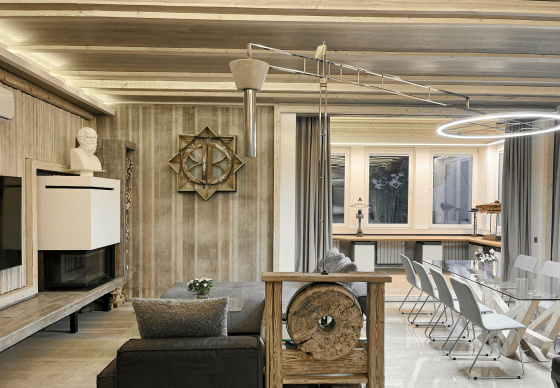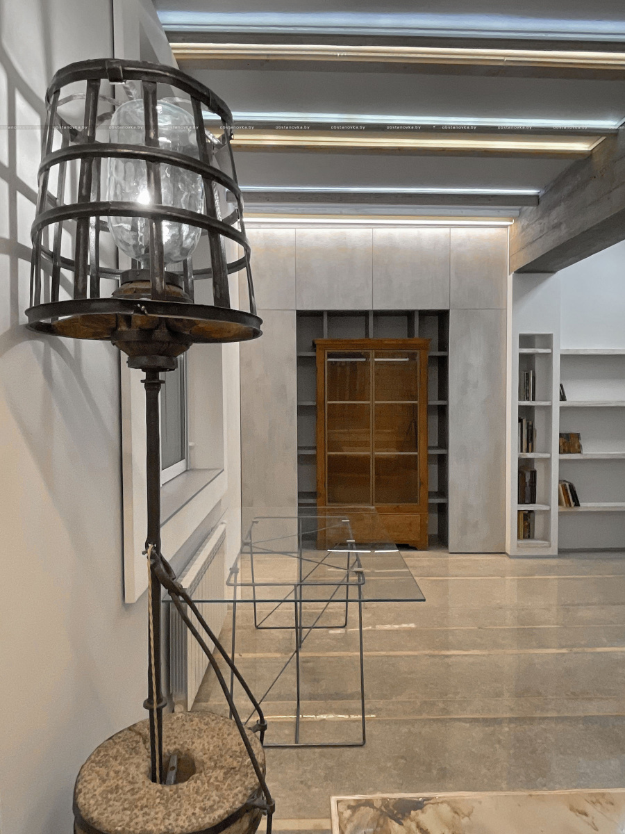 Галоўны аб’ект інтэр’еру – жырандоль-таршэр (R = 3,5 м) выкананы з палiраванага металу. Рухаючыся, ён асвятляе тры зоны: гасцёўны бар, стол, канапу — залежна ад патрэбы. Падмуркам для яго з’явіўся аўтэнтычны рэстаўрыраваны жоран прадзеда замоўцы. Яго стварыў дзед Аляксей (1920 г.), за якім асабіста была арганізавана экспедыцыя ў амаль знішчаную вёску.