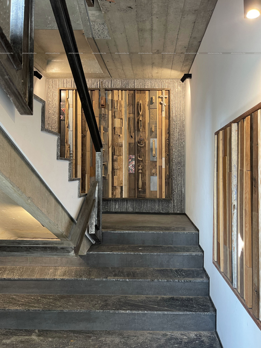 Падлога эксперыментальная. Замоўца жадаў атрымаць уражанне, быццам «ходзіш па сене». Да сцяжкі прымацавалі вельмі танныя лісты грынборду, зашпаклявалі і зрабілі «наліўную празрыстую падлогу» з эпаксіднага лаку.