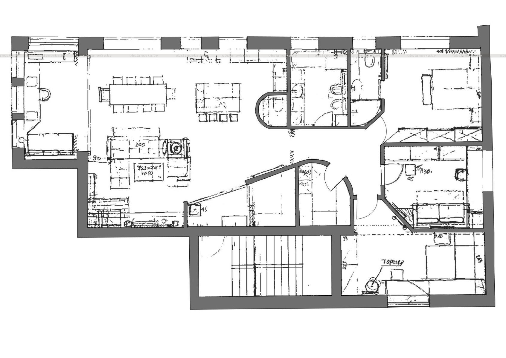 Асобна стаячая мэбля выканана штучна, і пра яе асобны распавяд. Такім чынам, галоўны шкляны стол (яго канструкцыя) выкананы з разабраных лясоў пасля тынкавання муроў. Нішто не павінна прапасці. Падстолле зроблена будаўнікамі на месцы і пакрыта шклом.