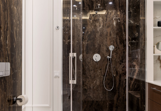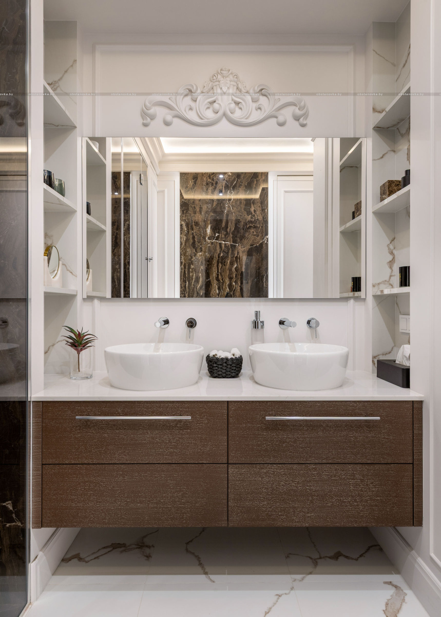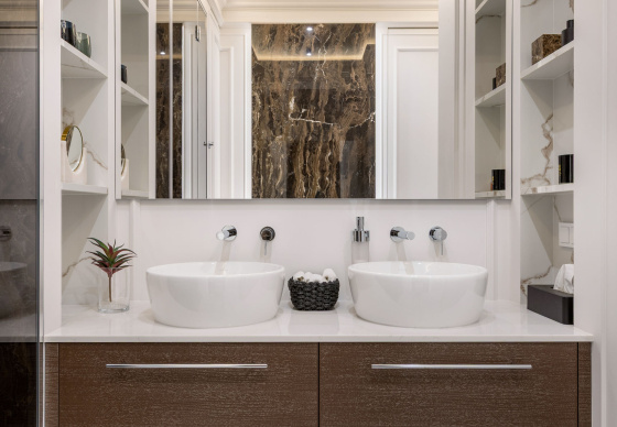 Санузел задуман как самостоятельный интерьерный акцент: просторная душевая, две раковины, продуманная система хранения.