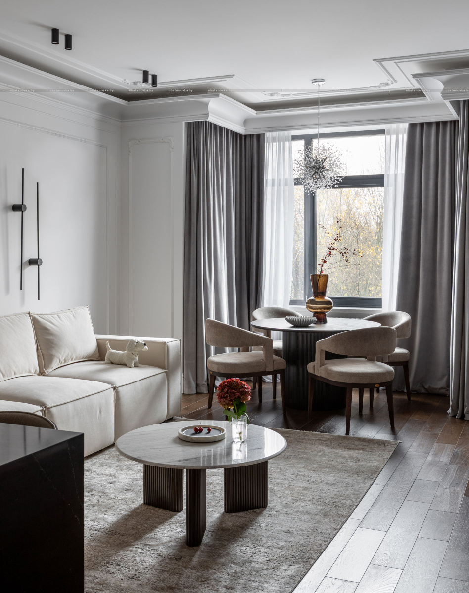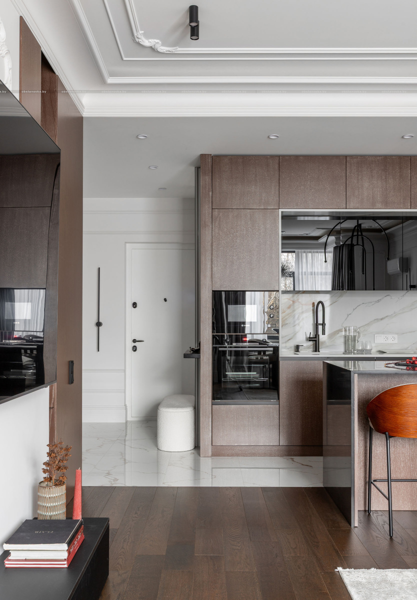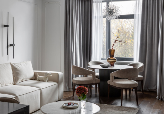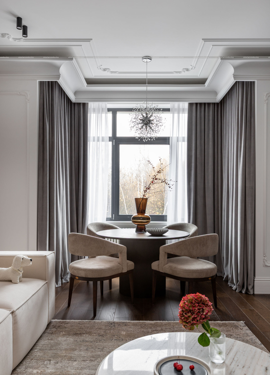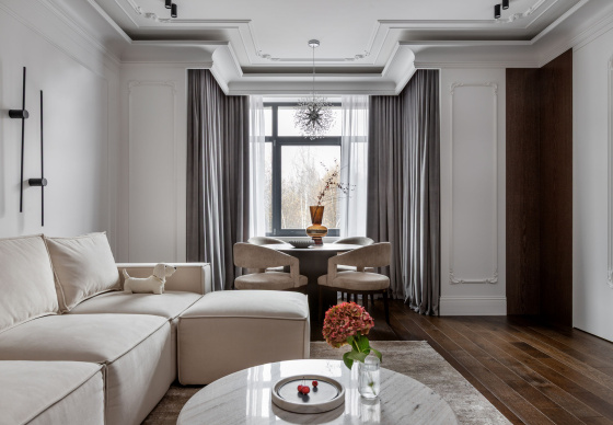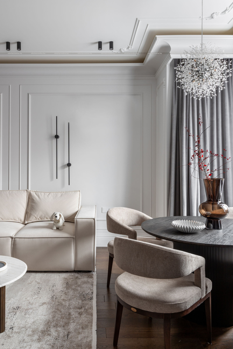 Интерьер выполнен в стилистике современной классики. Цветовая палитра построена на благородных оттенках серо-бежевой гаммы и дополнена тёплым акцентом натурального шпона. Пространство получилось элегантным, женственным и вневременным — отражением характера своей хозяйки.