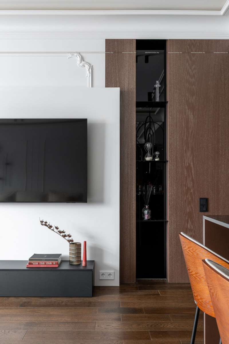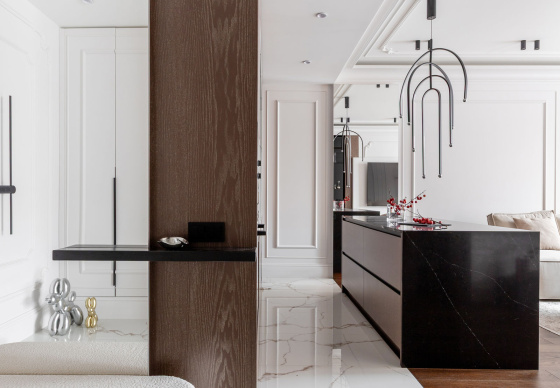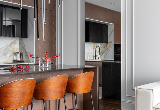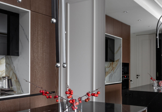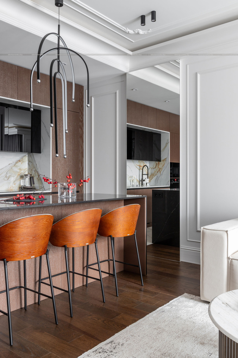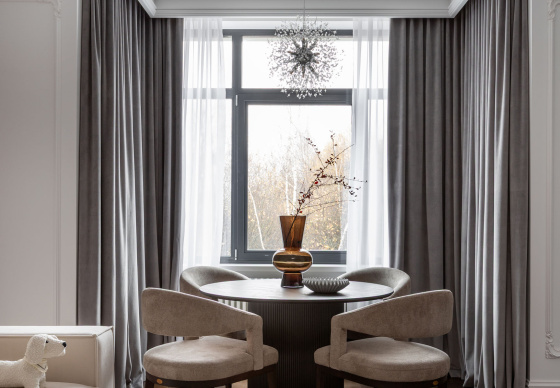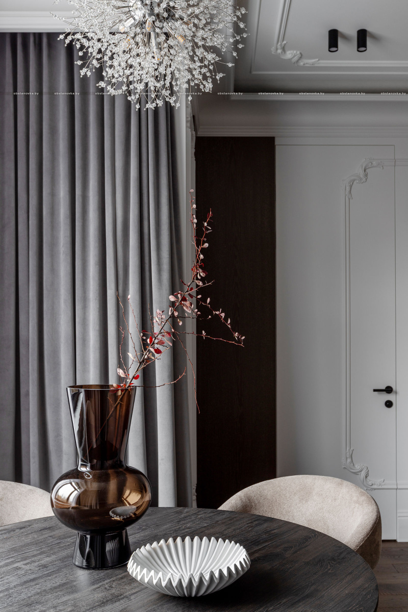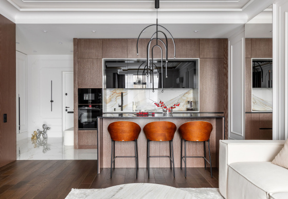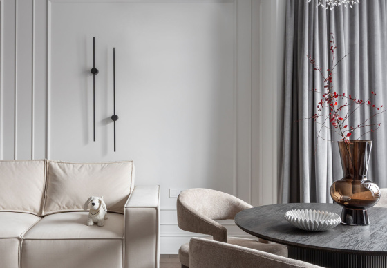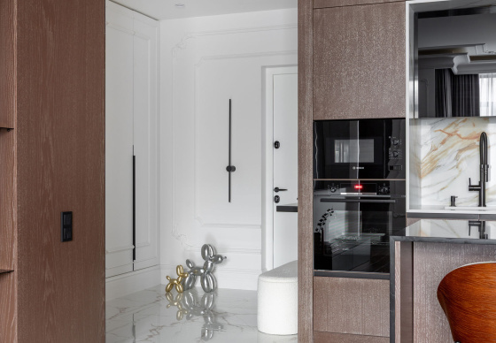 Интерьер выполнен в стилистике современной классики. Цветовая палитра построена на благородных оттенках серо-бежевой гаммы и дополнена тёплым акцентом натурального шпона. Пространство получилось элегантным, женственным и вневременным — отражением характера своей хозяйки.