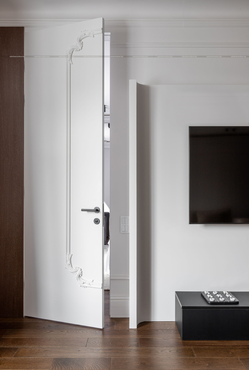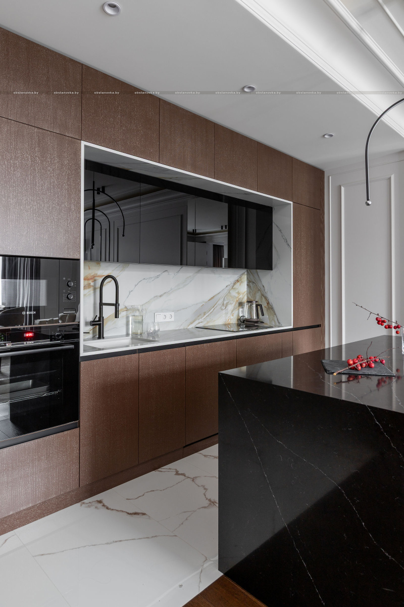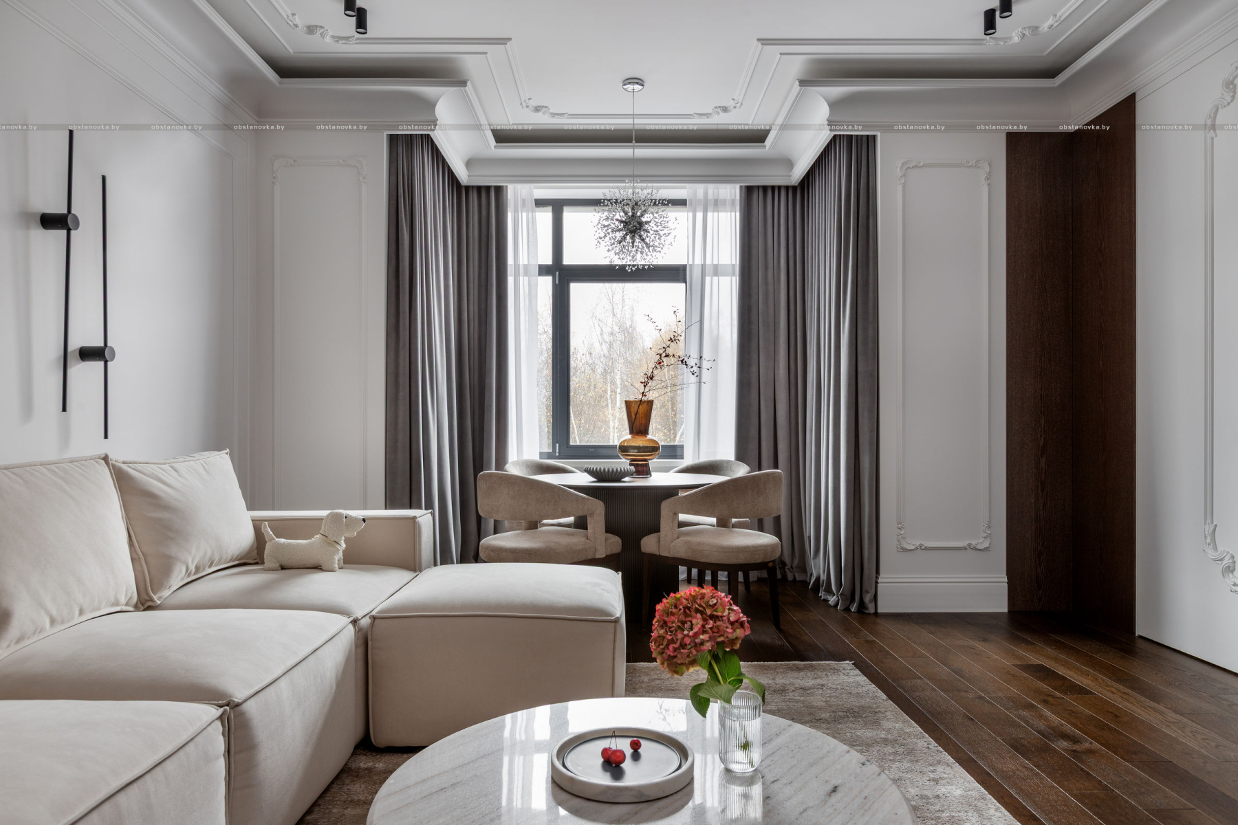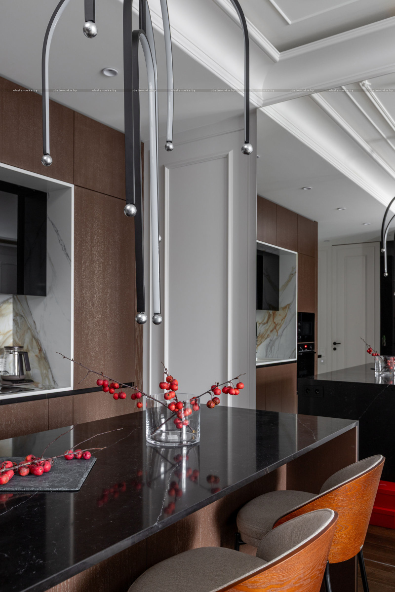 Интерьер выполнен в стилистике современной классики. Цветовая палитра построена на благородных оттенках серо-бежевой гаммы и дополнена тёплым акцентом натурального шпона. Пространство получилось элегантным, женственным и вневременным — отражением характера своей хозяйки.