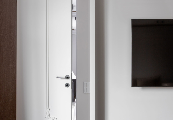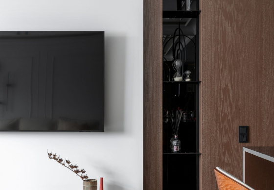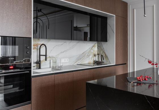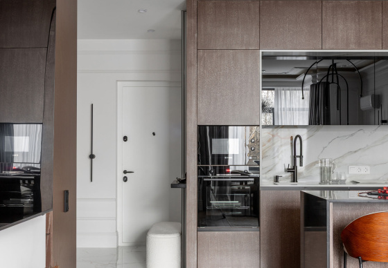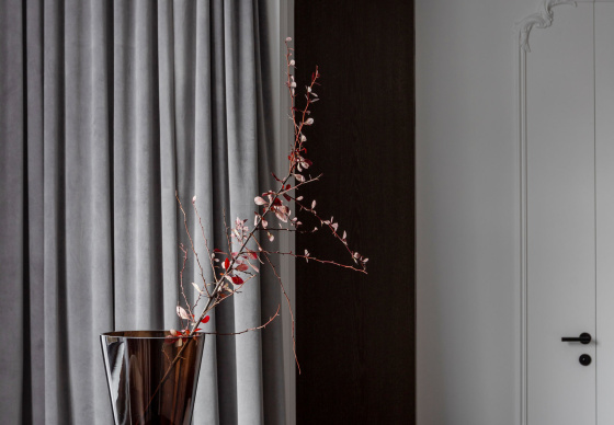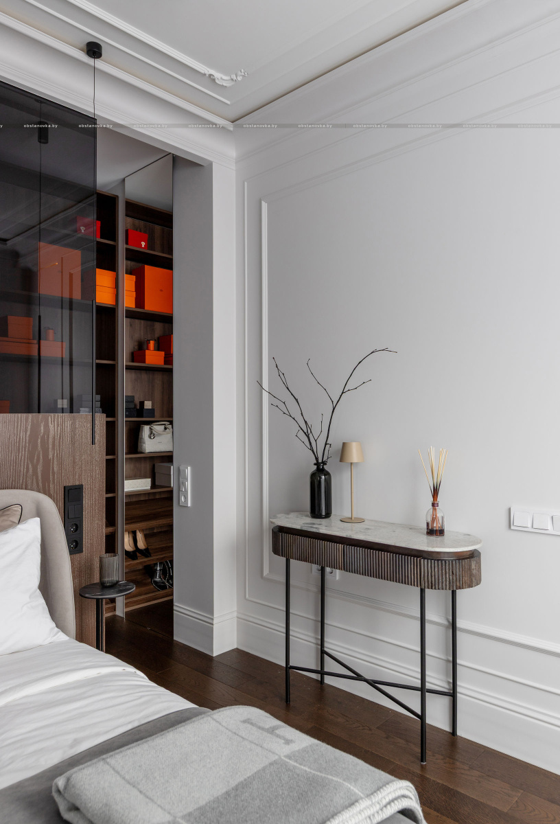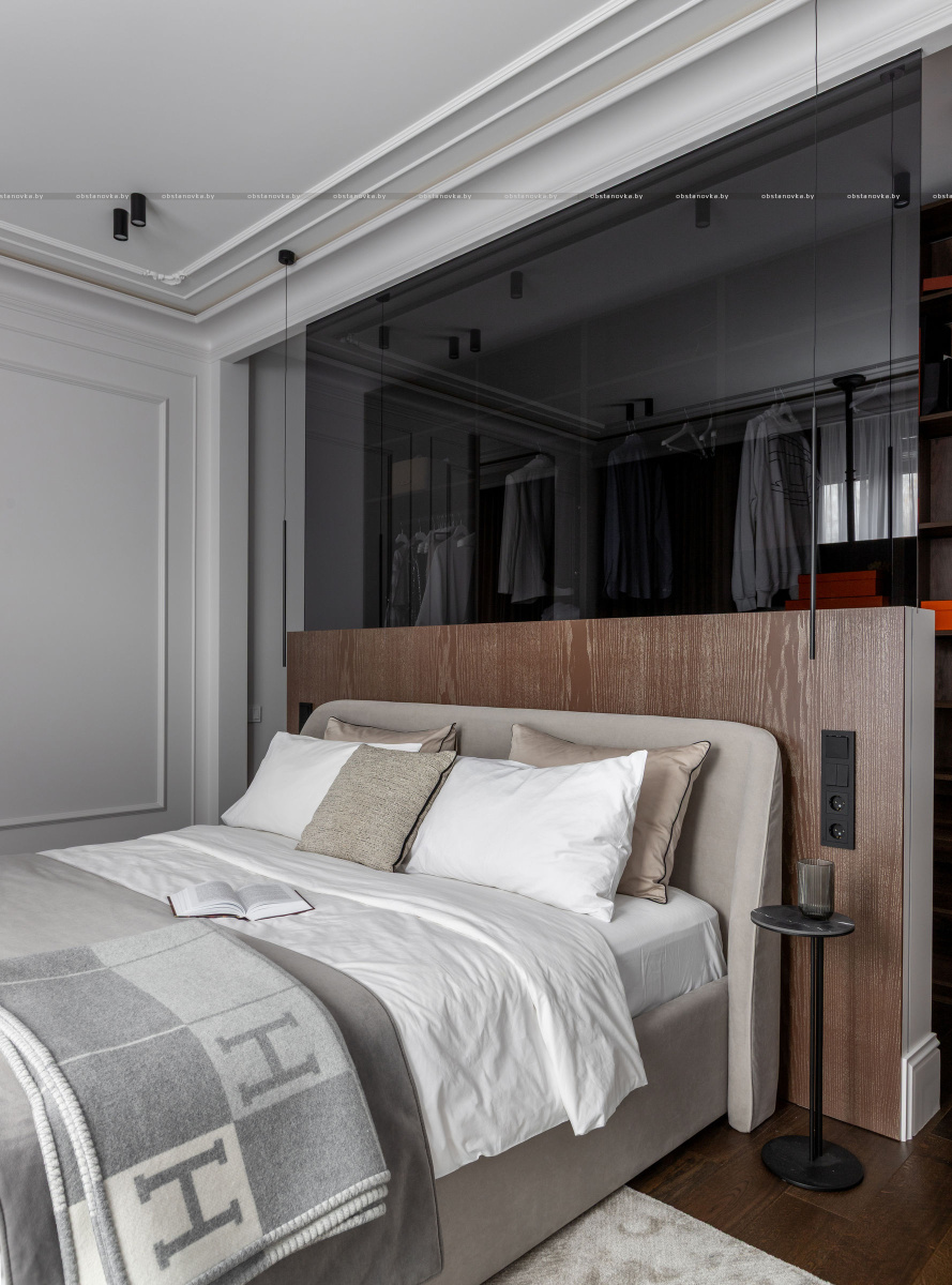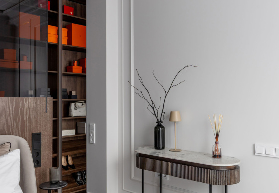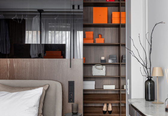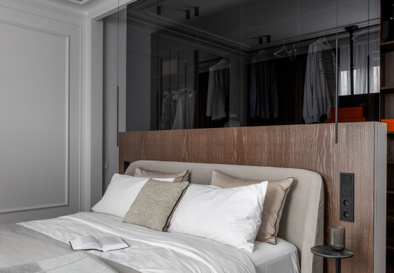 Спальная зона спроектирована как приватное, камерное пространство. Особый акцент — эффектная гардеробная, отделённая от спальни чёрным стеклом, которое добавляет интерьеру графичности и глубины.