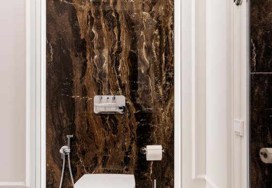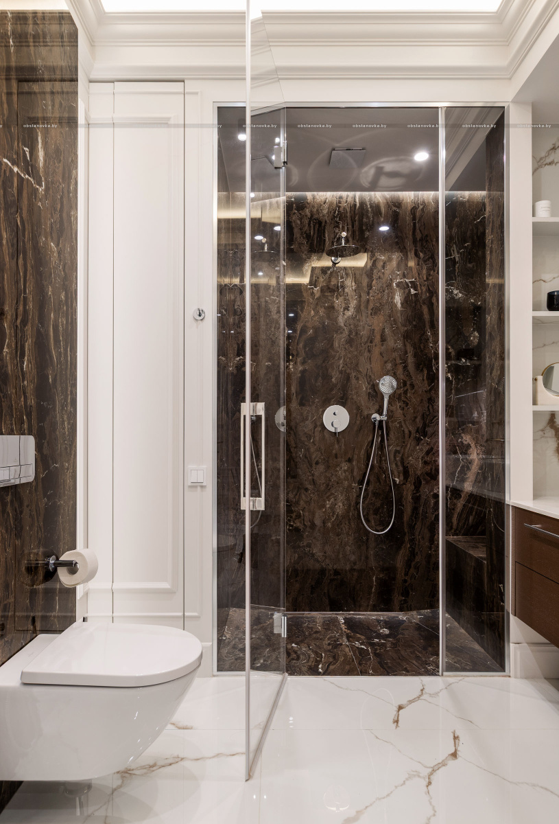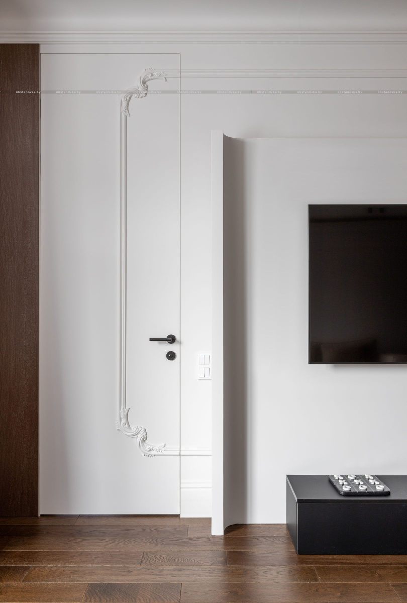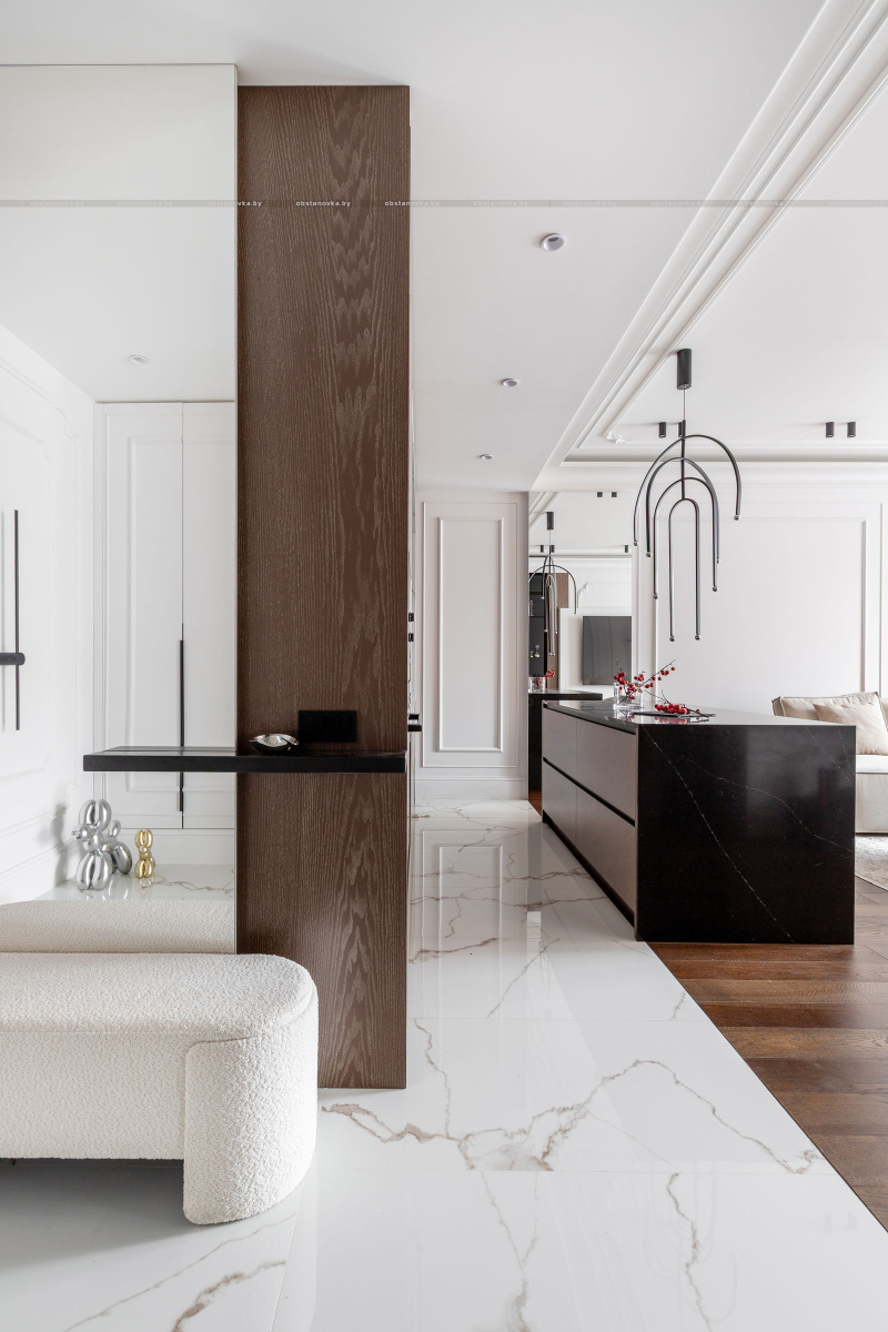 Здесь использована крупноформатная плитка в сочетании с выразительной лепниной, что создаёт эффектный диалог современной эстетики и классических деталей.