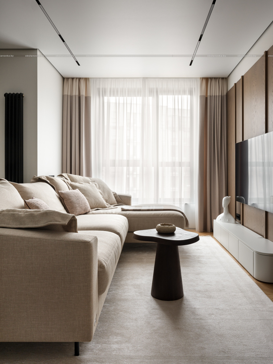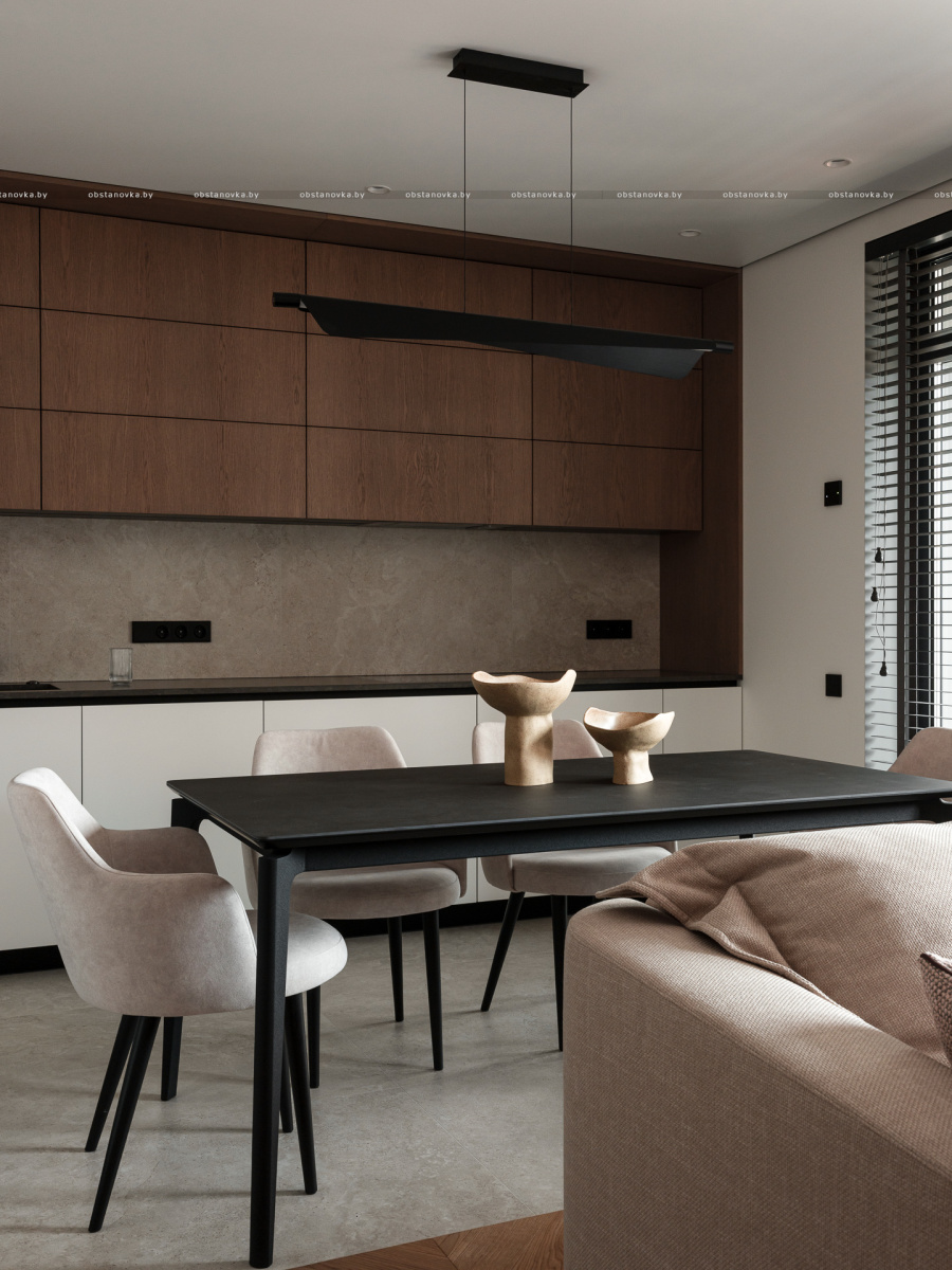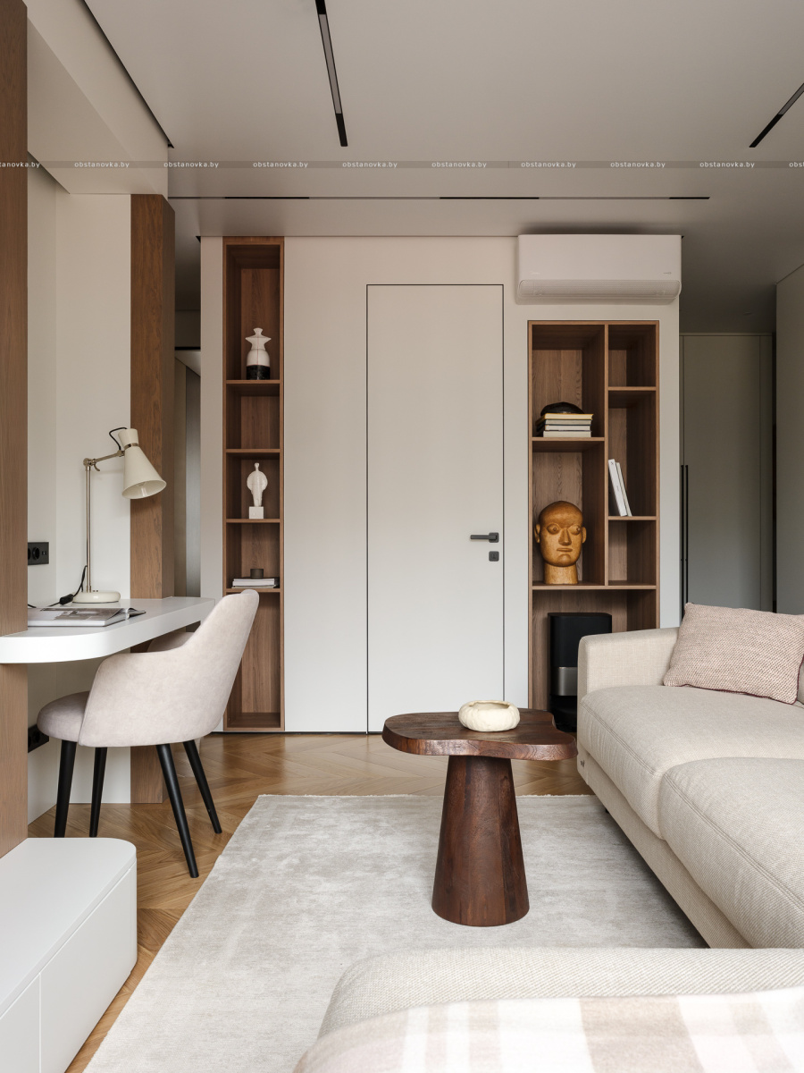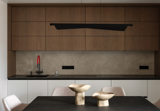 При этом в интерьере хотелось видеть умеренный контраст и избежать скуки и излишней простоты. Важно было сохранить баланс между сдержанностью и выразительностью, чтобы пространство оставалось живым и интересным.