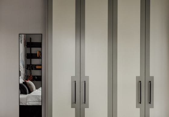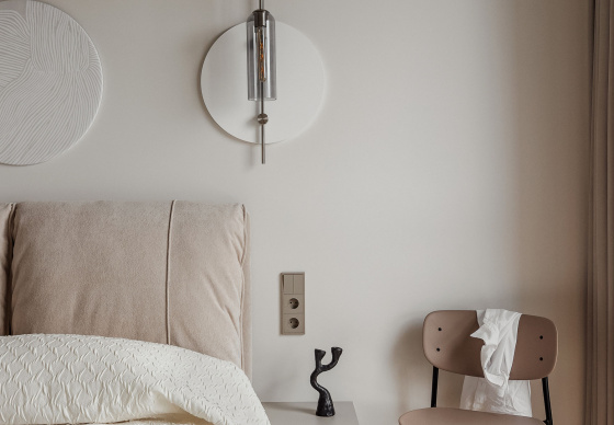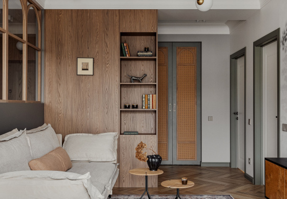 Интерьер разрабатывался для молодой семьи с перспективой на появление детей, поэтому нет явной детской комнаты — обе спальни можно равно использовать по своим потребностям. Также интересный момент — это круговая планировка основной зоны, позволяющая менять транзит по любому направлению.