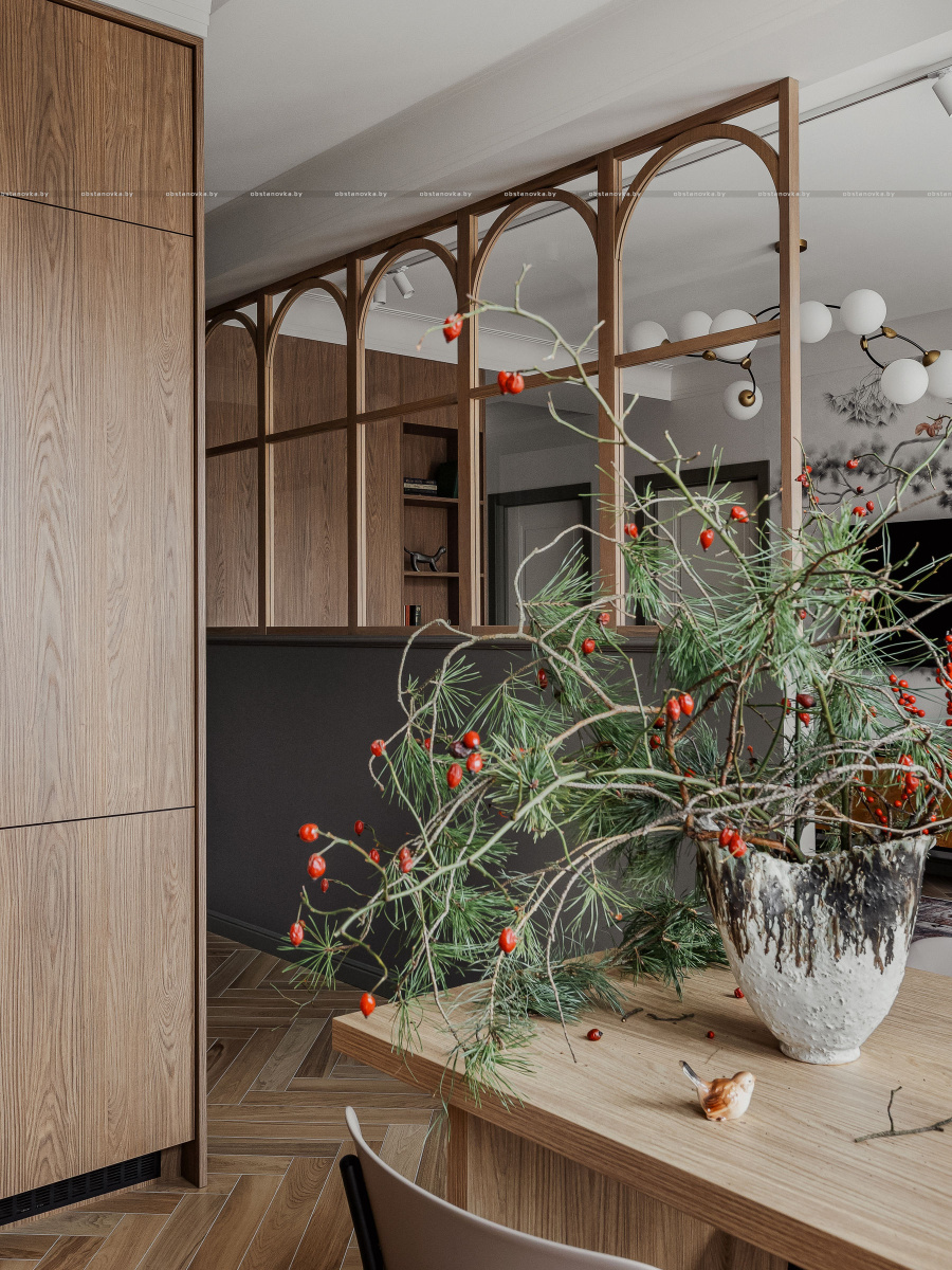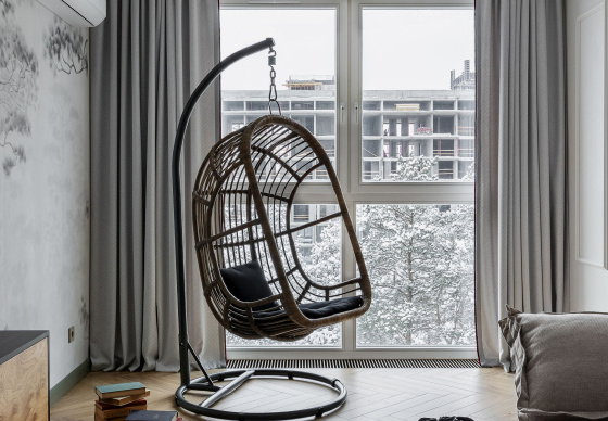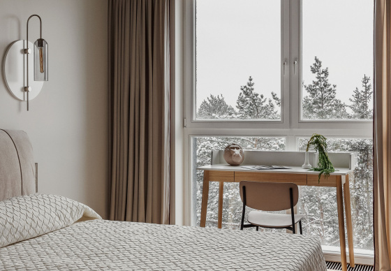Интерьер полностью готов к комфортному проживанию. И заказчики получили ключи от готовой квартиры на верхушке леса под самый Новый год, наслаждаясь видами заснеженного зимнего леса из окна своего гнёздышка.