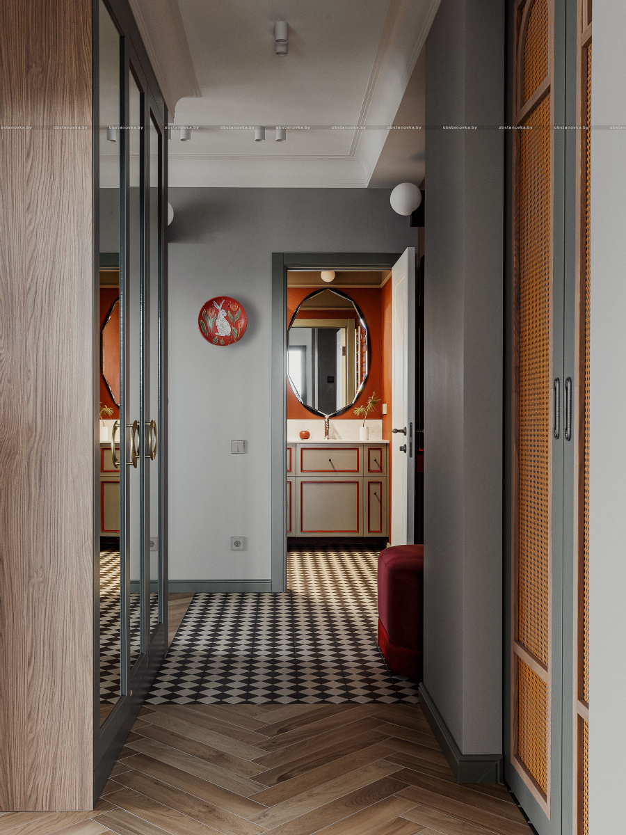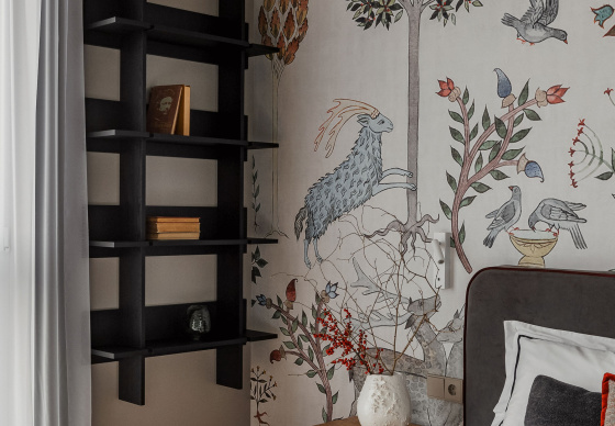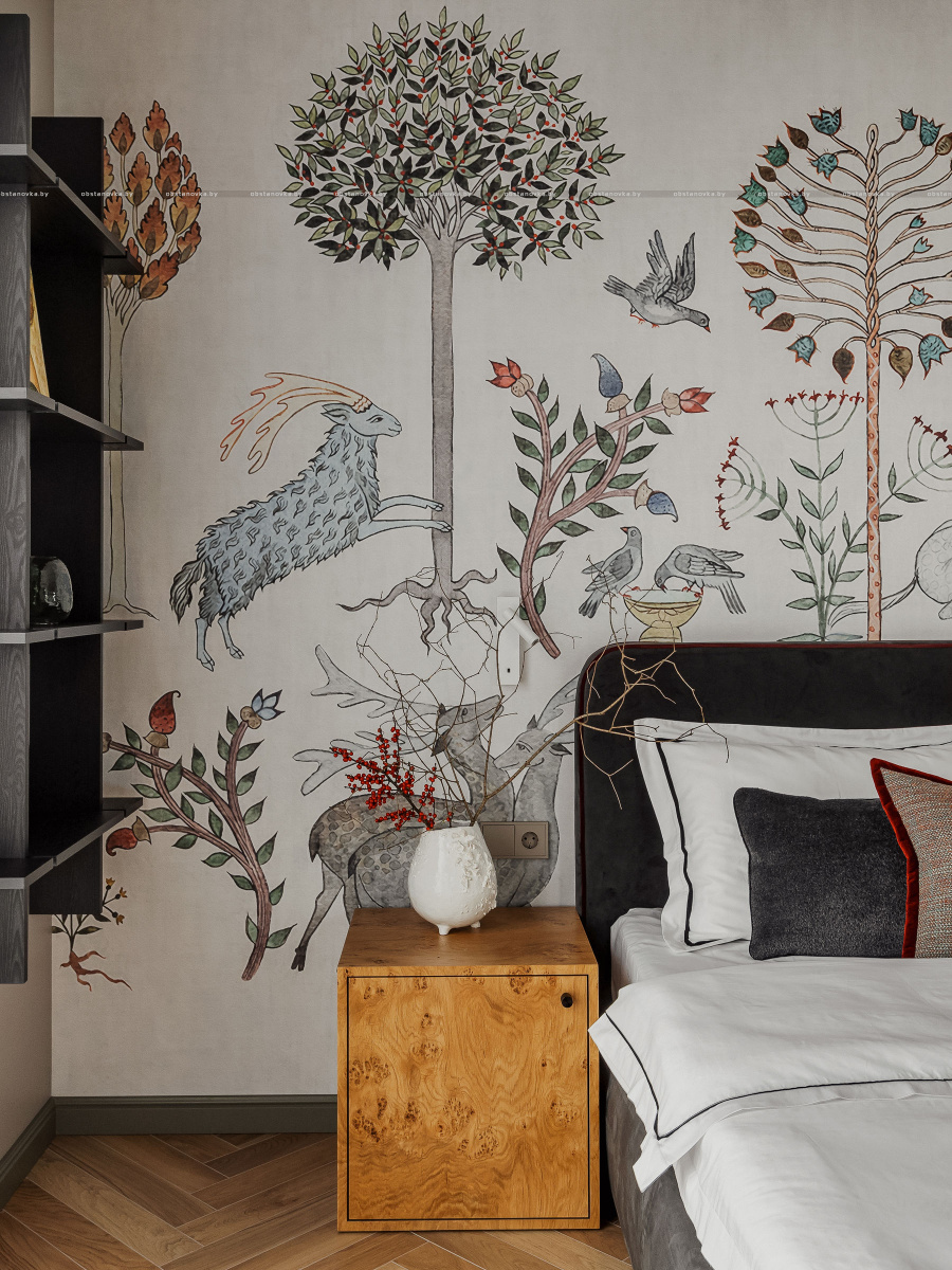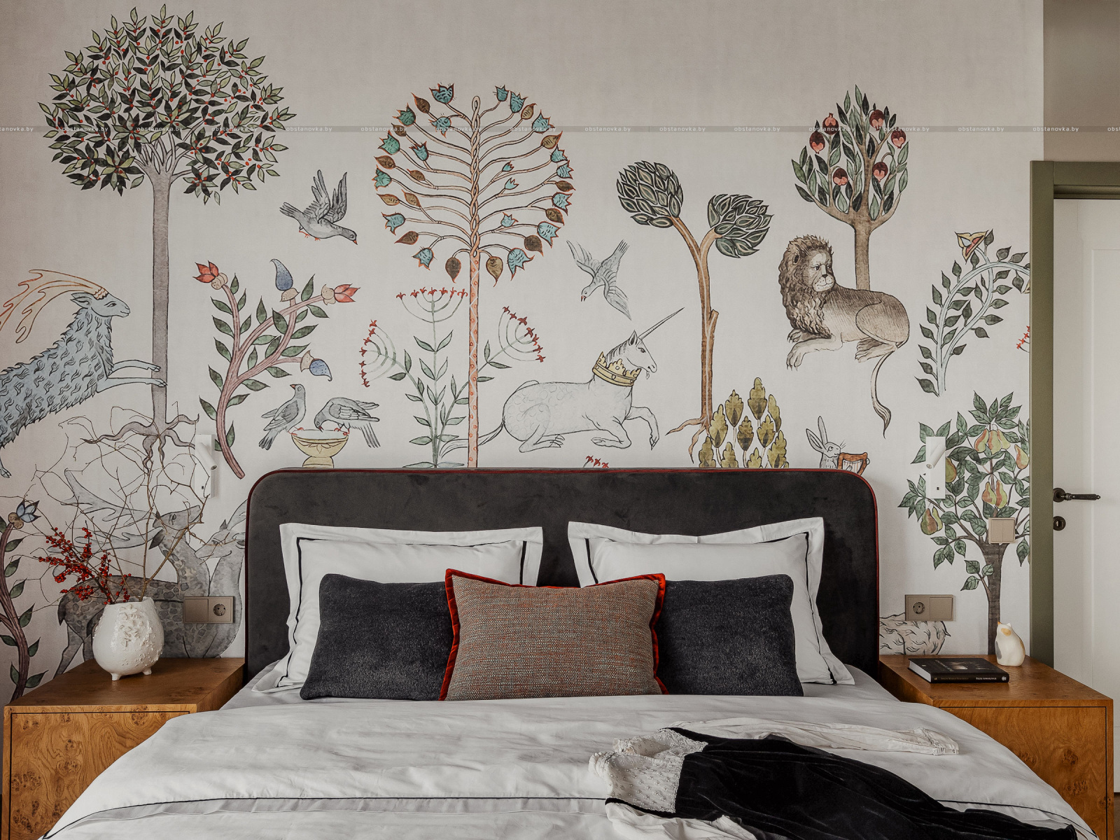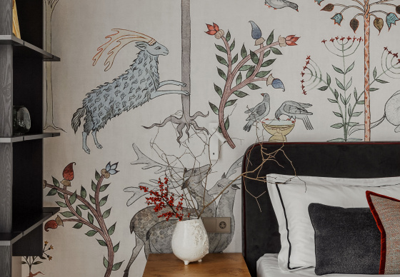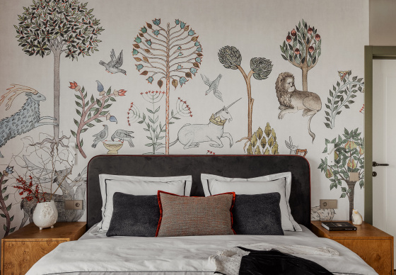 Квартира наполнена отсылками к парковым аллеям и садовым аркам, светильникам с плафонами в виде уличных фонарей и сказочным животным из заколдованного леса, поселившимся в спальне, а также к плитке в шашечку, напоминающей о мужчинах, играющих в шахматы в парке.